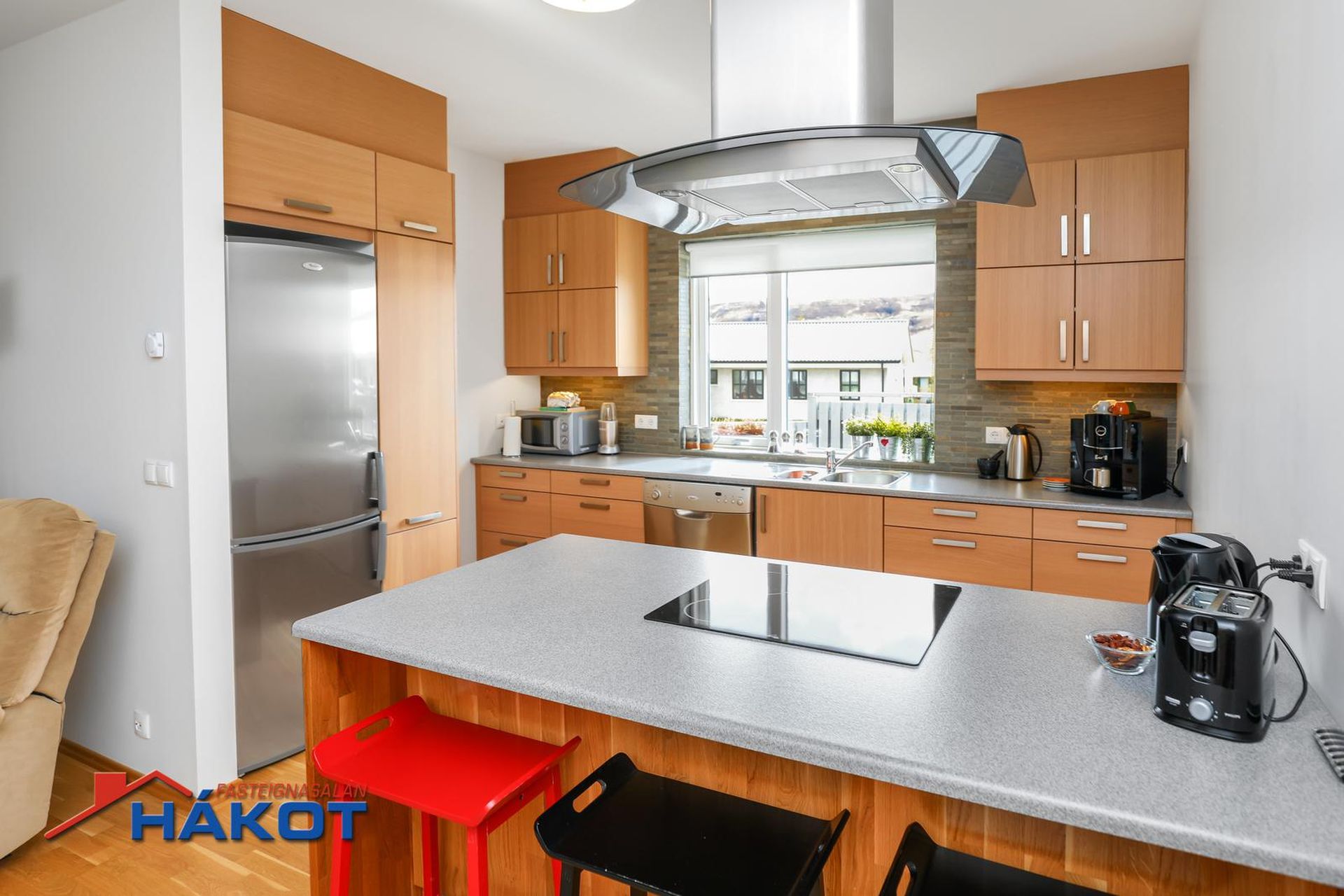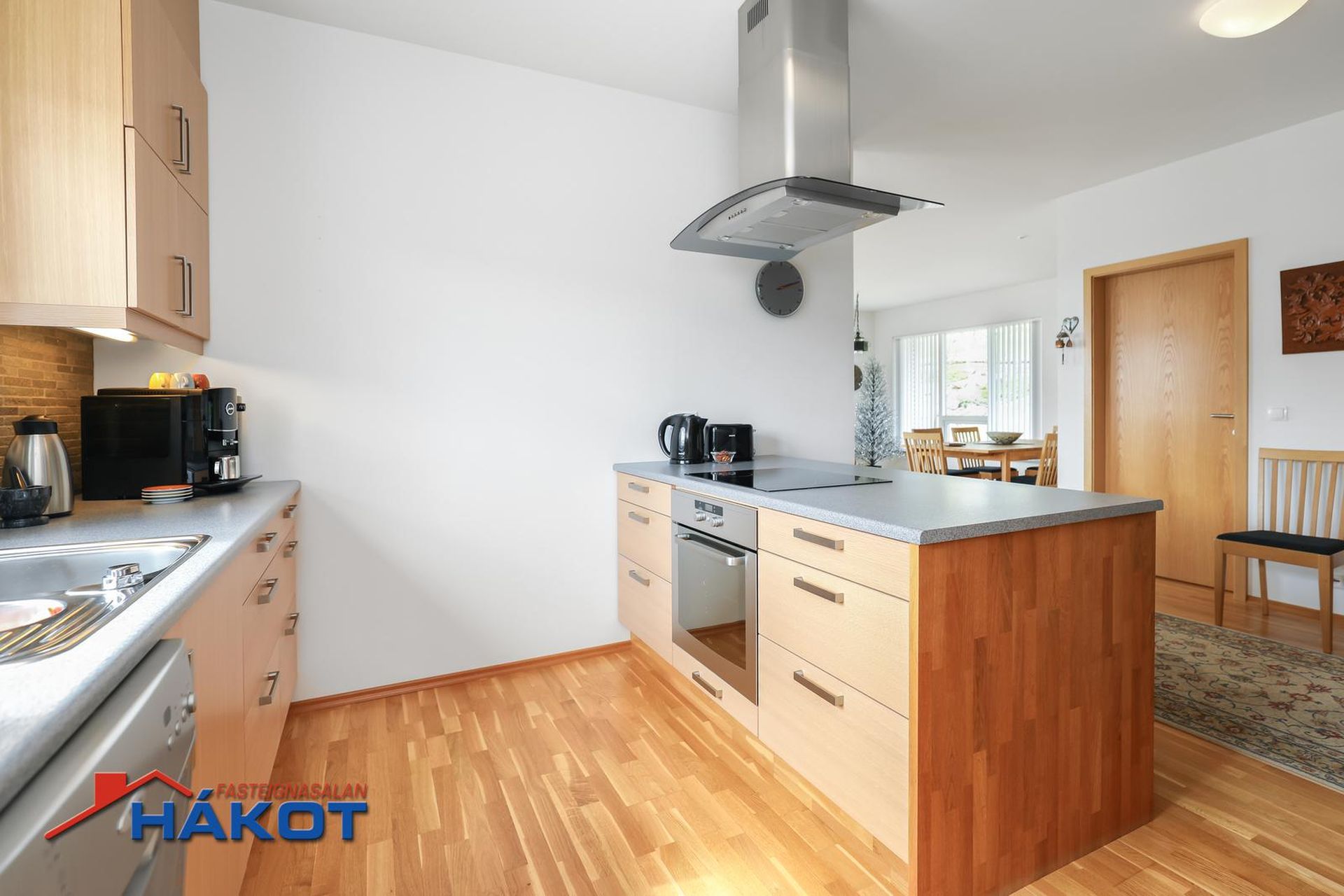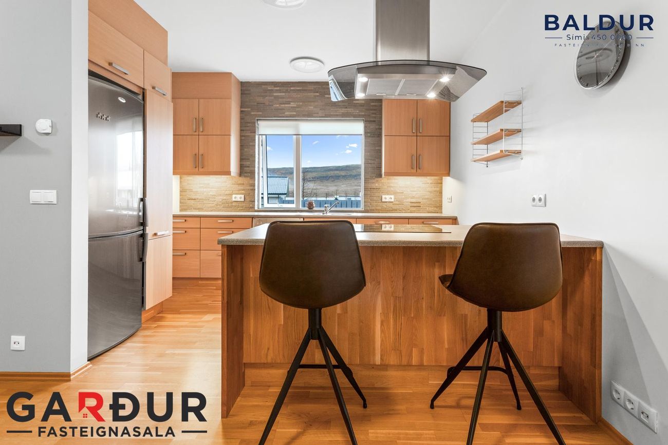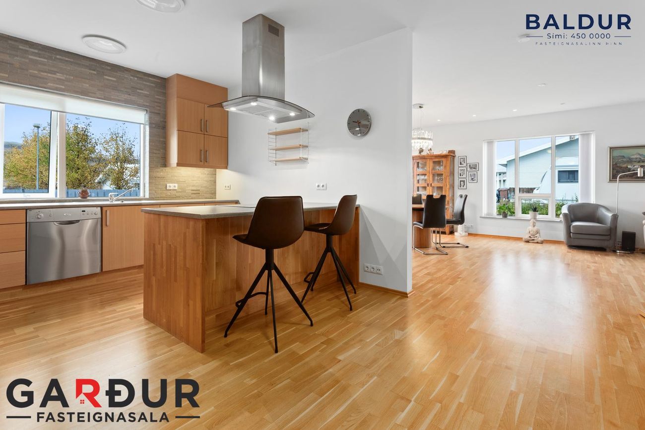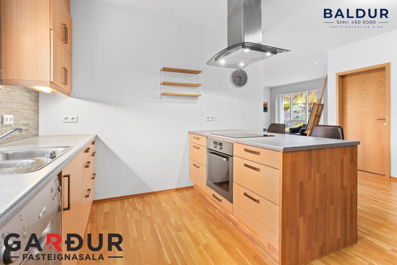 Eldhús: Parket á gólfi. Ljós viðarinnrétting og flísar milli efri og neðri skápa. Ofn, helluborð, háfur og uppþvottavél. Eldhúsið er opið að holi og býður upp á góða vinnuaðstöðu.
