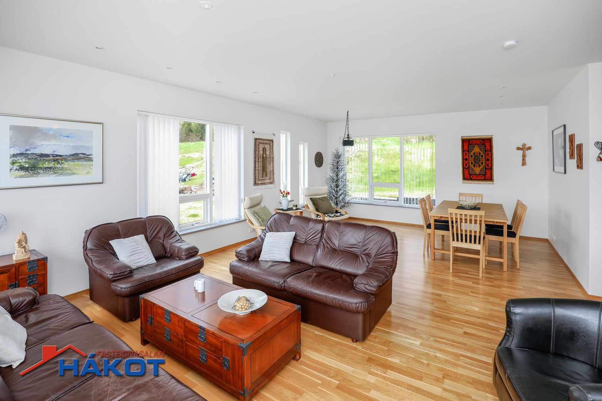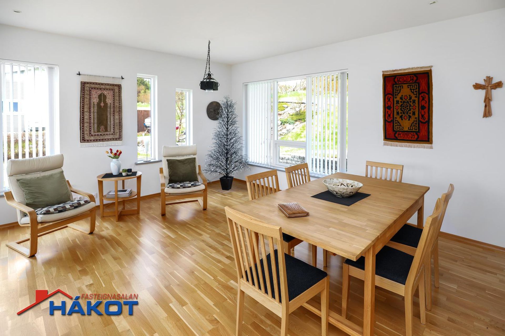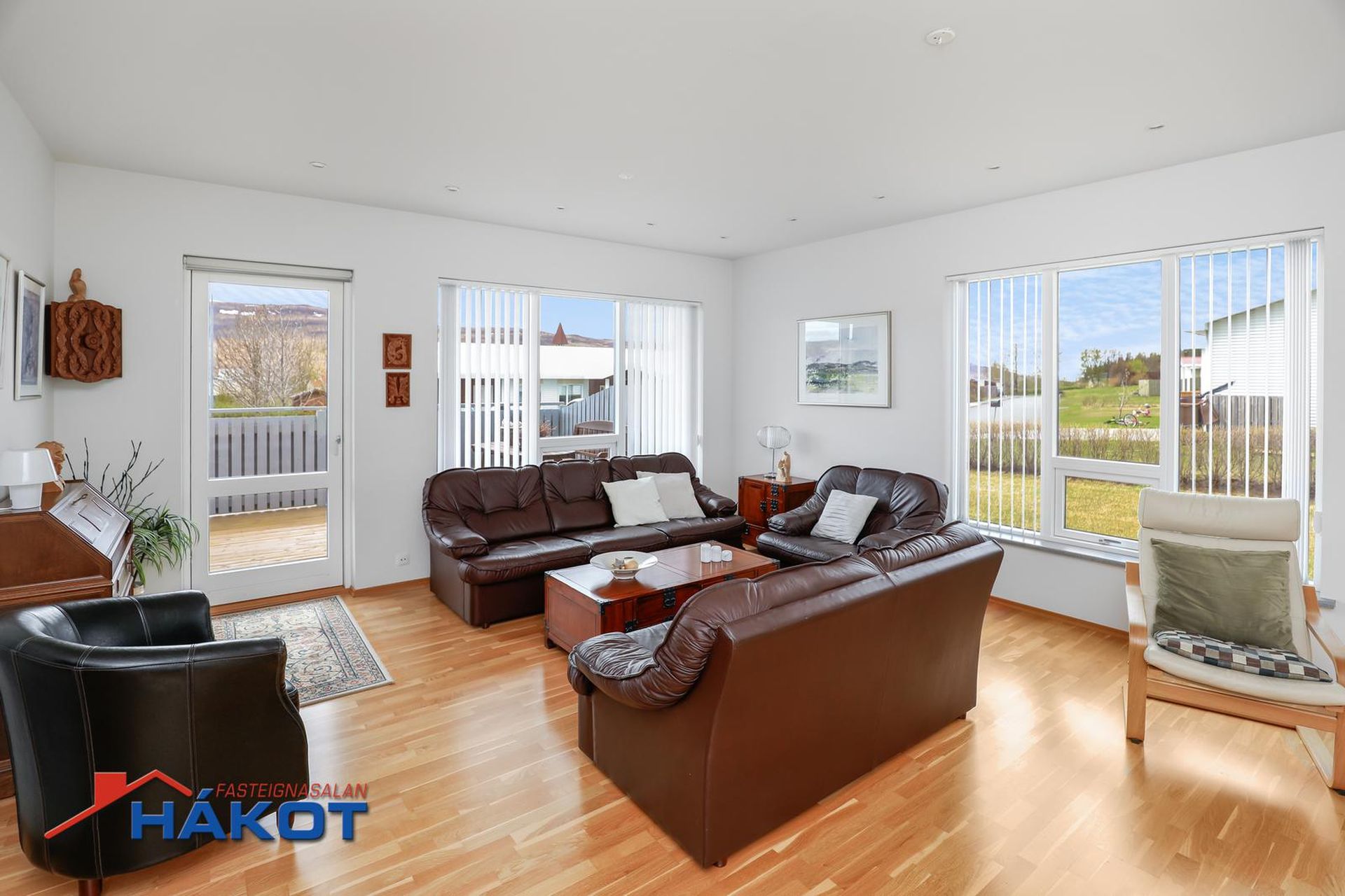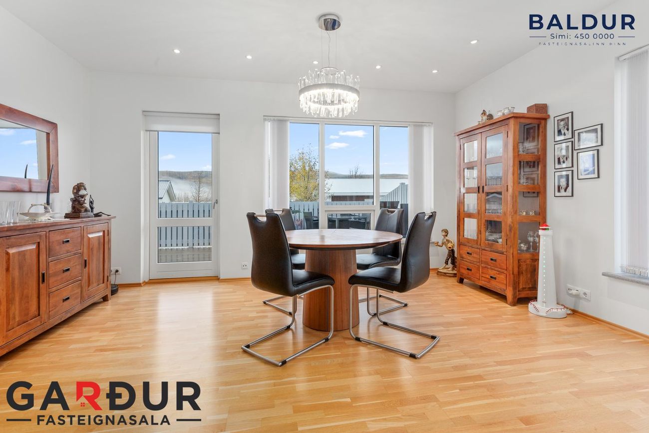 Stofa/borðstofa: Rúmgott og bjart rými með parketi á gólfi og glugga í þrjár áttir. Útgengt er út á pall sem snýr í suður og er með sjólvegg.