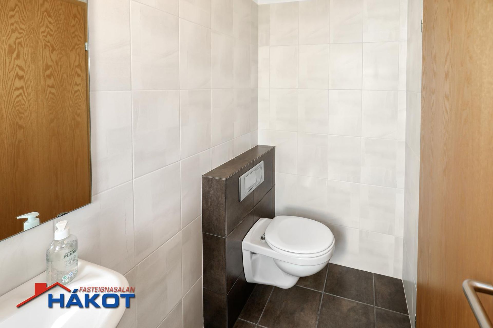 Gestasnyrting: Flísalögð gólf og veggir. Upphengt salerni. Aðgengilegt úr forstofu.