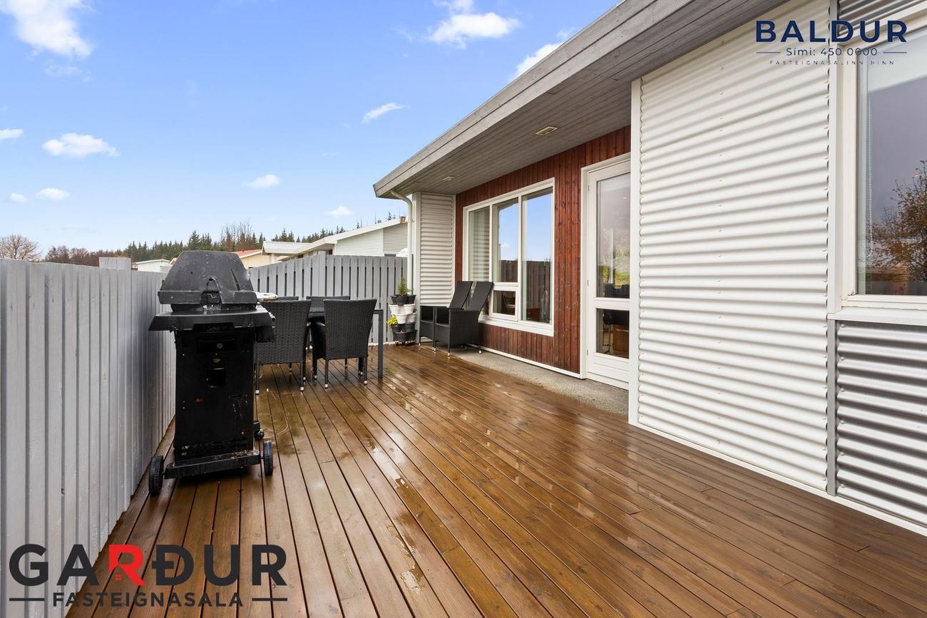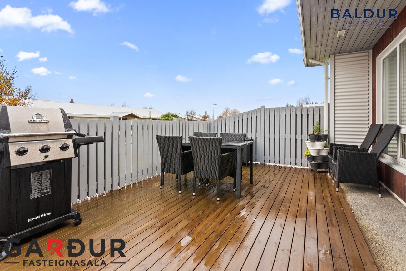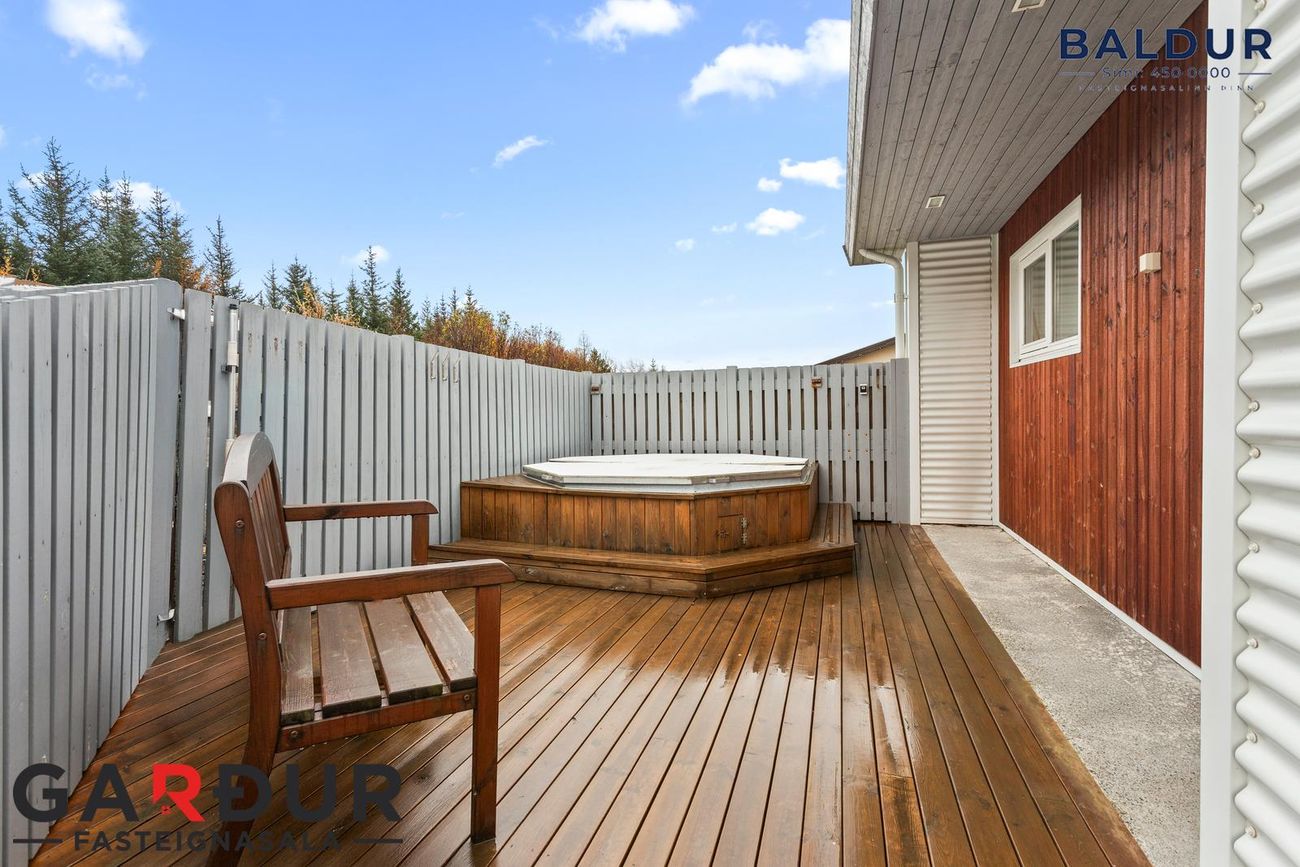 fjögur svefnherbergi, hol/sjónvarpsrými, eldhús, stofu/borðstofu, baðherbergi, þvottahús og innbyggðan bílskúr. Frá stofu og baðherbergi er gengið út á skjólgóða verönd á baklóð þar sem heitur pottur er staðsettur. Um er að ræða mjög fallegt fjölskylduhús með góðri aðstöðu og notalegri aðkomu.