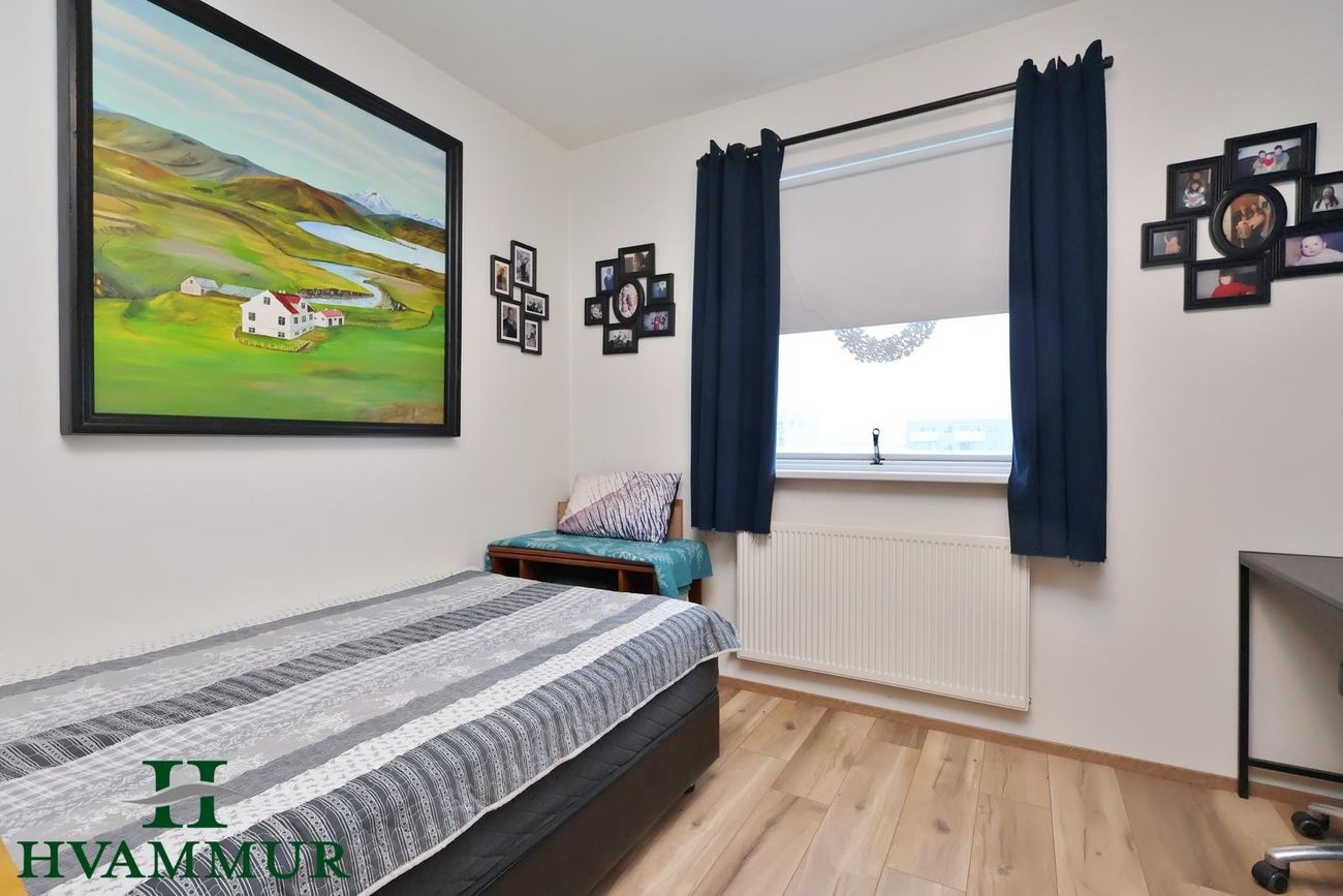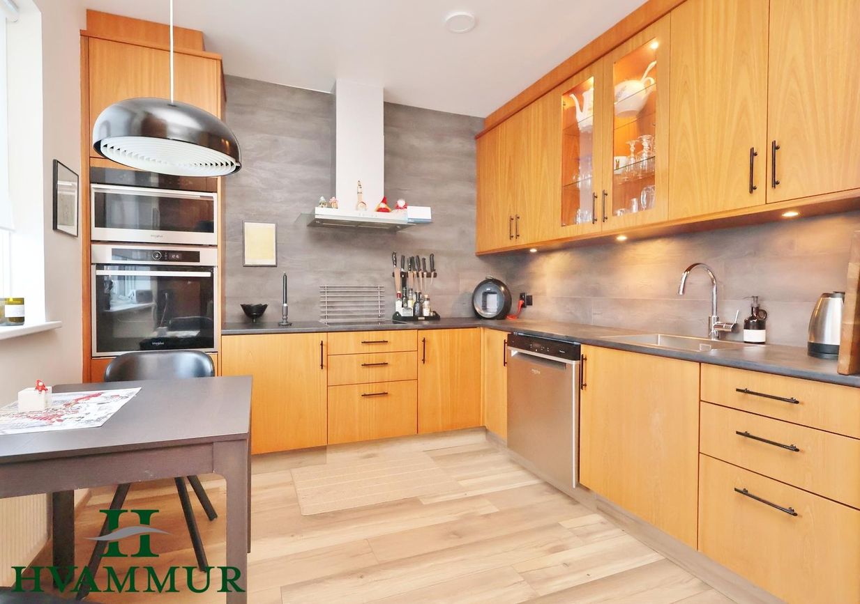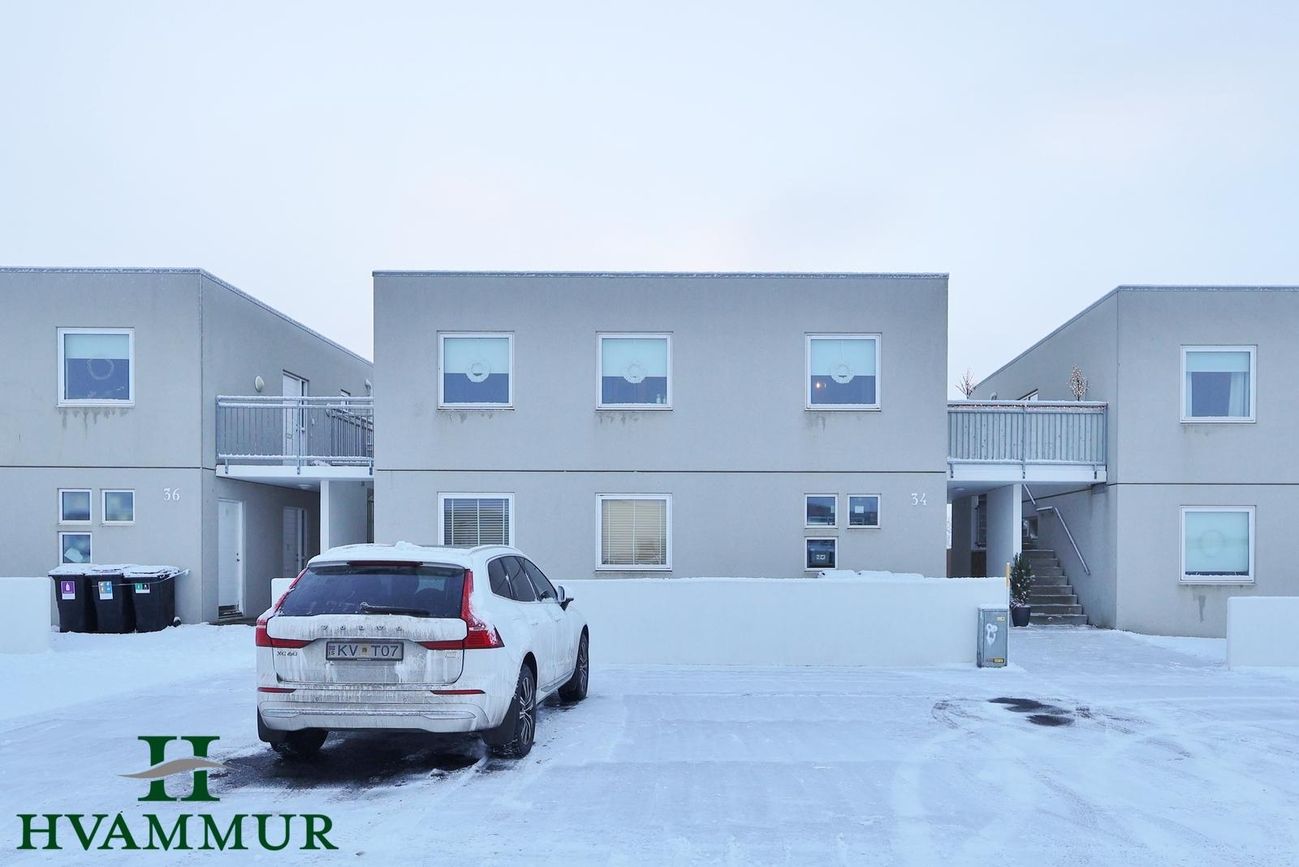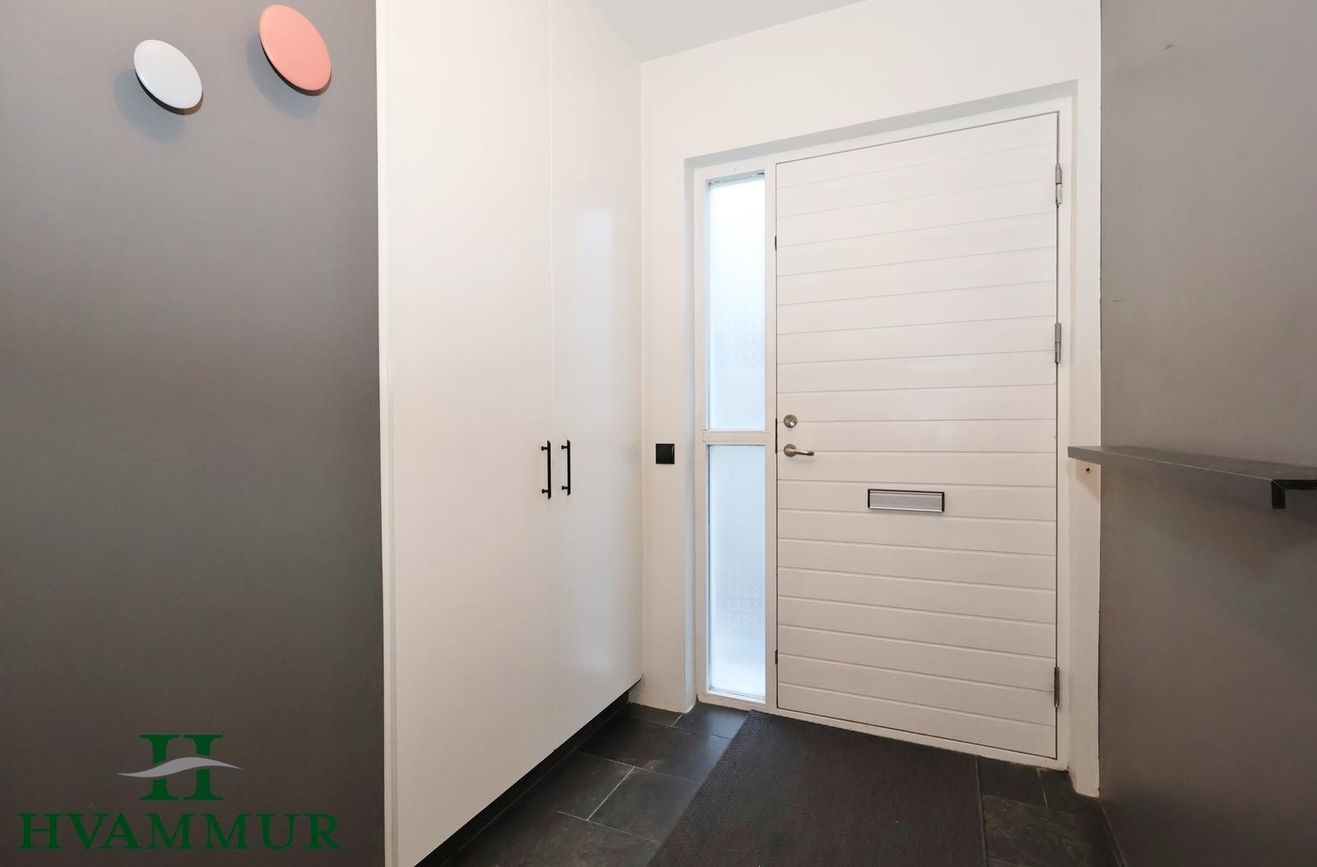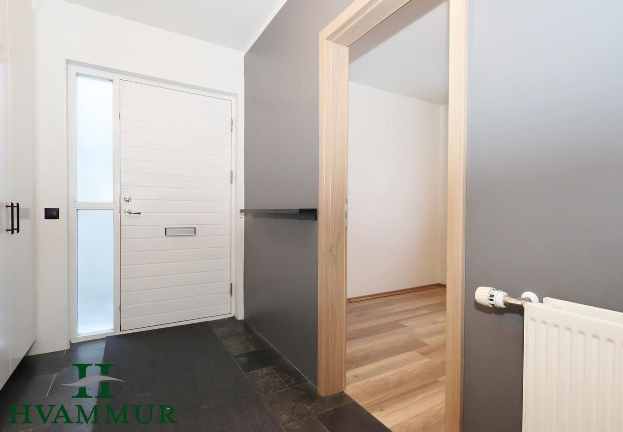 Hamratún 34 - Falleg og vel skipulögð 4ra herbergja íbúð á efri hæð í fjölbýli í Naustahverfi með sérinngangi - stærð 110,0 m²Eignin skiptist í forstofu, eldhús, stofu, þrjú svefnherbergi, baðherbergi og geymslu með þvottahúsi innaf. Sameignleg geymsla með íbúð á neðri hæð er á neðri hæð.Forstofa er með svörtum náttúrustein á gólfum og tvöföldum innfelldum fataskáp.