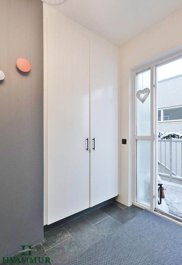 Geymsla: Svartur náttúrusteinn á gólfum og nýlegir hvítir skápar (2022) - gott skápapláss.