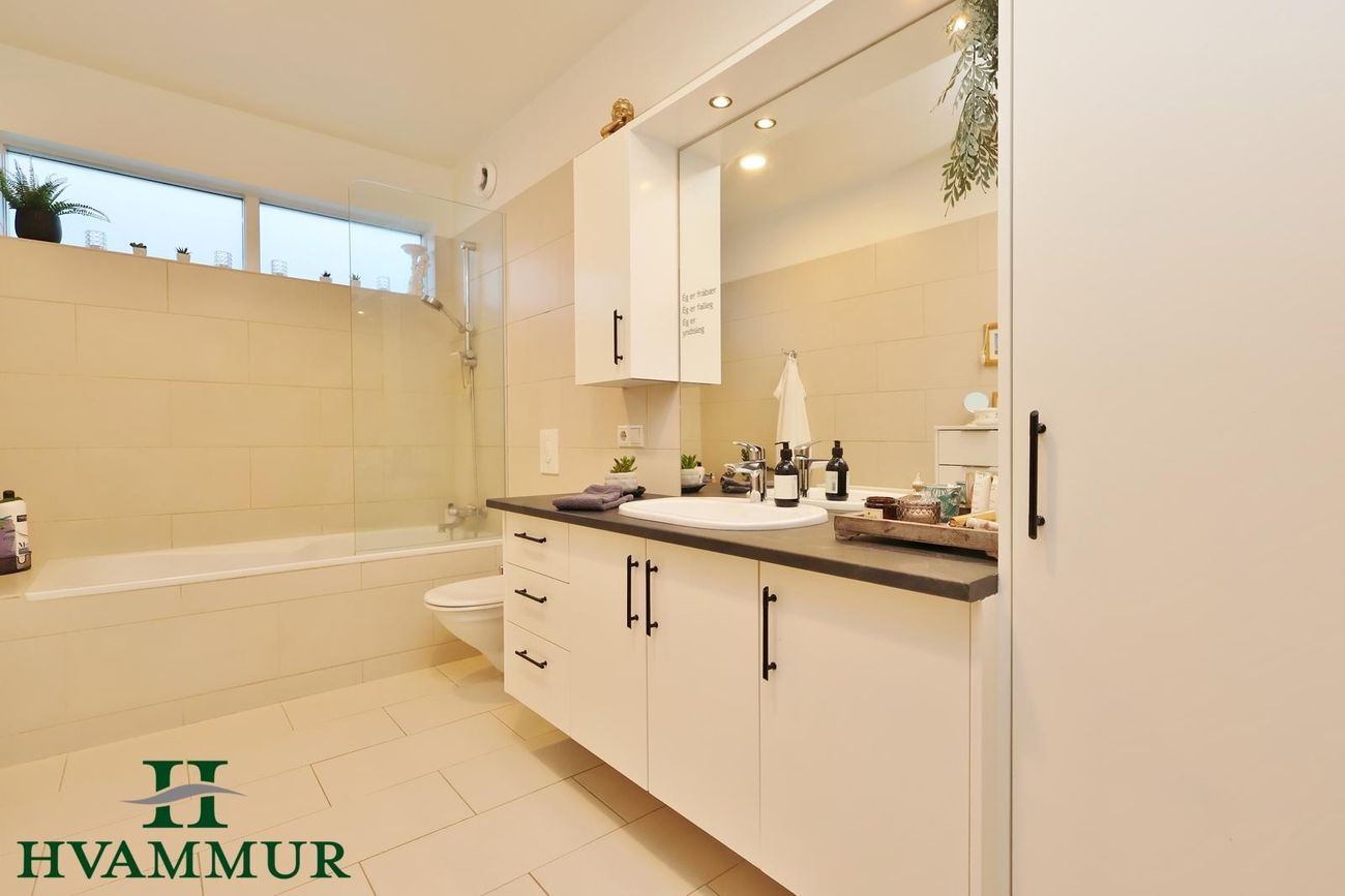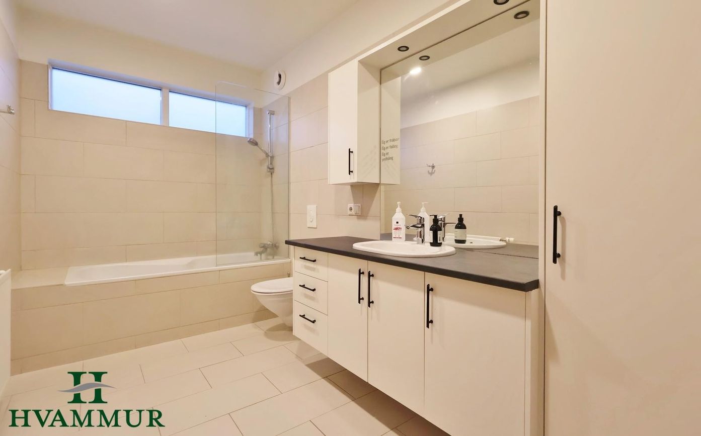 Baðherbergi er flísalagt bæði gólf og veggir. Snyrtileg innrétting, baðkar með sturtutækjum, vegghengt klósett og handklæðaofn.