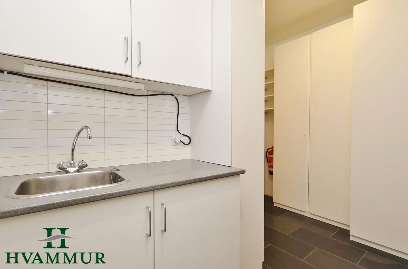 Þvottahús er innaf geymslu. Svartur náttúrusteinn á gólfum. Hvít innrétting með stálvask. Gluggi með opnanlegu fagi.