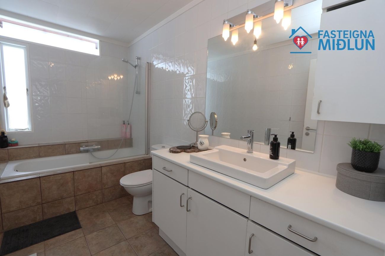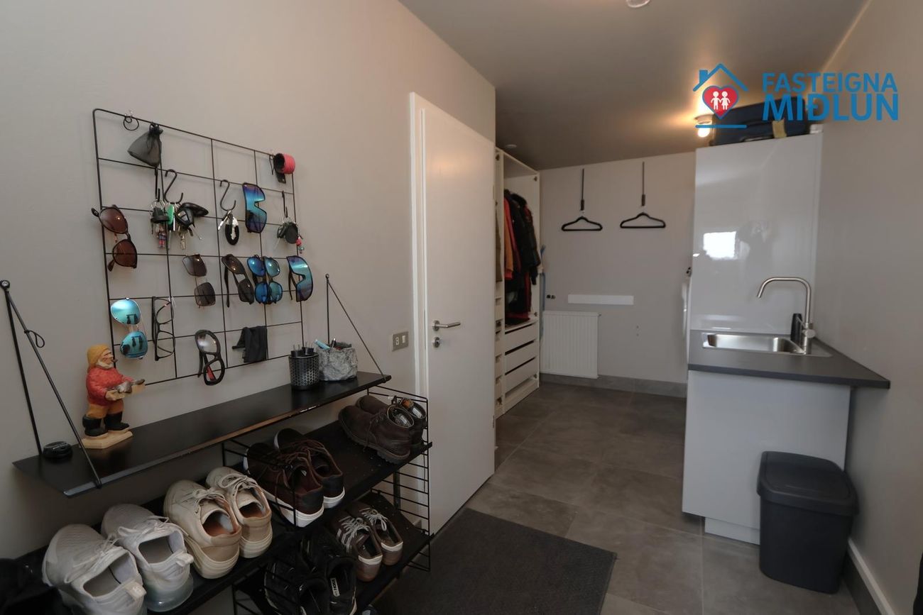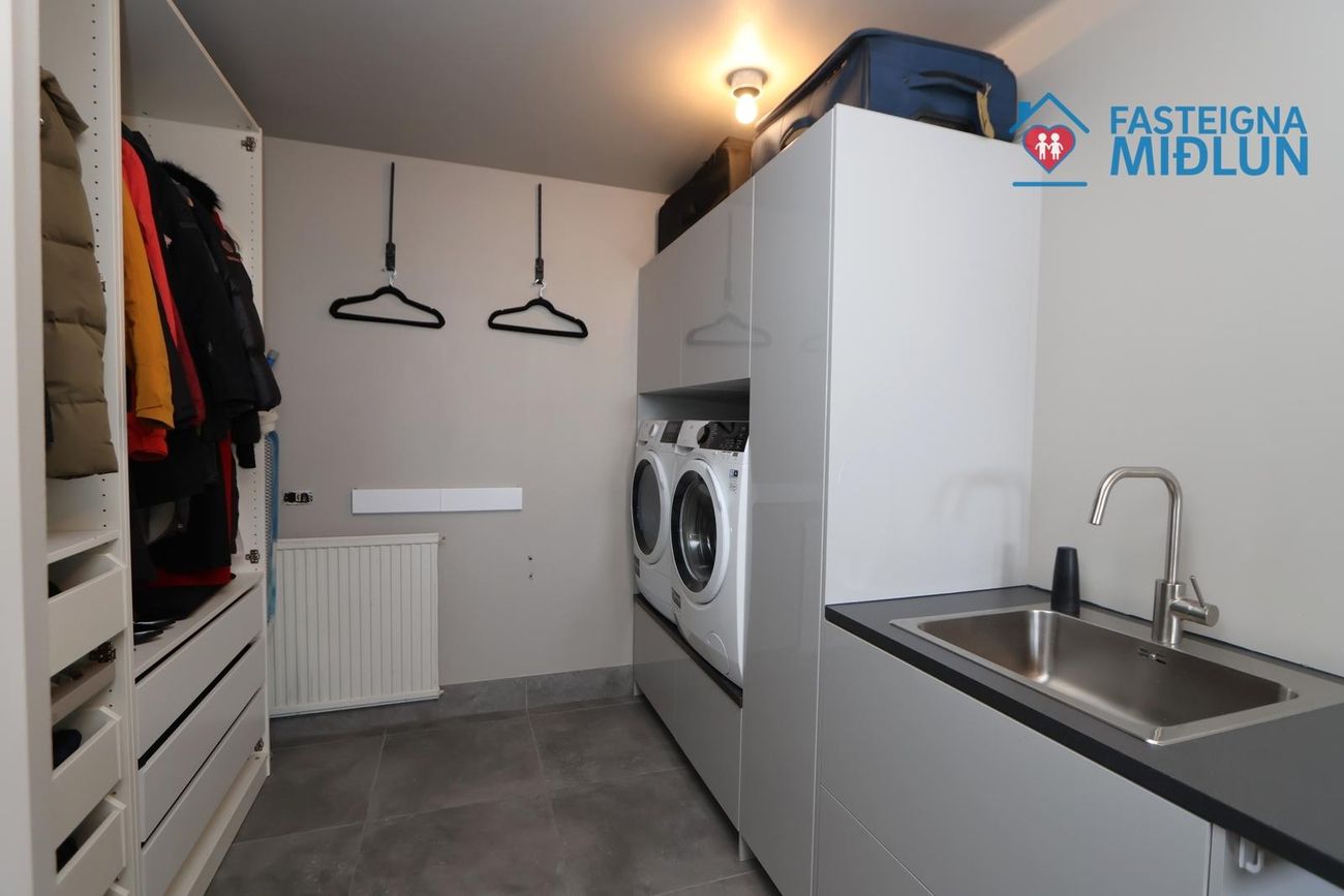 Þvottahús: er mjög rúmgott með skápaplássi, vask og sér inngangi.