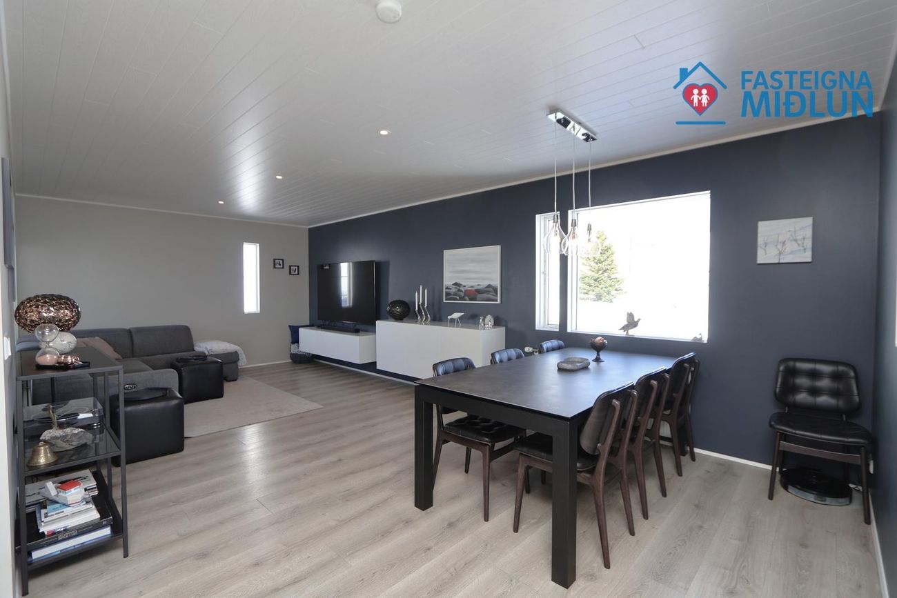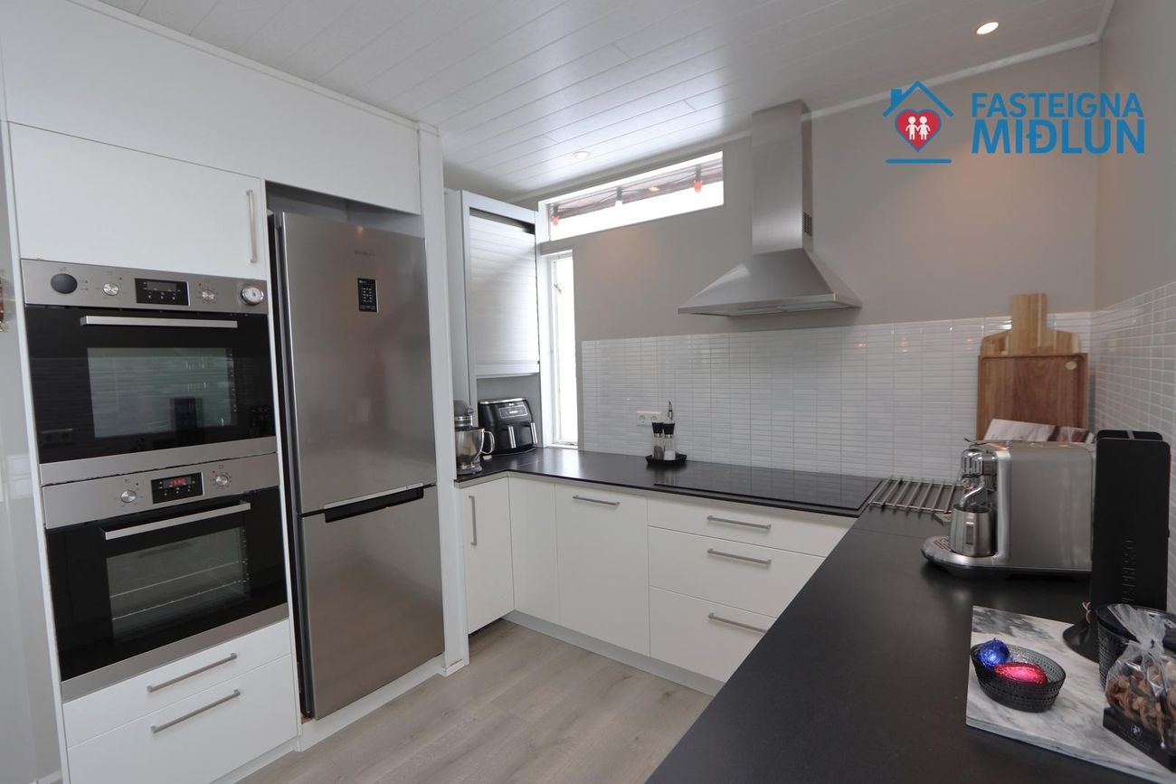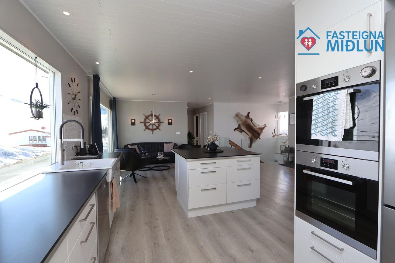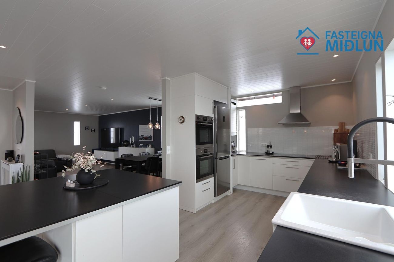 Efri hæð: Eldhús: er með hvítum innréttingum og svartri borðplötu. Búrskápur er við enda, innbyggðir 2 ofnar, helluborð og stór vaskur. Eyja er með skúffuplássi og sætum við enda.
