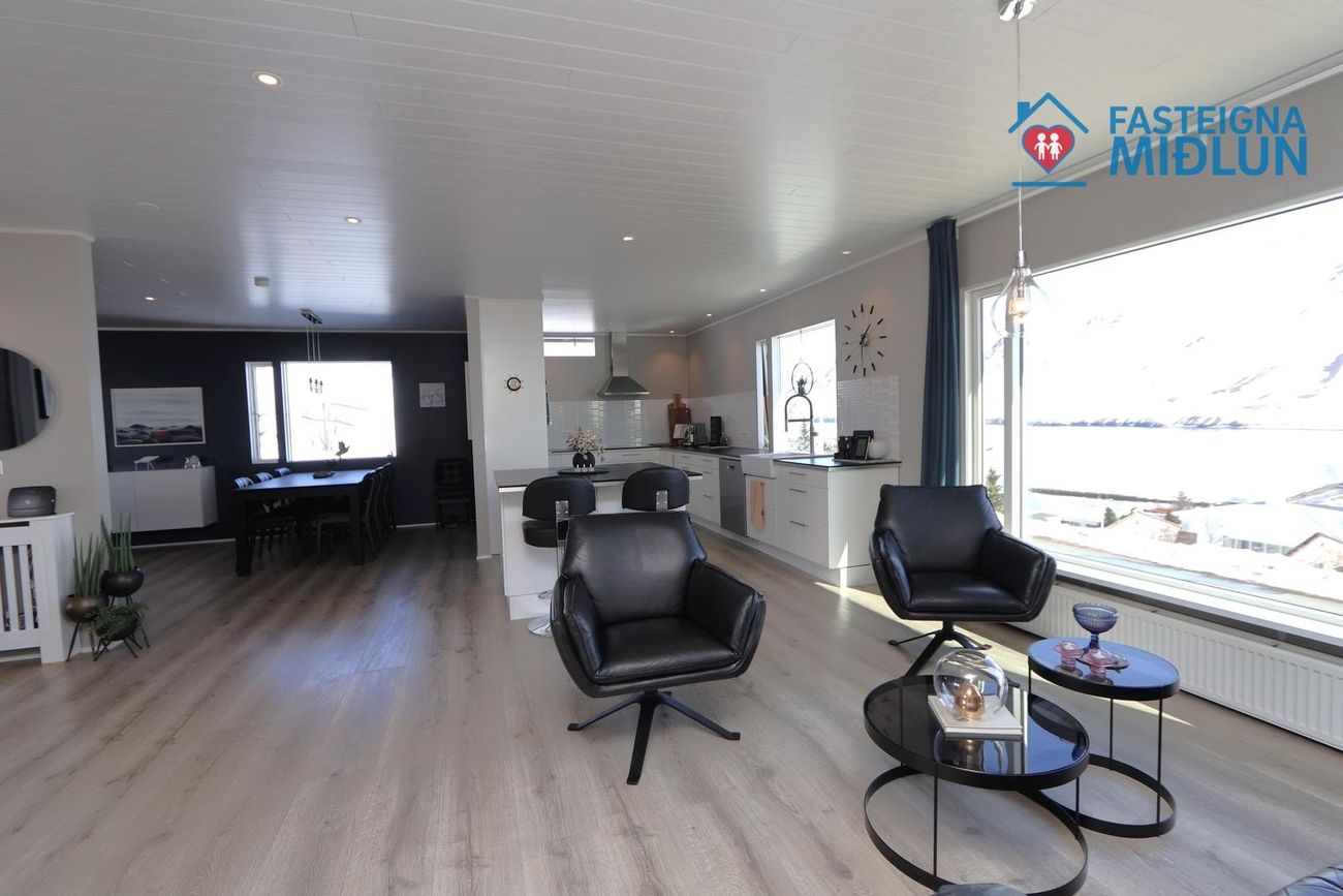 Stofa-borðstofa-sjónvarpstofa: liggja saman í opnu rými með eldhúsi. Mikið og fallegt útsýni er úr stórum gluggum í rýminu.