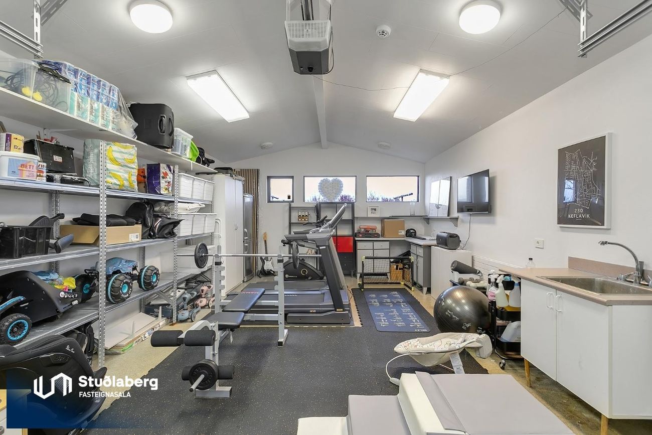Bílskúr með epoxy gólfi og hurðaopnara.