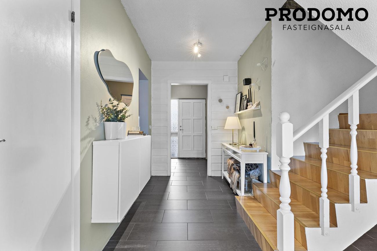 175,2 m² raðhús með 5 svefnherbergjum, bílskúr (22,4 m²), verönd og heitur pottur. Gólfhiti á neðri hæð.