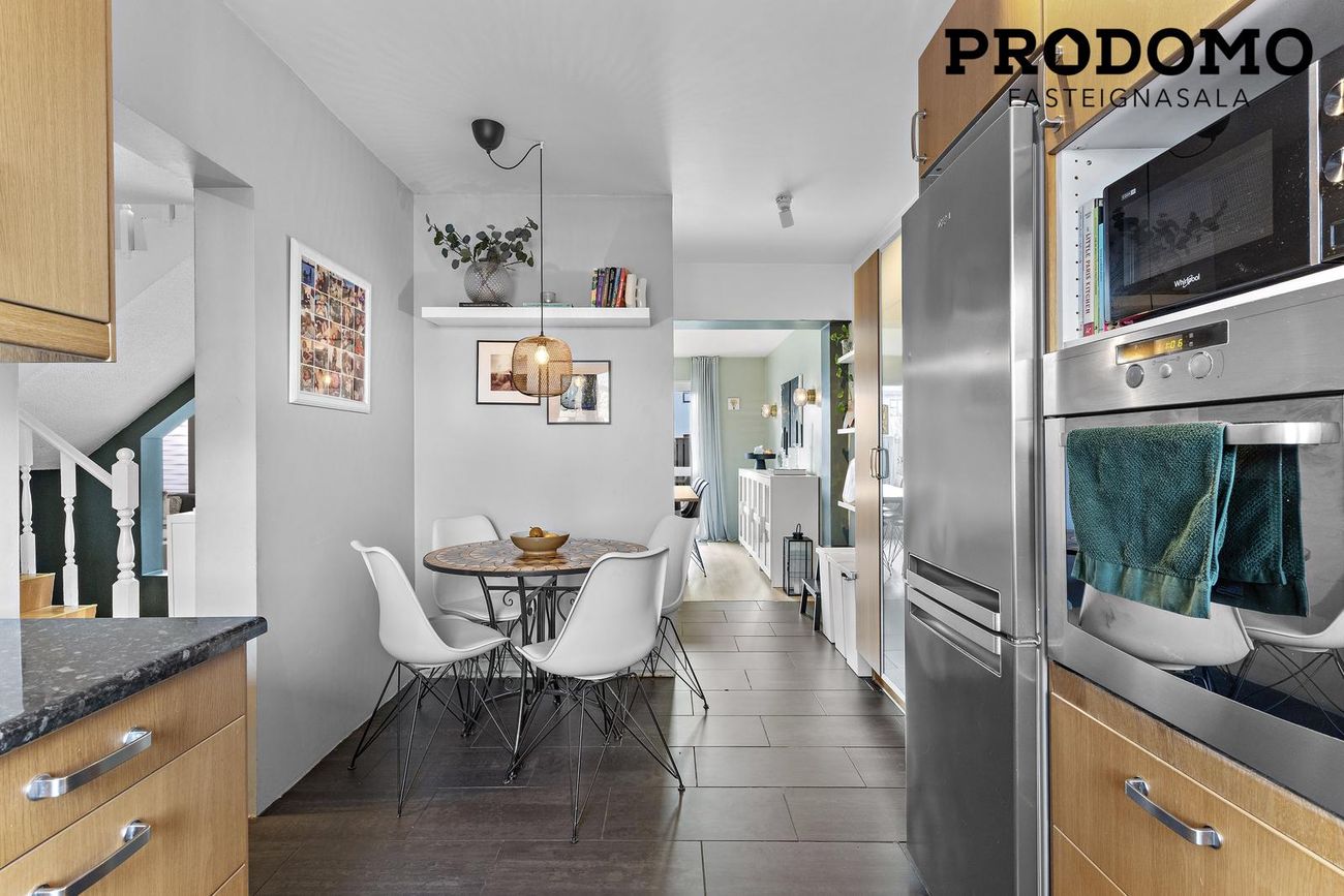 Eldhús er með flísar á gólfi, eikarinnrétting og borðkrókur.