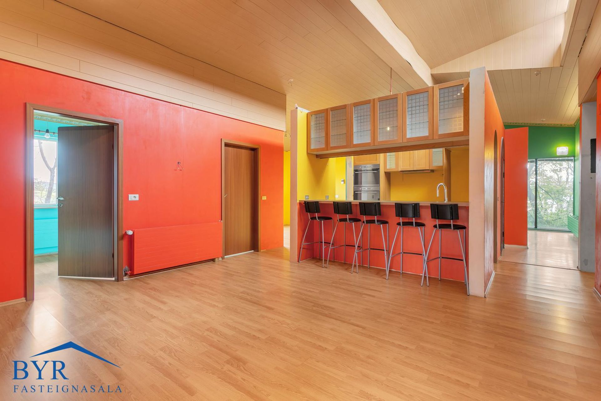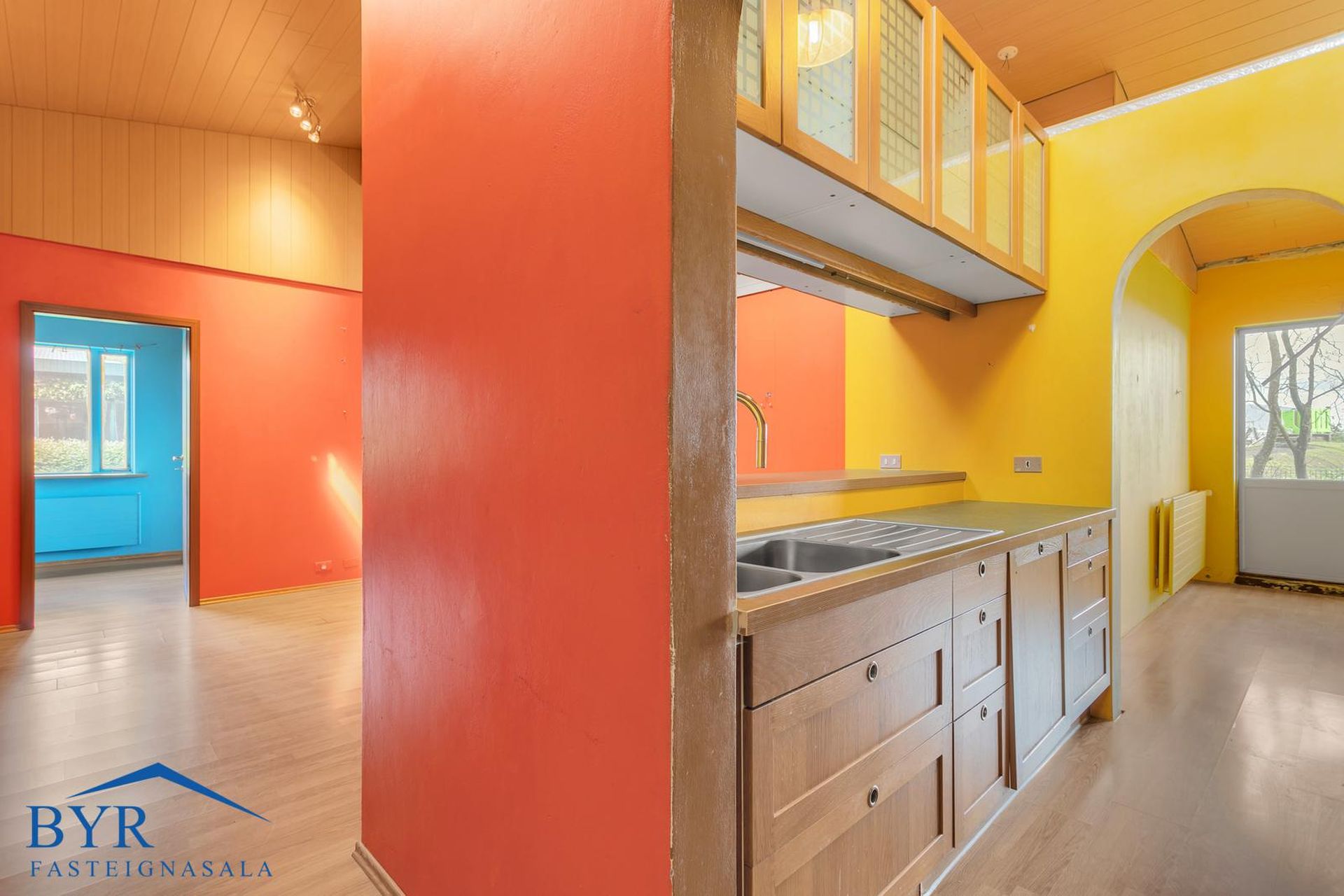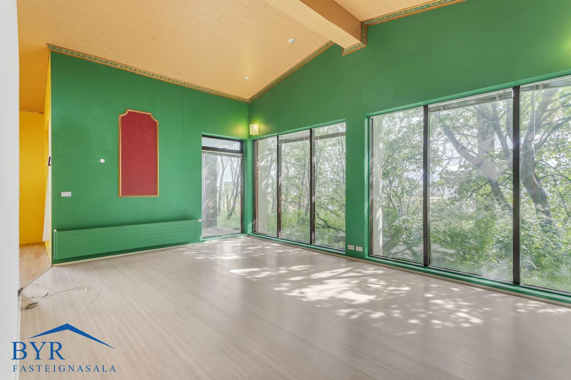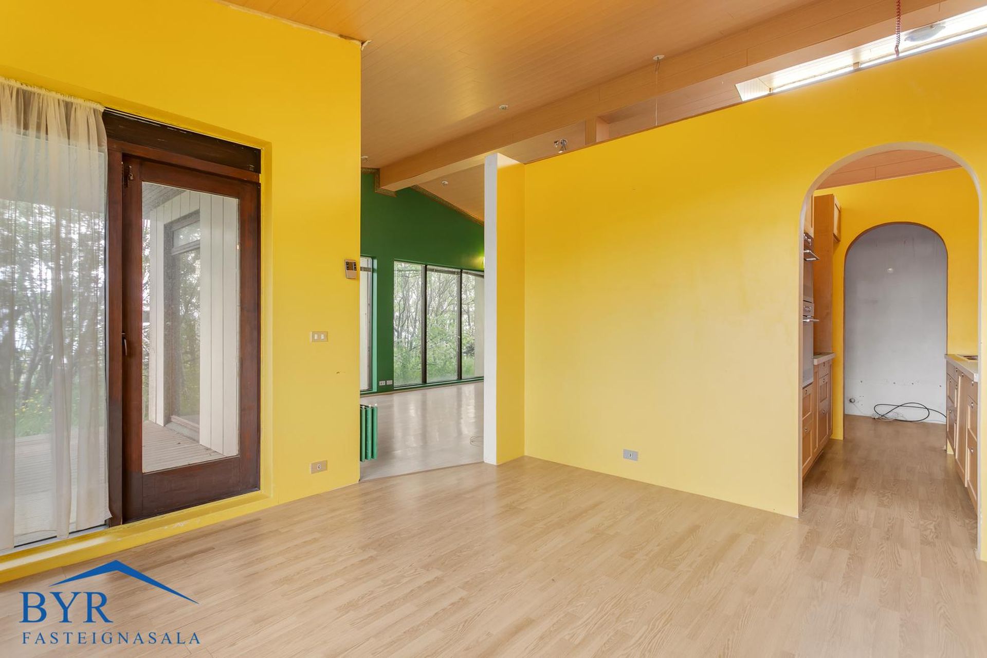 Timburpallur úr stofu og verönd úr þvottahúsi.