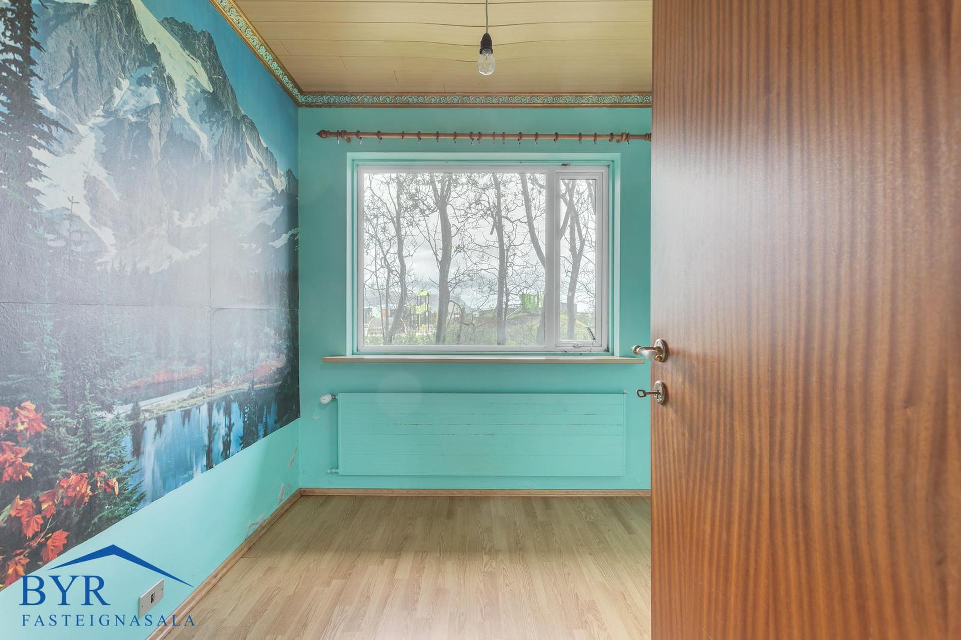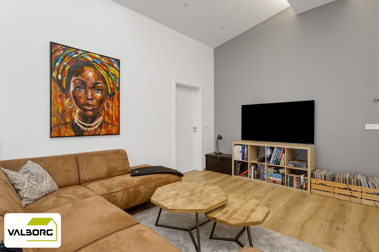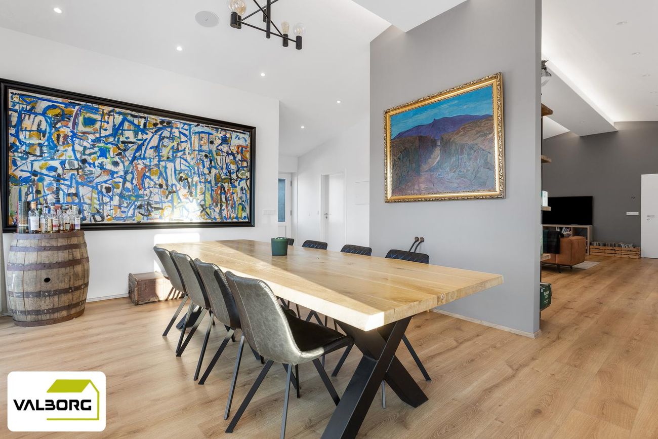 Rúmgóð stofa með parketgólfi og útgengi á timburpall.