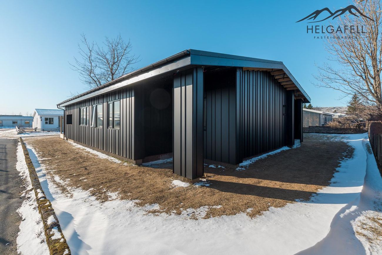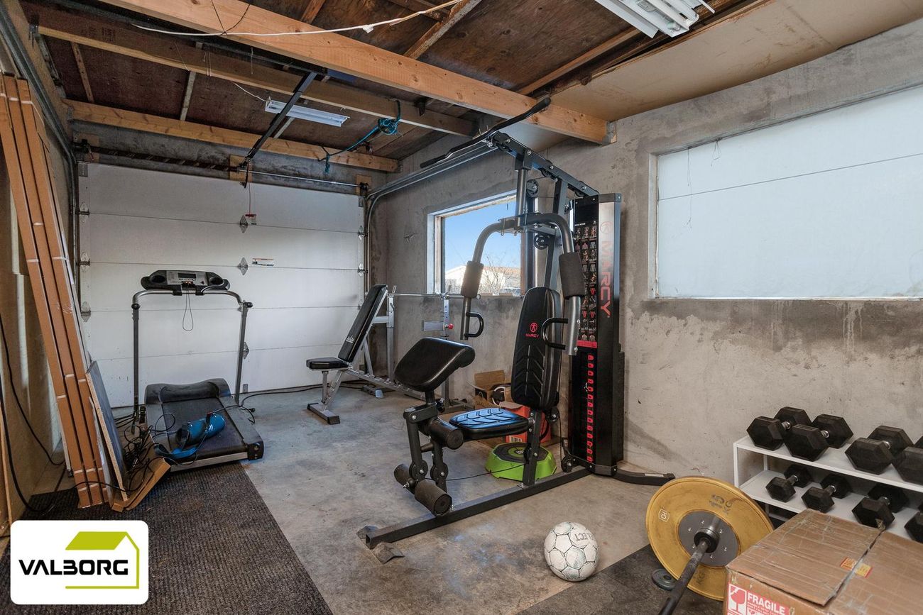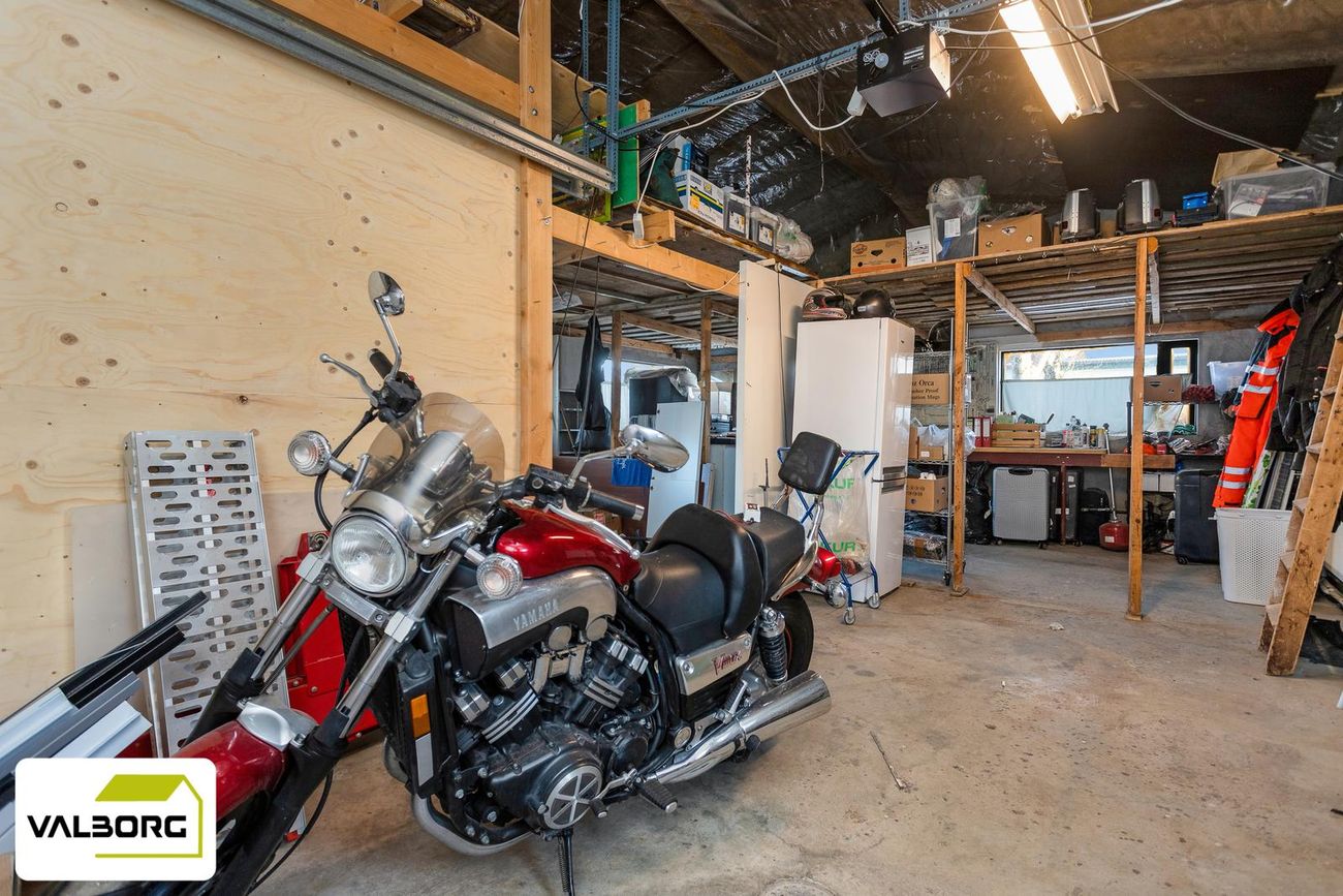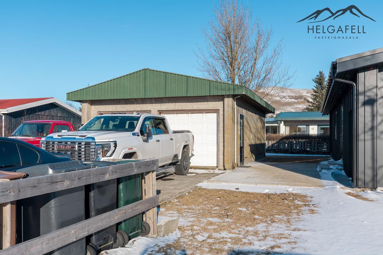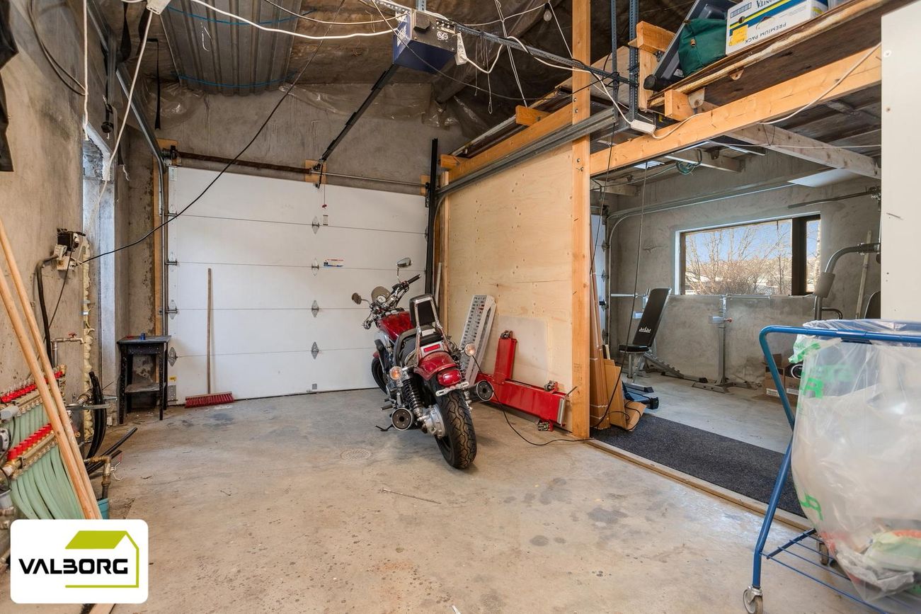Tvöfaldur bílskúr með millilofti og rafdrifnum hurðum.
