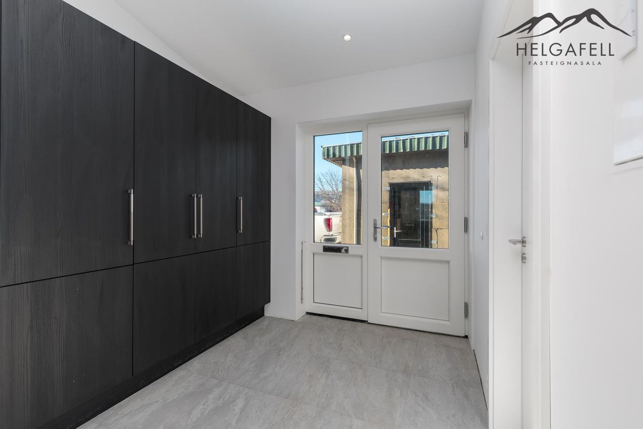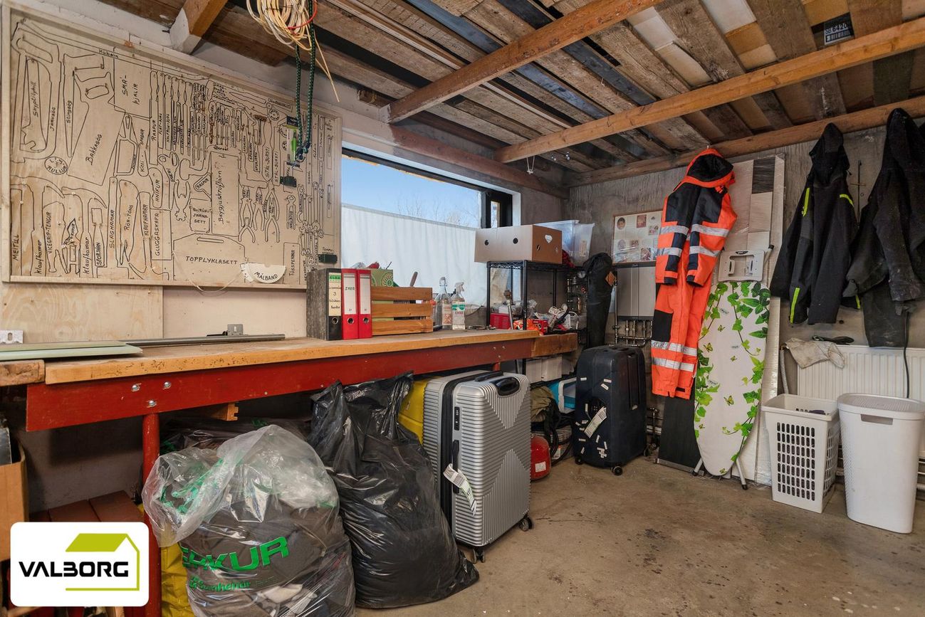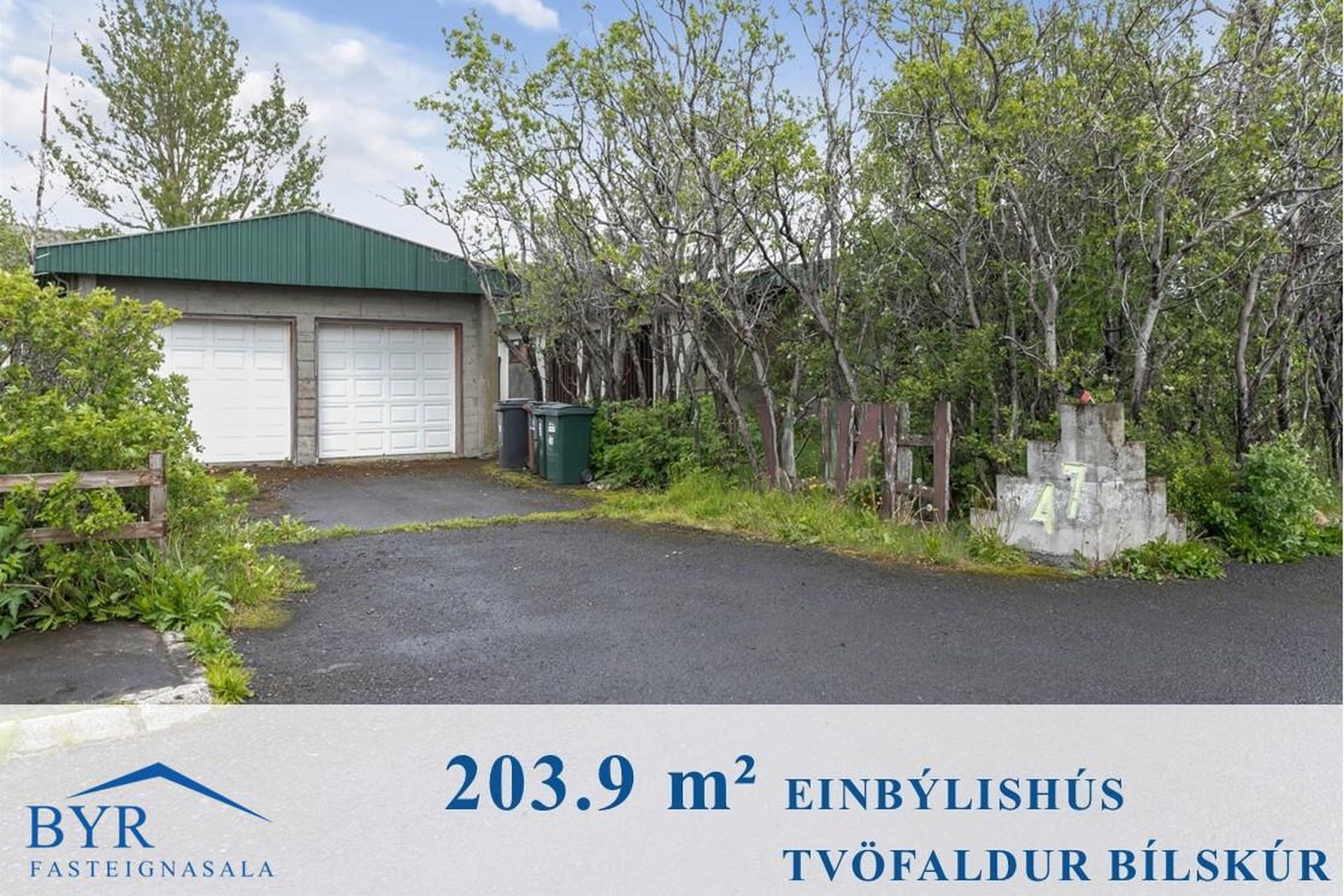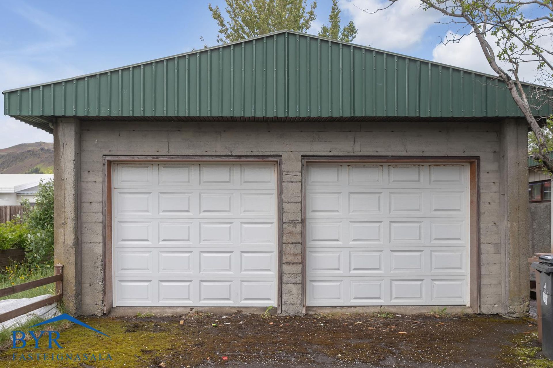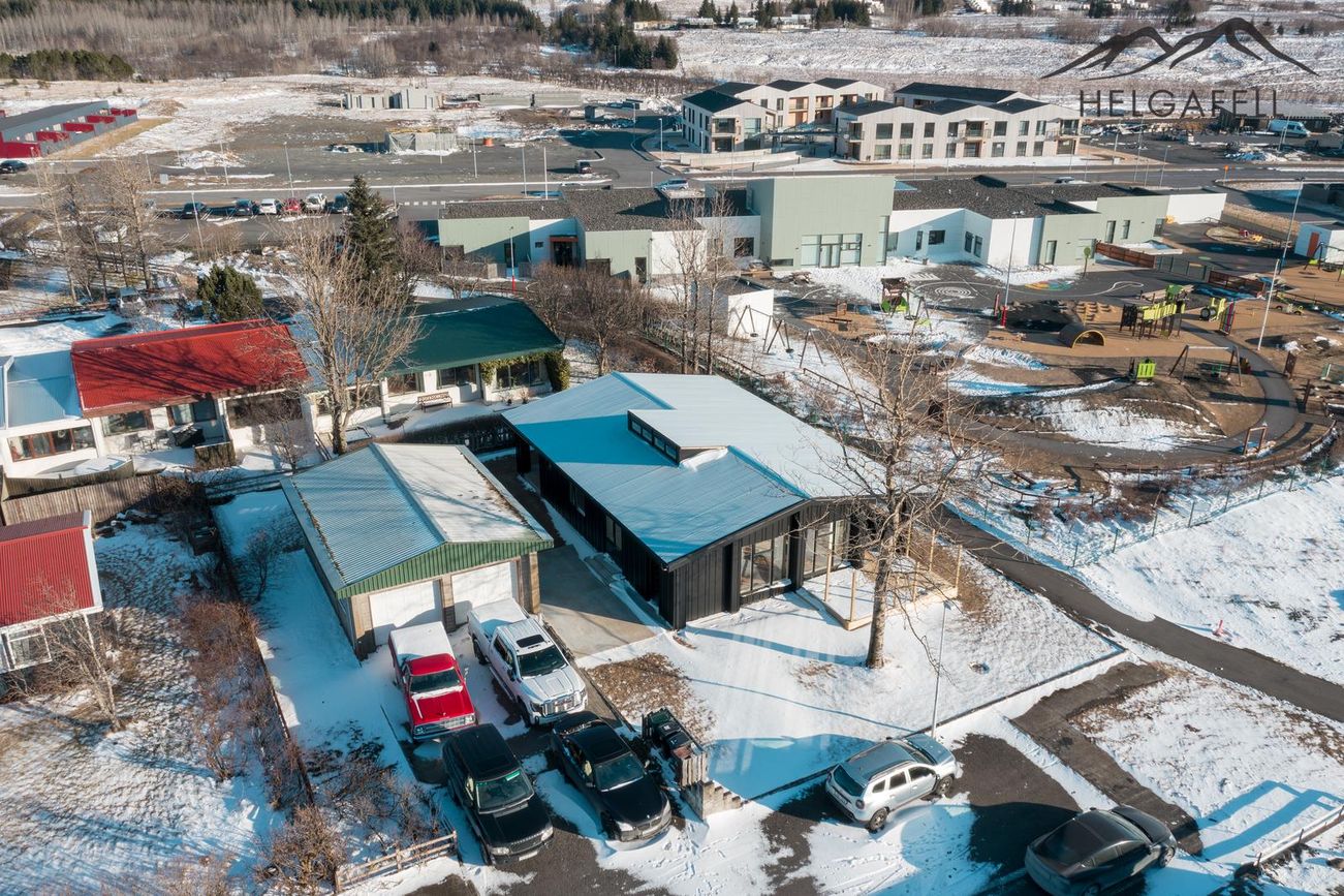 Tvöfaldur bílskúr með millilofti og rafdrifnum hurðum.