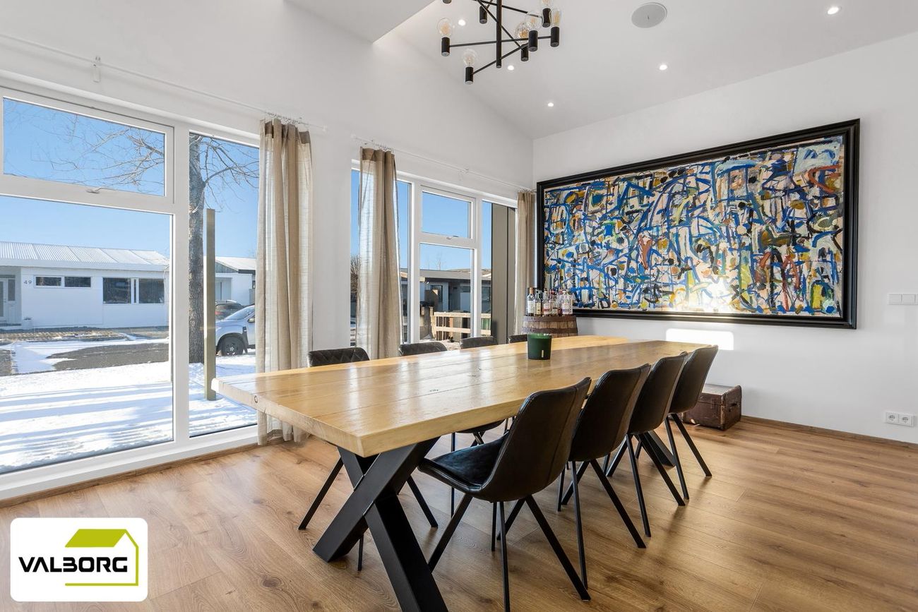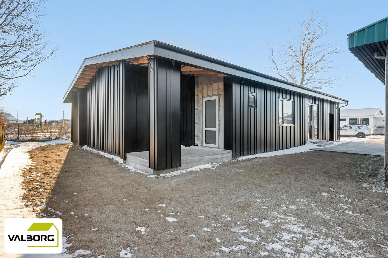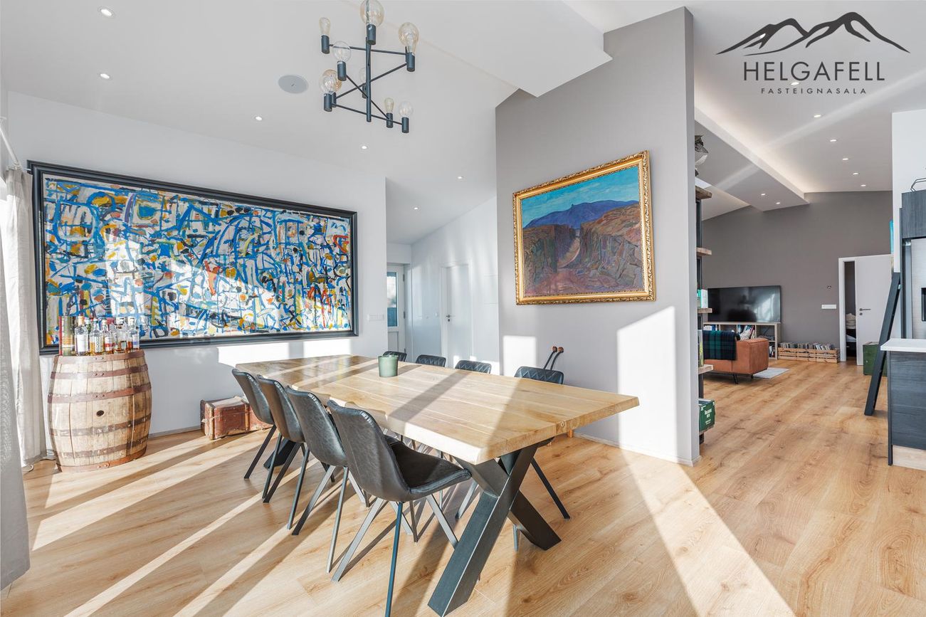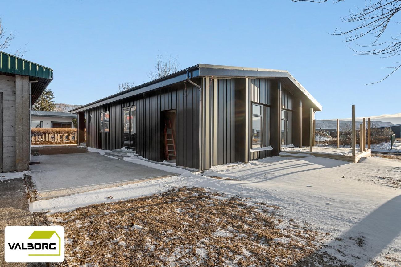141,4 fm einbýlishús með 62,5 fm bílskúr, þrjú svefnherbergi, tvö baðherbergi, gólfhiti, parketgólf og nútímalegar innréttingar frá HTH.