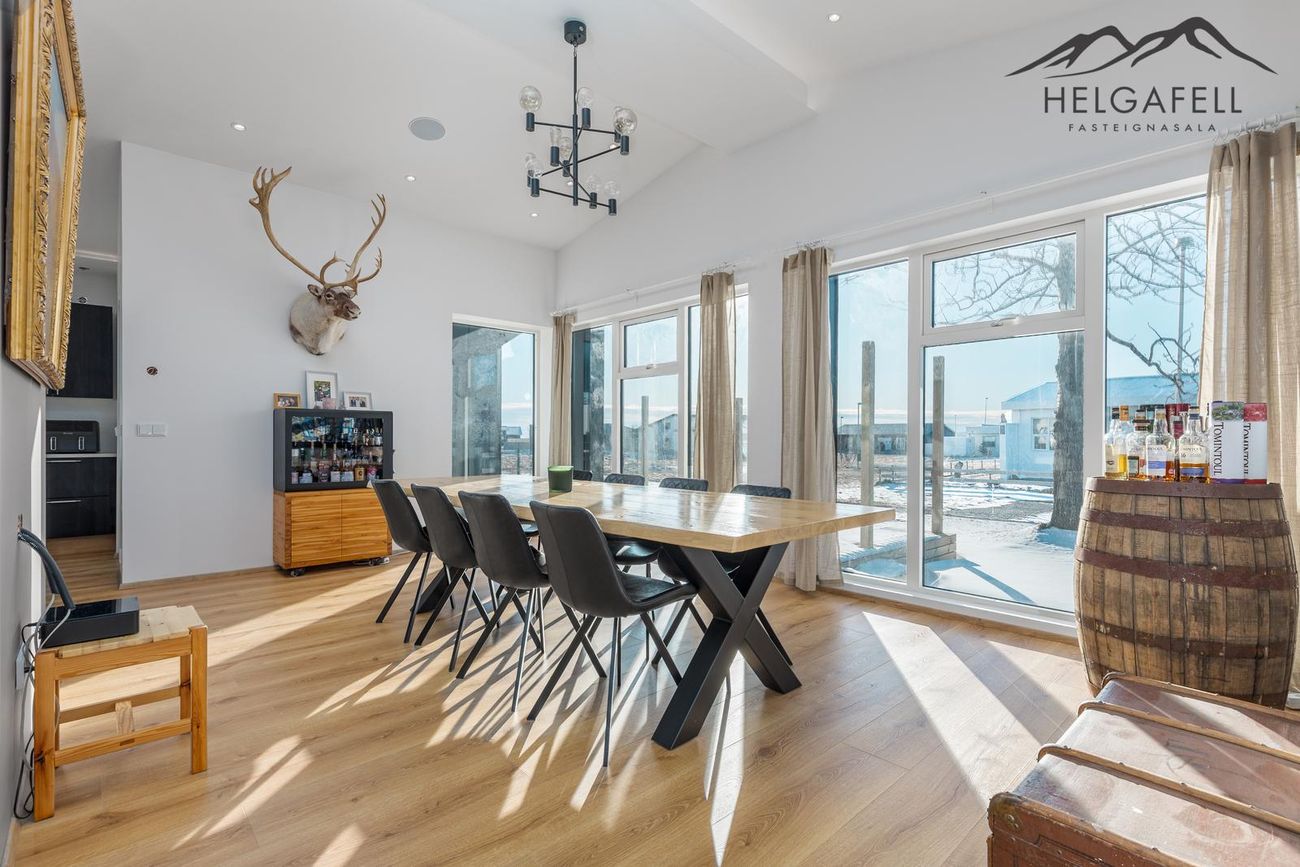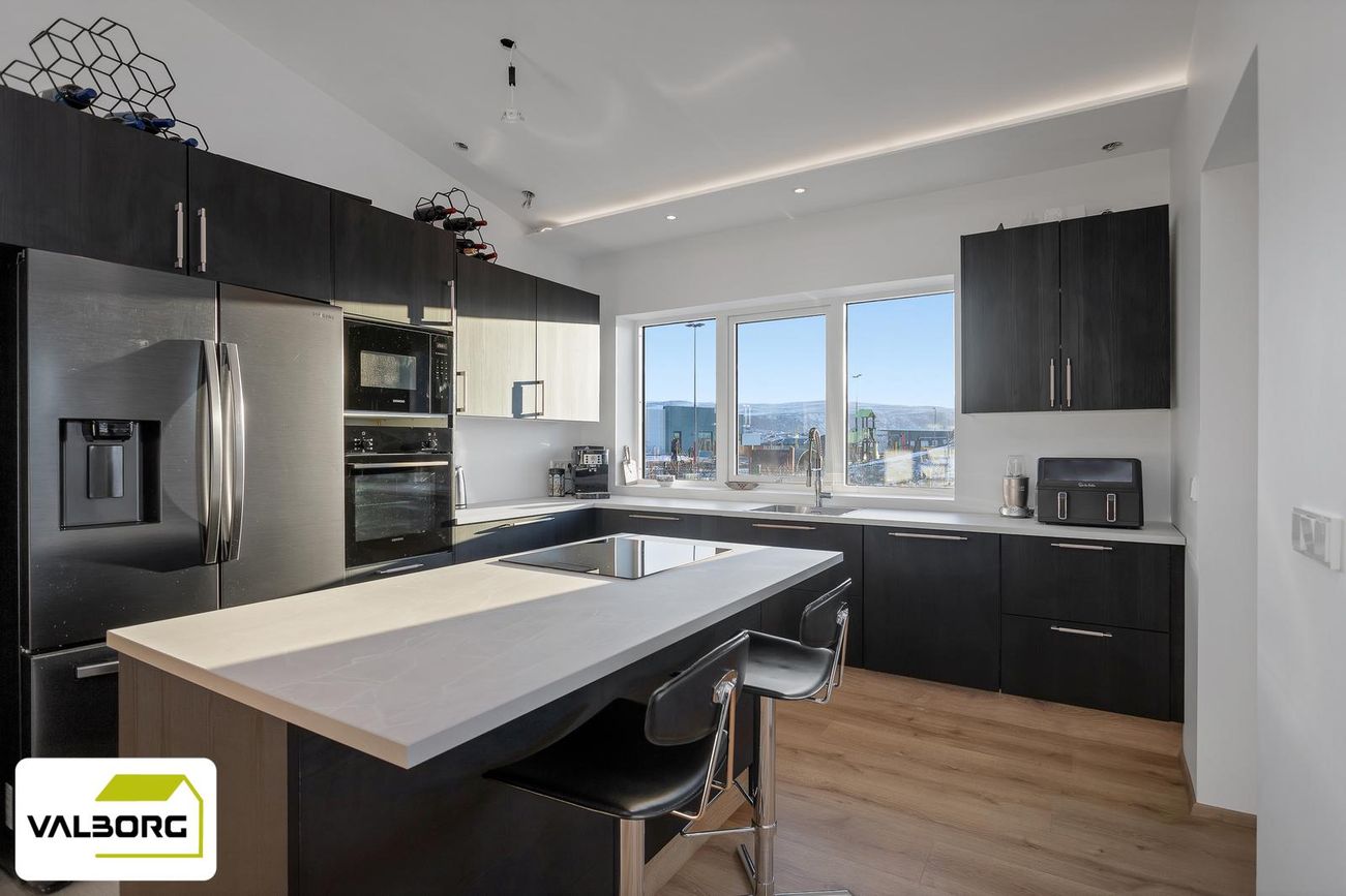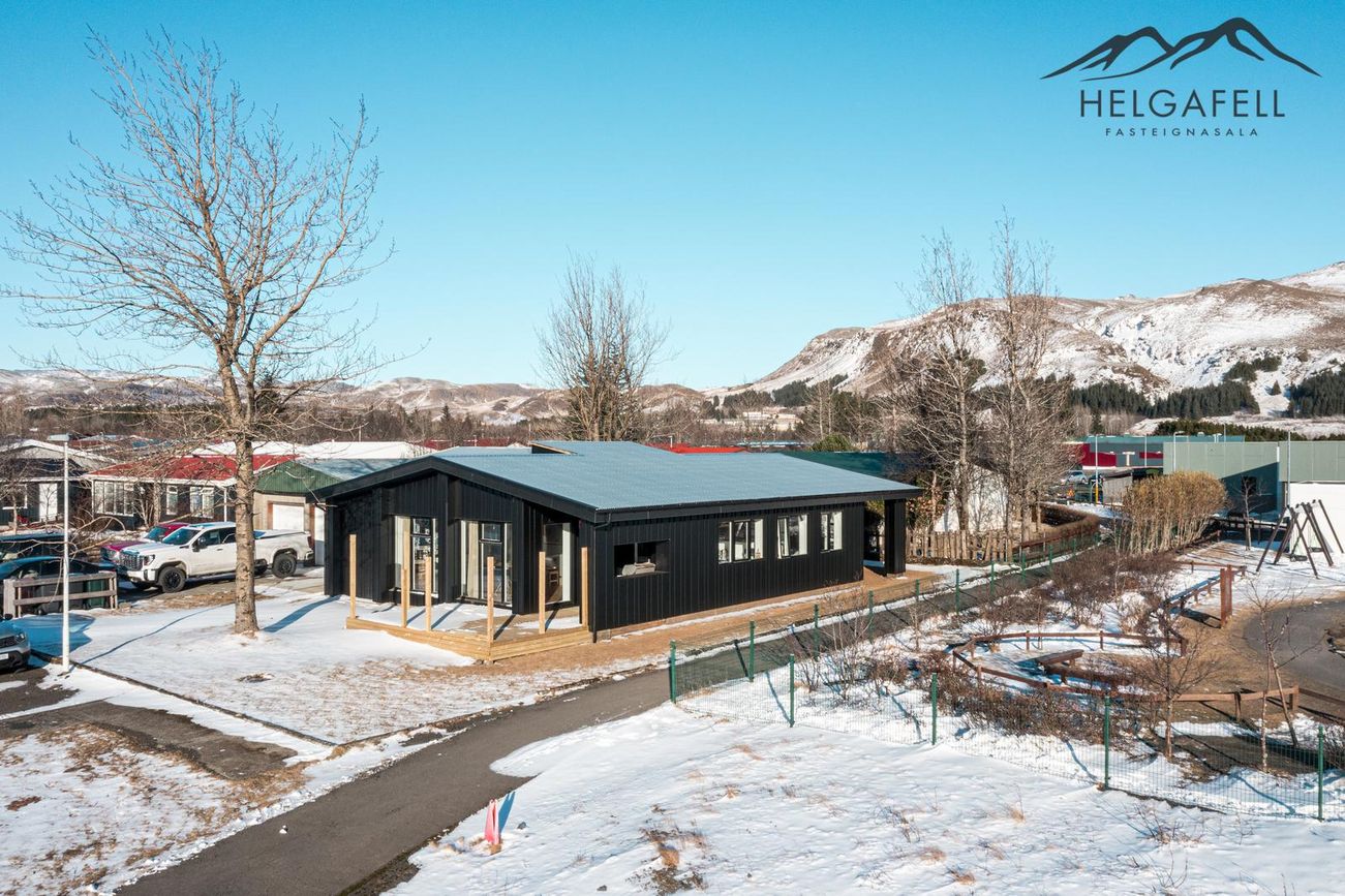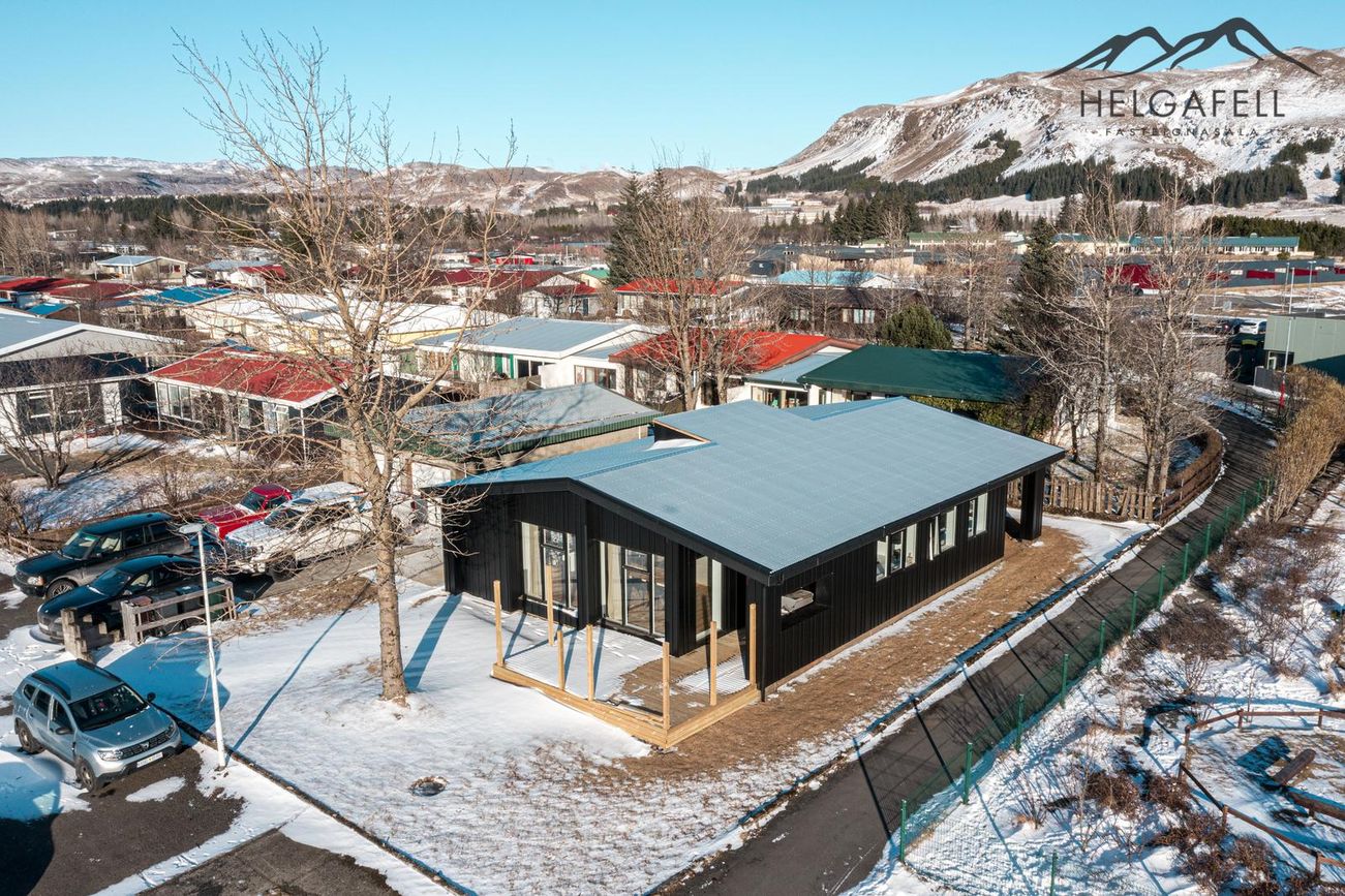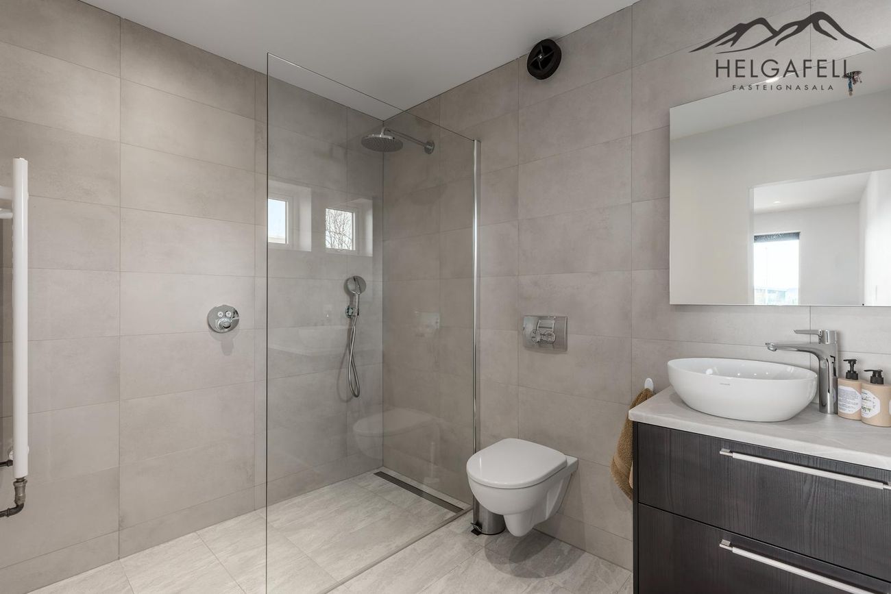 141,4 fm einbýlishús með 62,5 fm bílskúr, þrjú svefnherbergi, tvö baðherbergi, gólfhiti, parketgólf og nútímalegar innréttingar frá HTH.