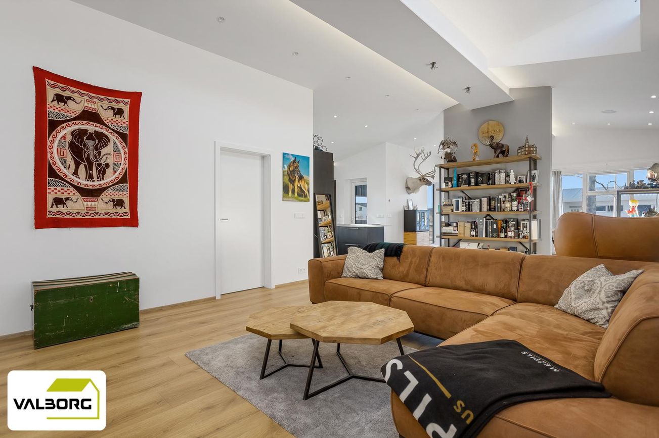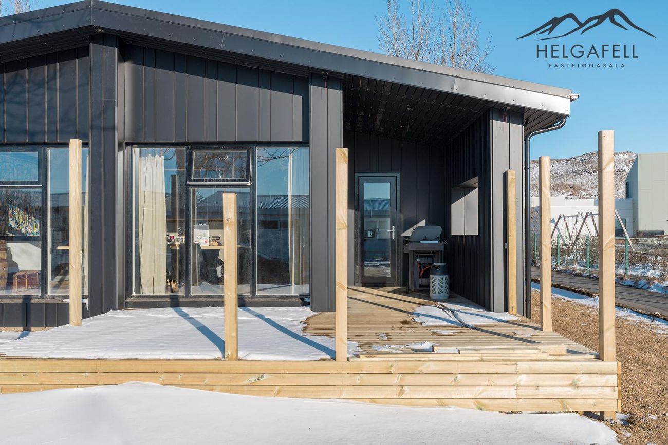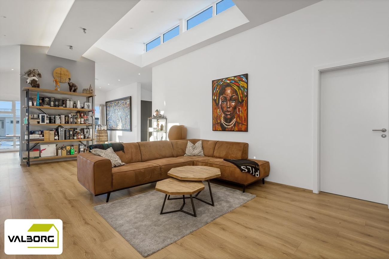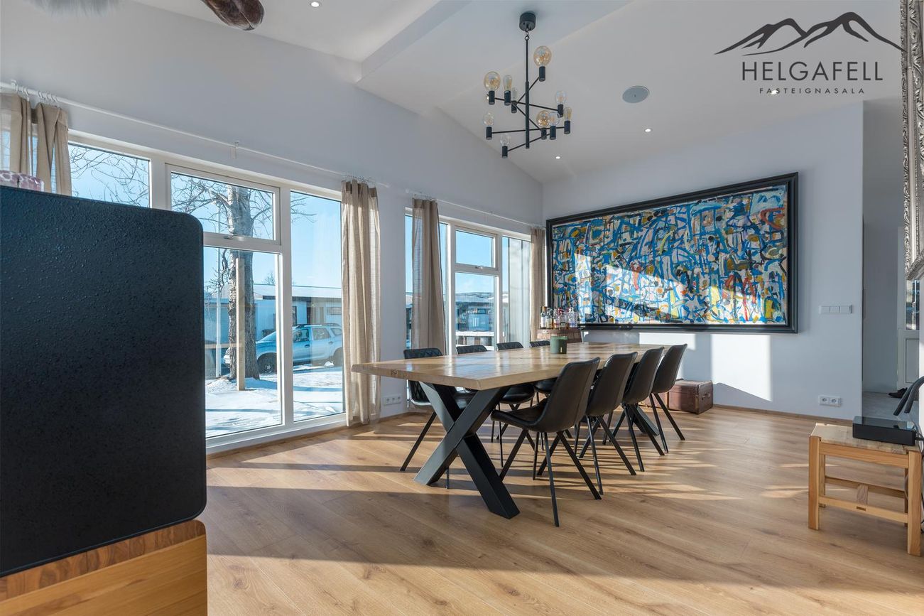 141,4 fm einbýlishús með 62,5 fm bílskúr, þrjú svefnherbergi, tvö baðherbergi, gólfhiti, parketgólf og nútímalegar innréttingar frá HTH.