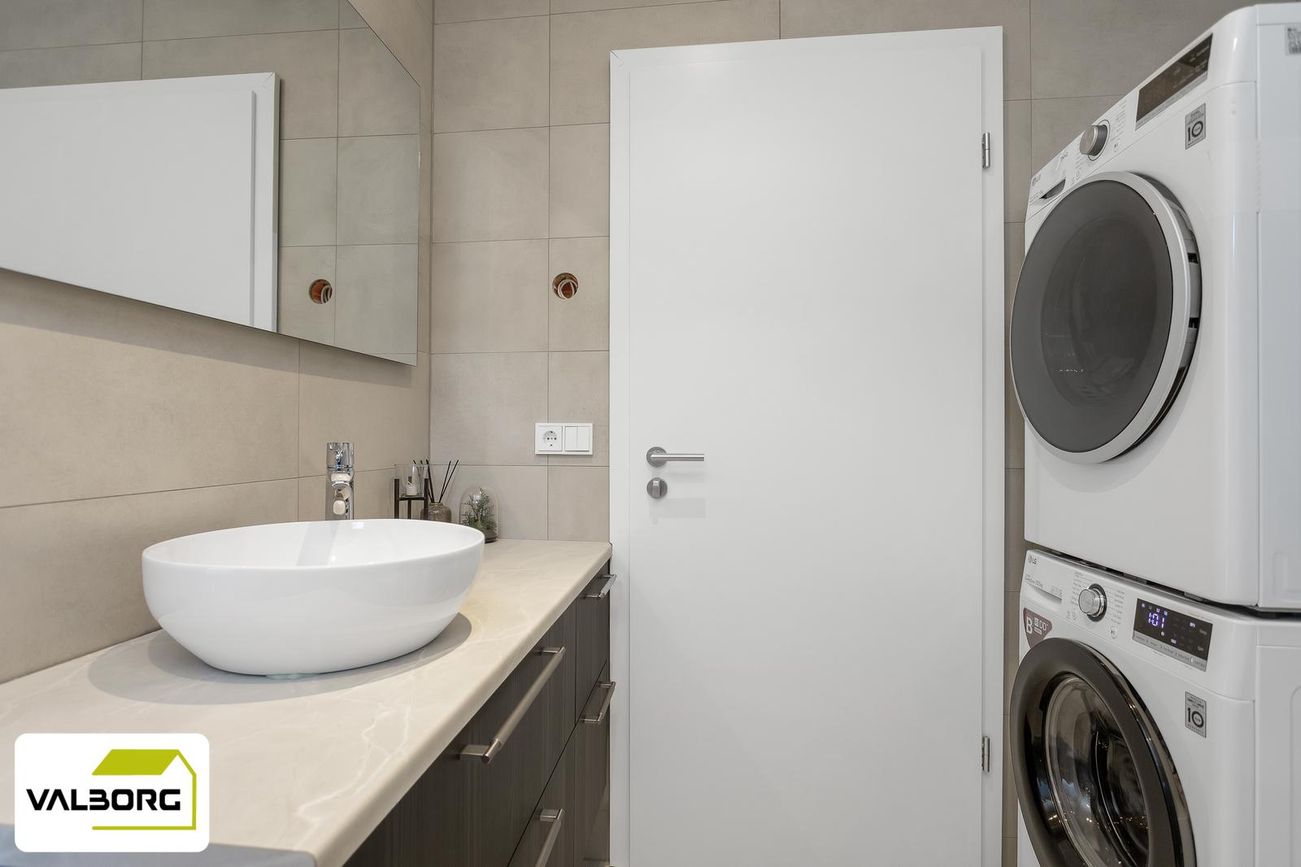 Þvottahús með útgengi út á verönd.