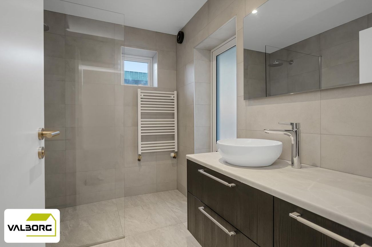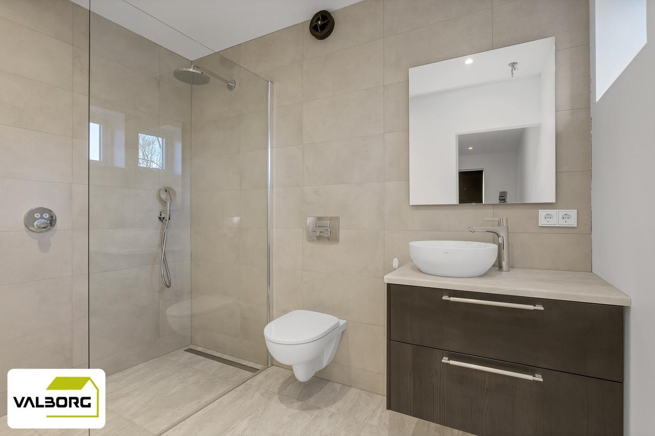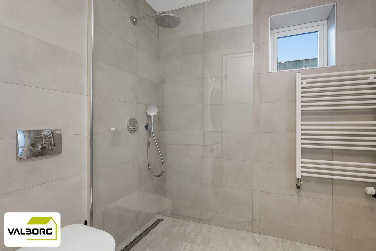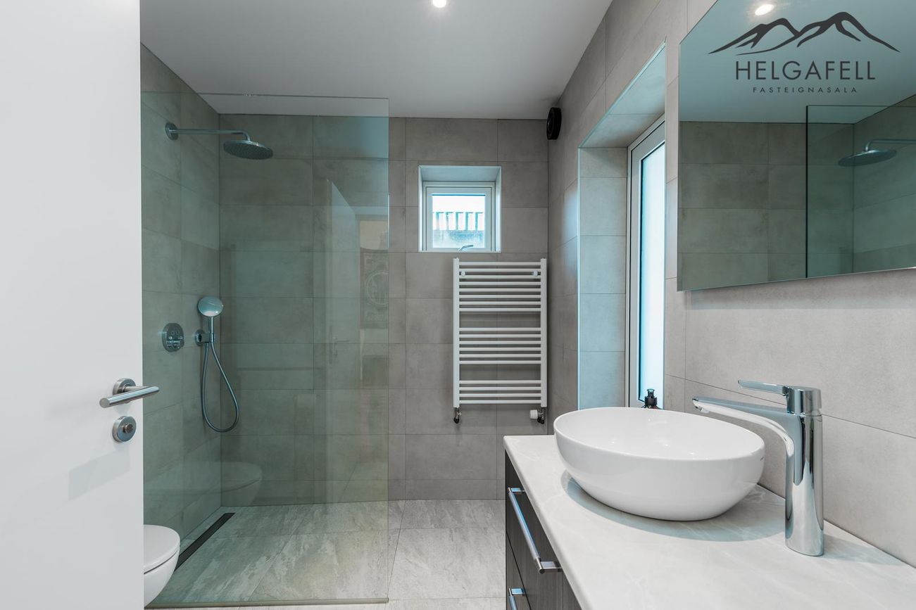 Nýlega endurnýjað baðherbergi með flísalegu umhverfi, upphengt salerni, sturtu og innbyggðu Hans Grohe blöndunartæki.
