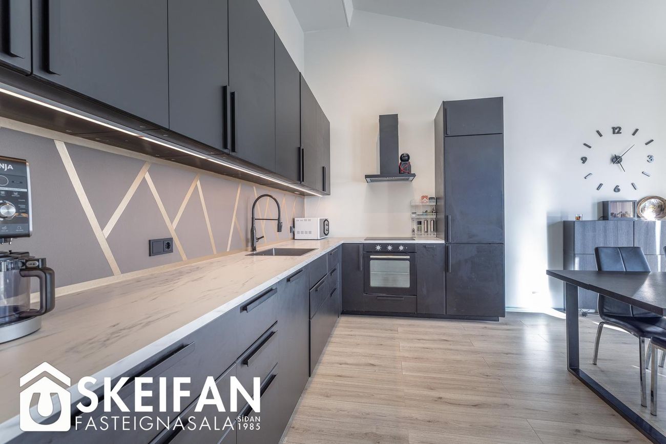 Raðhús í Vogunum með opnu rými sem tengir stofu, borðstofu og eldhús. Útgangur að garði með palli og graslendi.