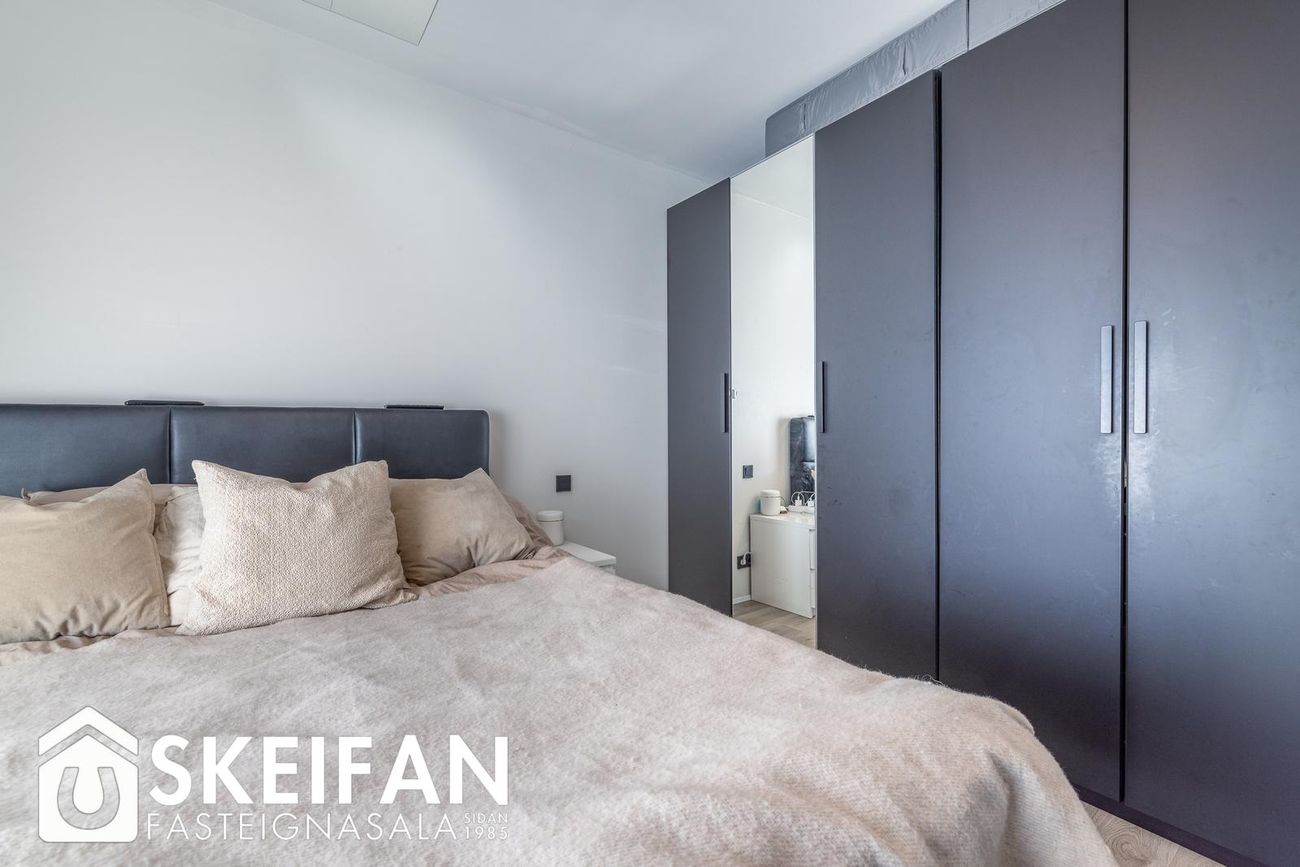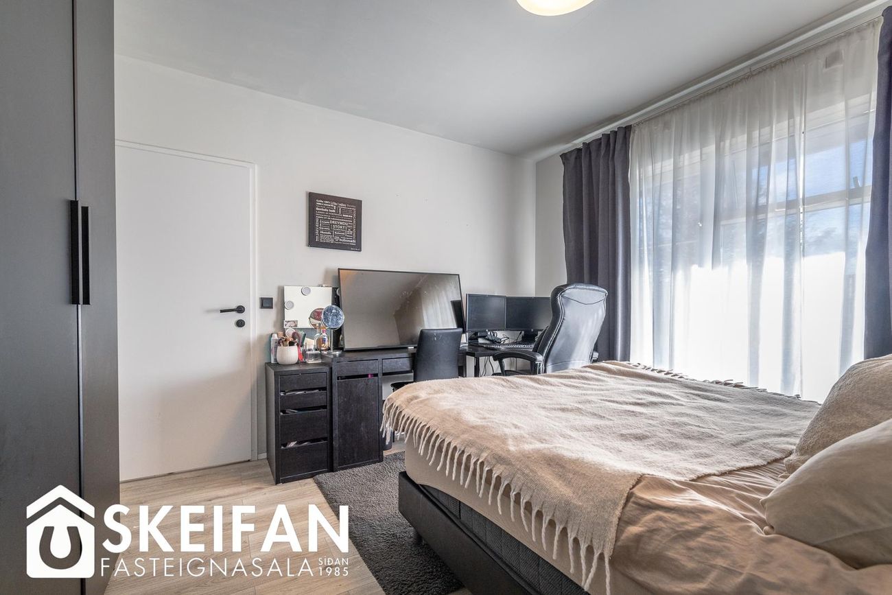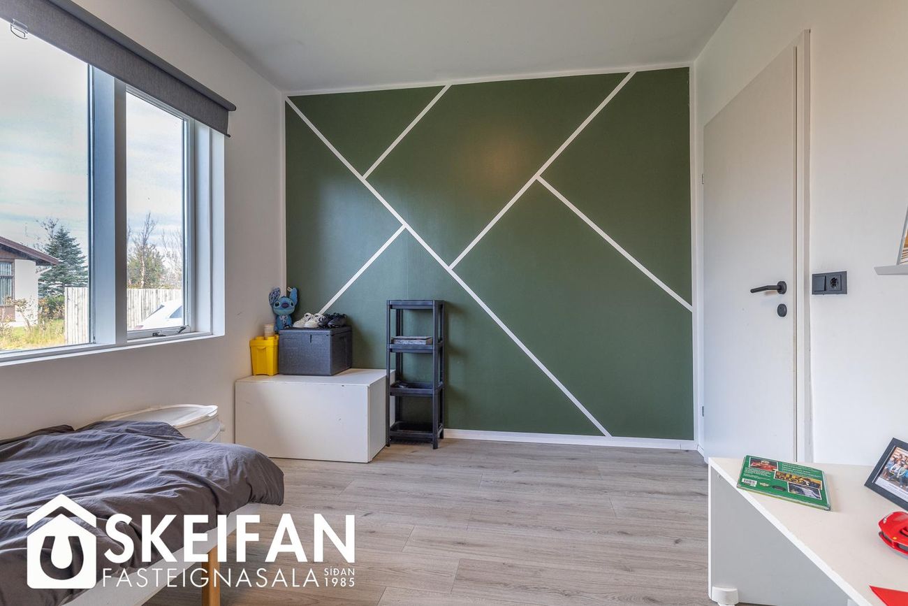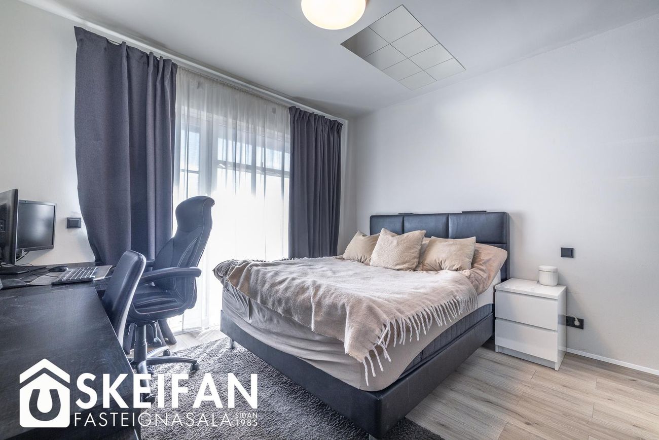 Þrjú svefnherbergi (9,0 fm, 12,8 fm og 9,8 fm) með fataskápum. Eitt herbergi með loftlúgu í geymsluloft.