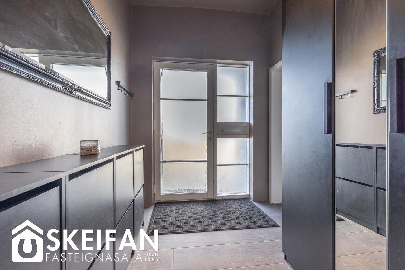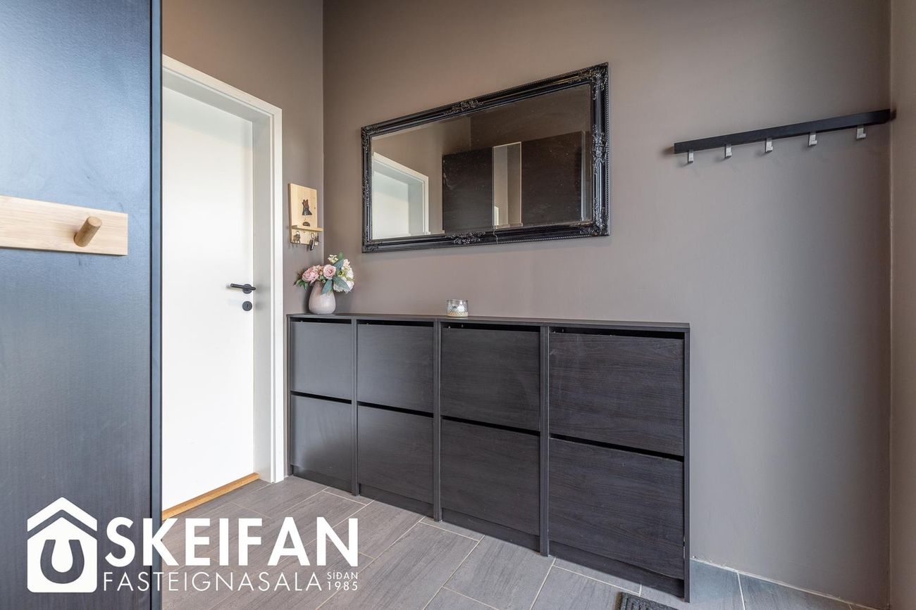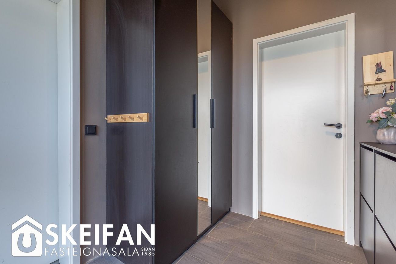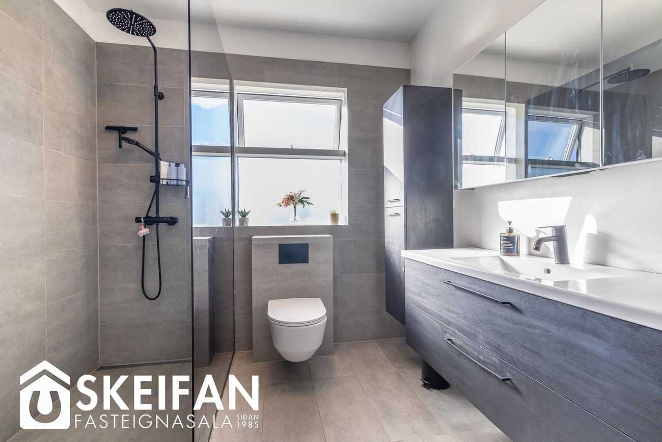 Þrjú svefnherbergi (9,0 fm, 12,8 fm og 9,8 fm) með fataskápum. Eitt herbergi með loftlúgu í geymsluloft.
