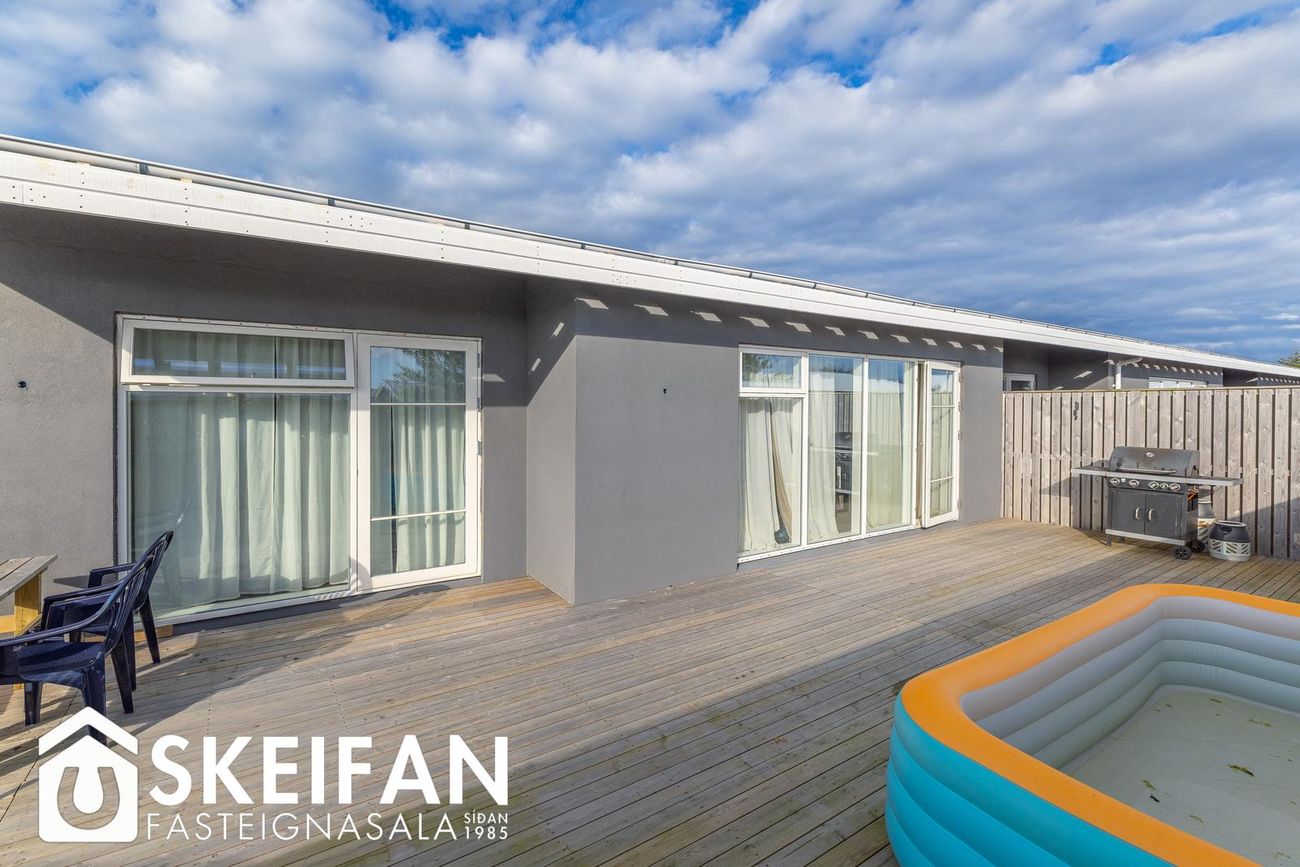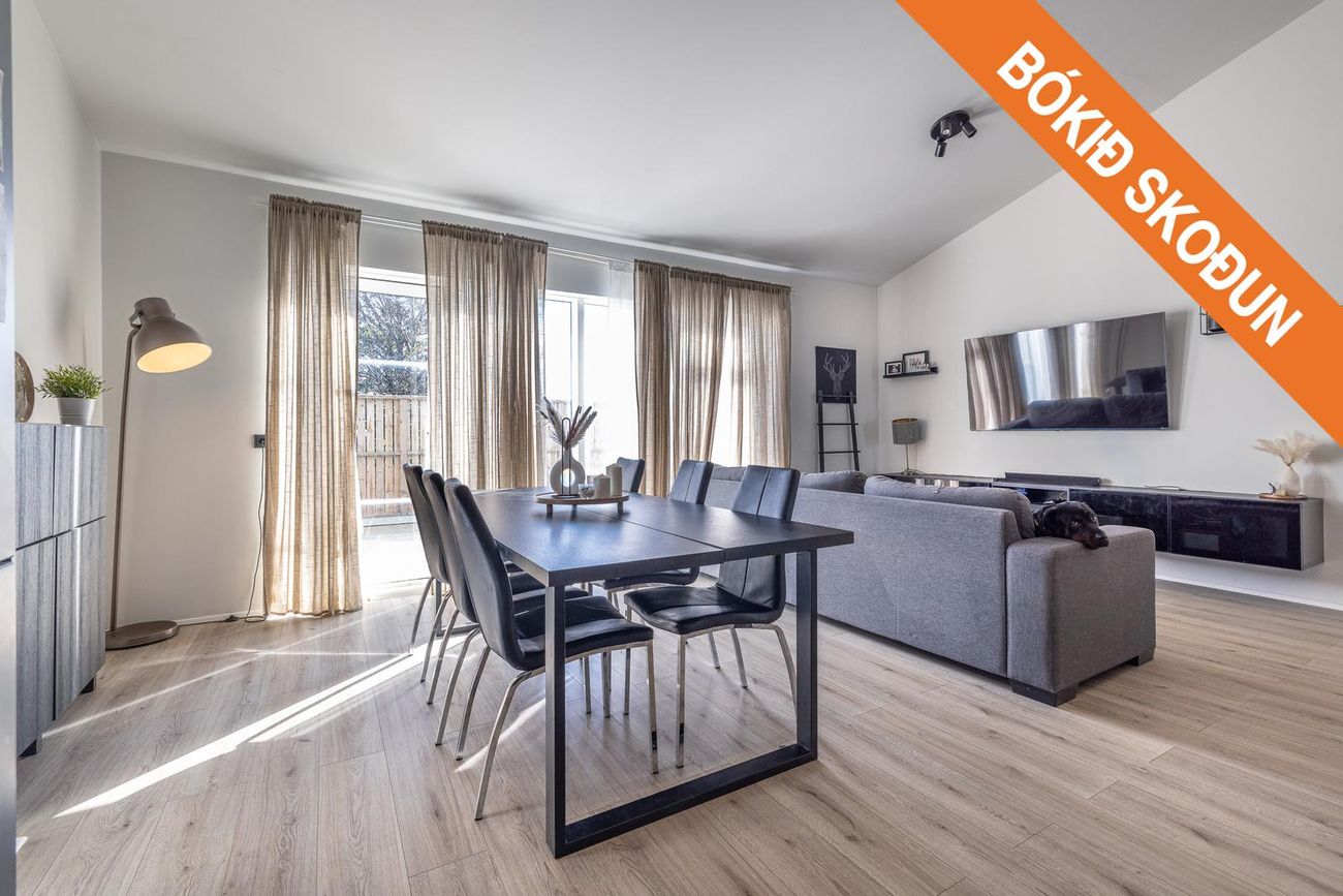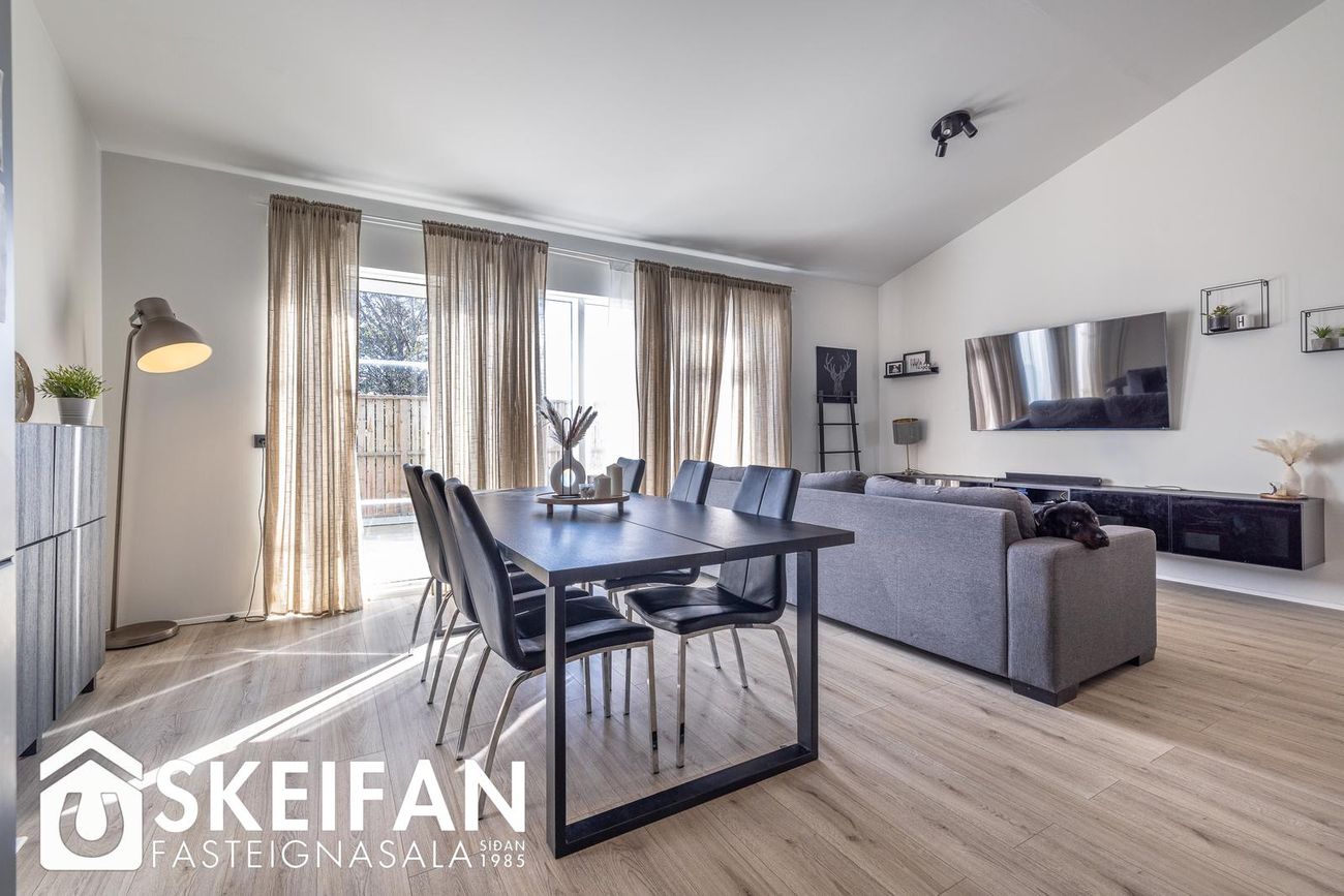 Raðhús í Vogunum með opnu rými sem tengir stofu, borðstofu og eldhús. Útgangur að garði með palli og graslendi.