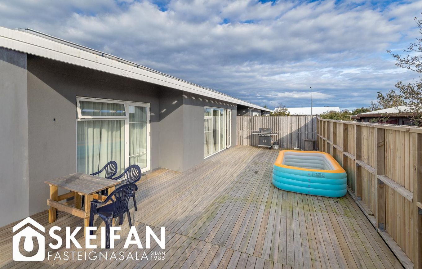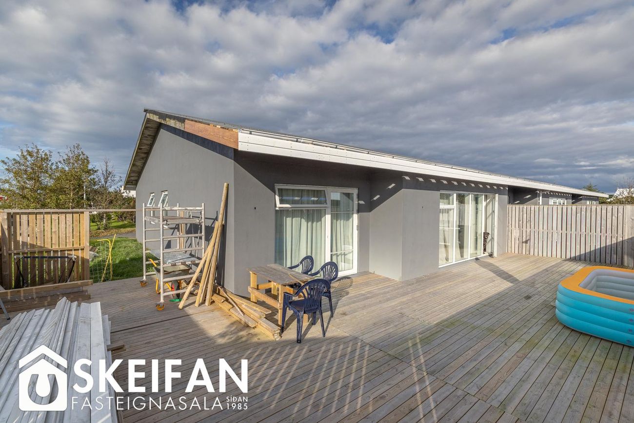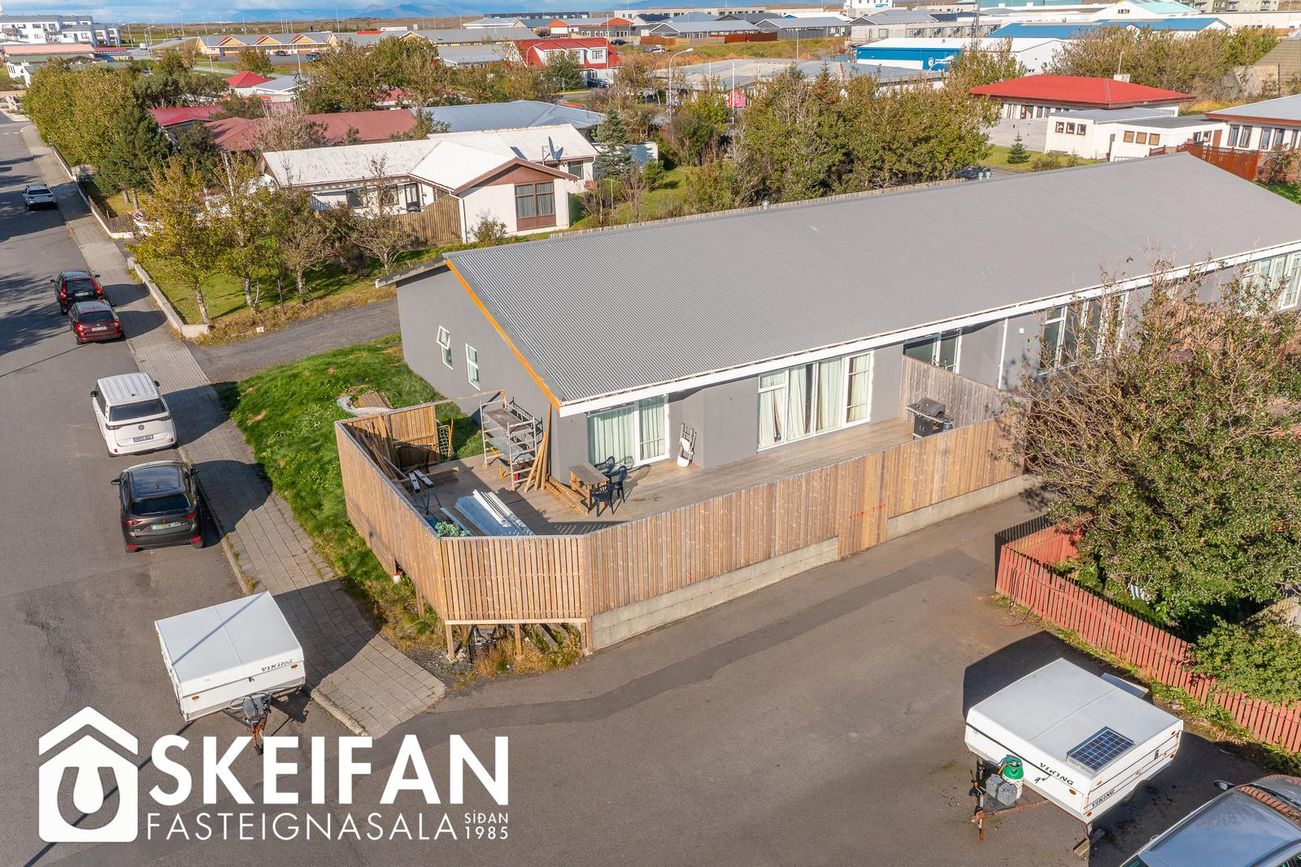 Raðhús í Vogunum með opnu rými sem tengir stofu, borðstofu og eldhús. Útgangur að garði með palli og graslendi.