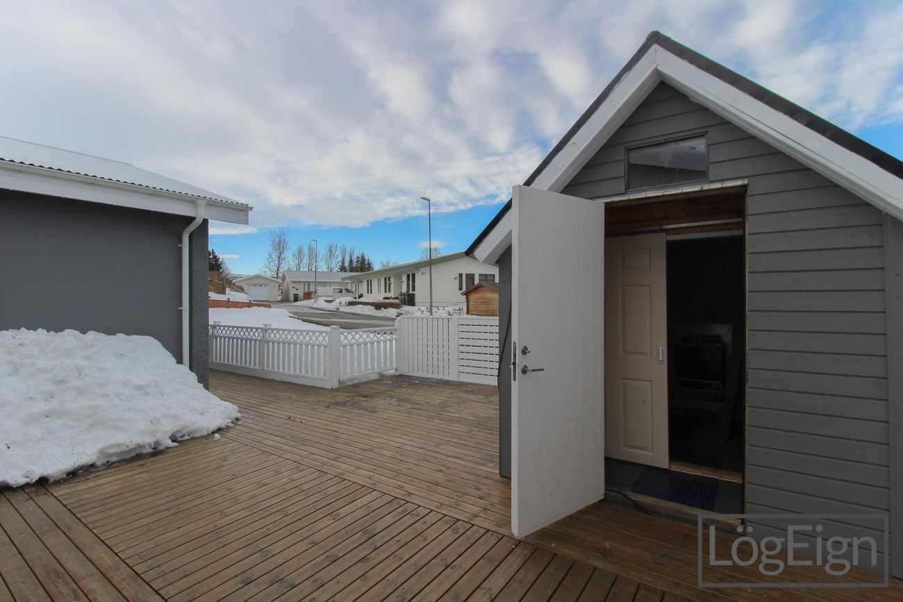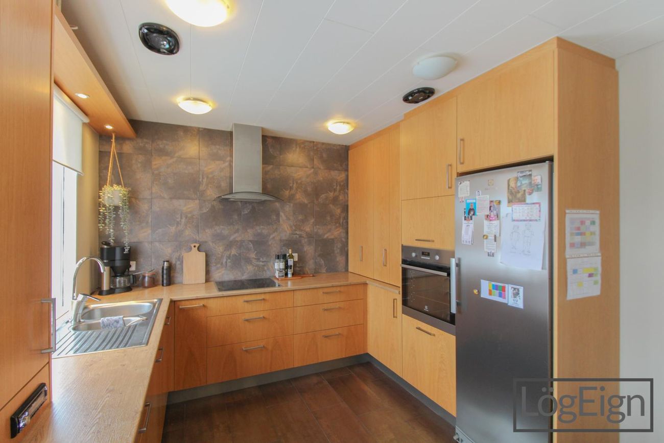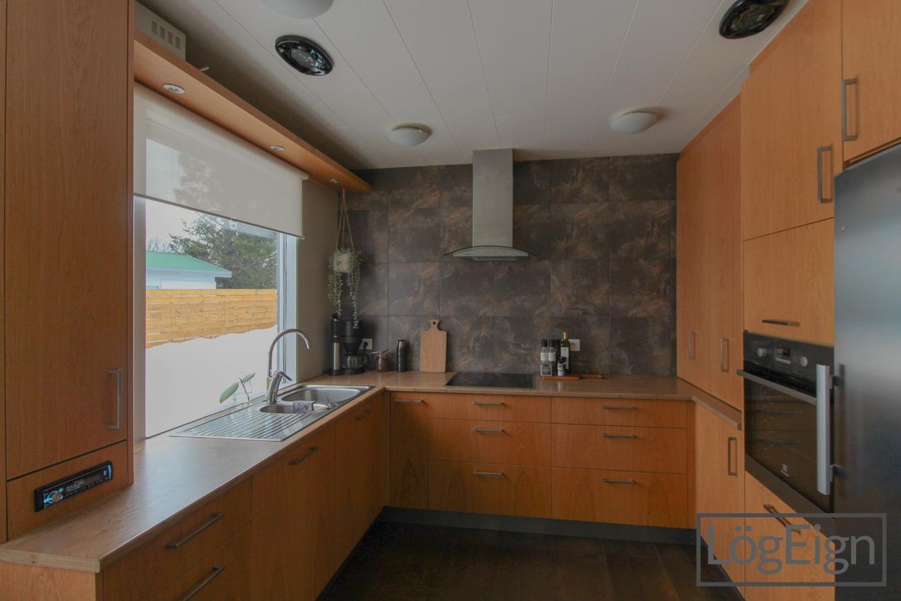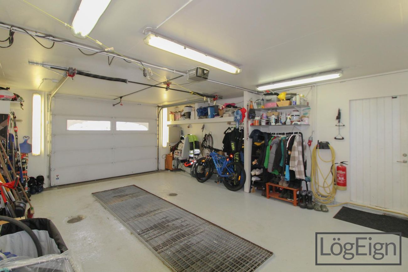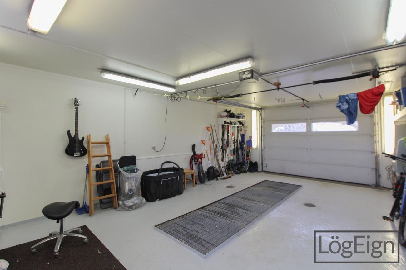 Bílskúr: Er rúmgóður og með rafdrifni samlokuhurð. Bílskúrinn er einnig með grifju og í kringum 17 M² kjallara sem er óskráður.