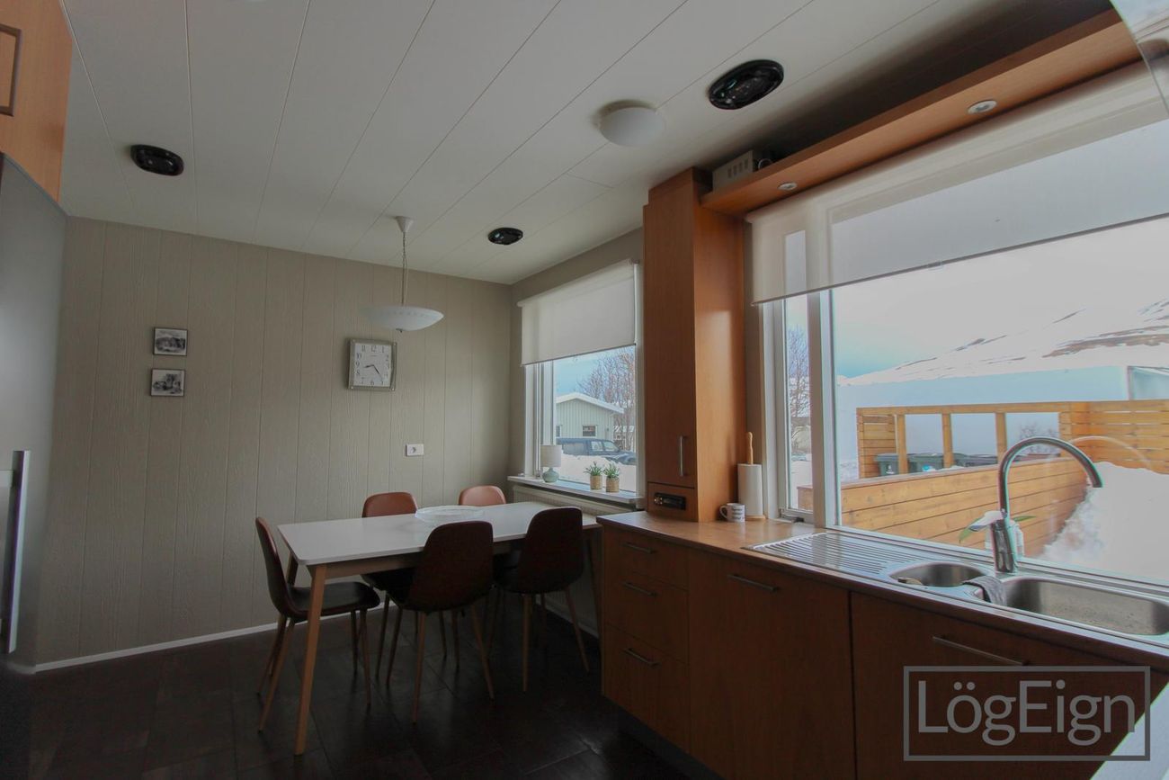 Stofa: stofan er mjög rúmgóð og nýtist bæði sem sjónvarpsstofa og borðstofa. Stórir gluggar sem gefa rýminu góða birtu.
