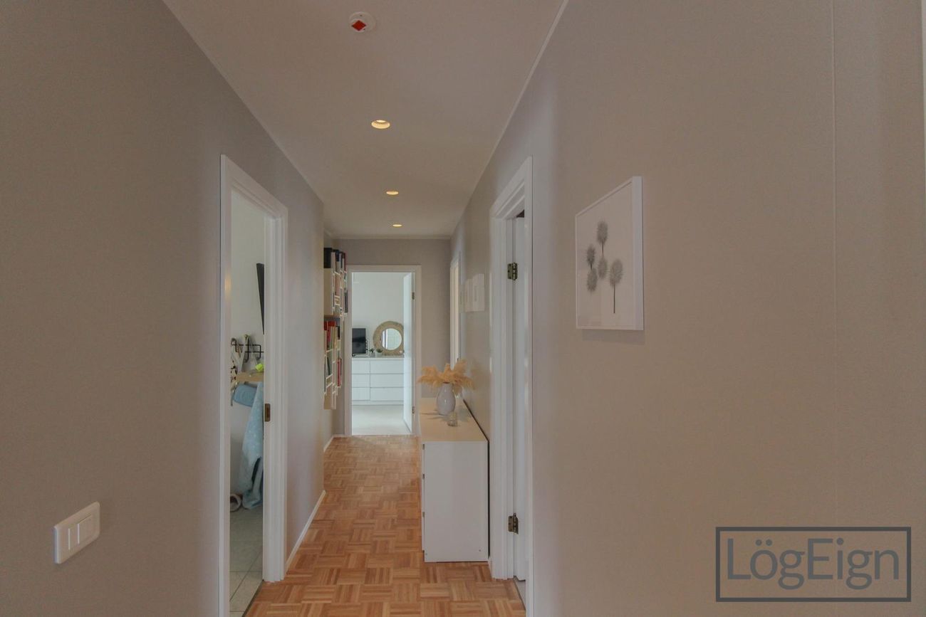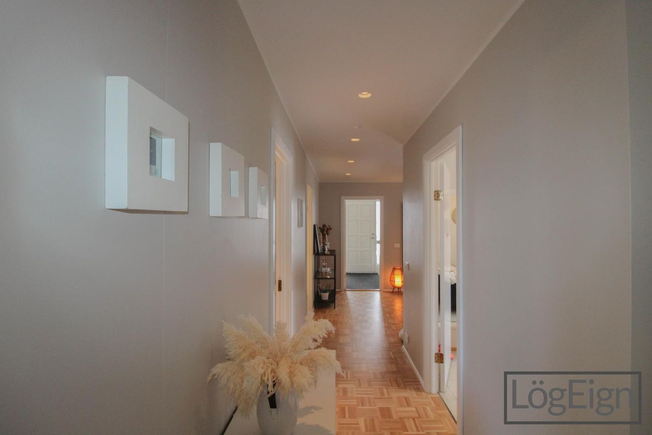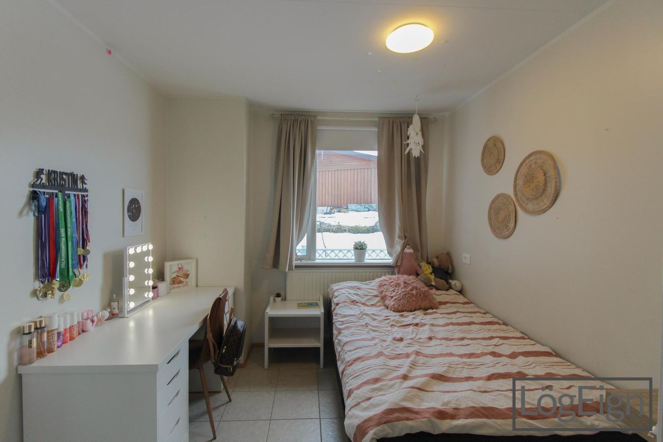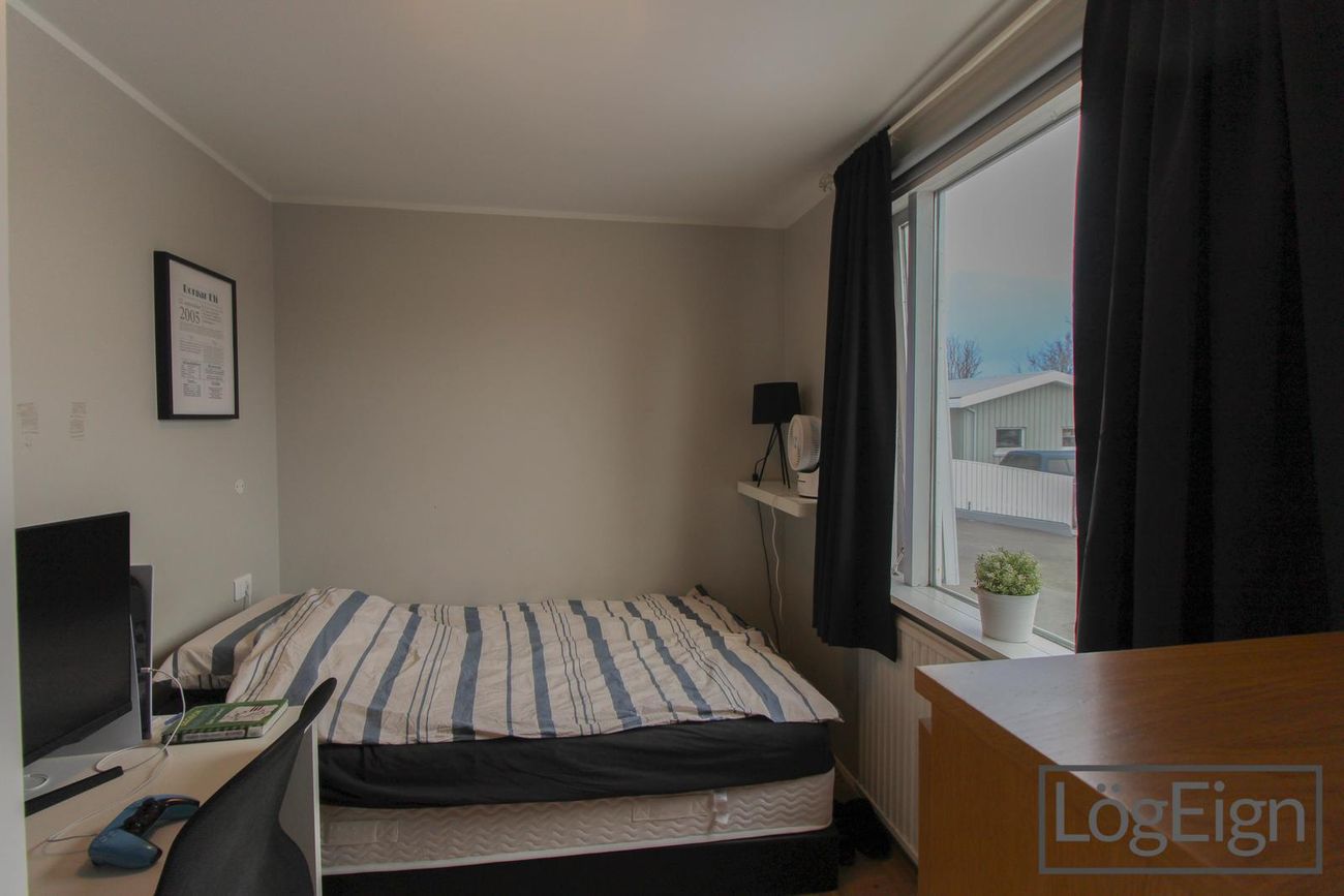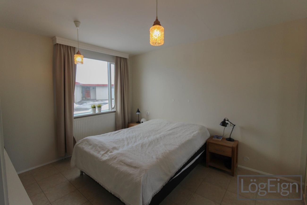 Fjögur svefnherbergi: Eitt svefnherbergi staðsett inn af forstofunni og svo þrjú á herbergisgang. Útgengt er úr einu herbergjanna út í garð og svo er hjónaherbergið með stórum fataskáp.