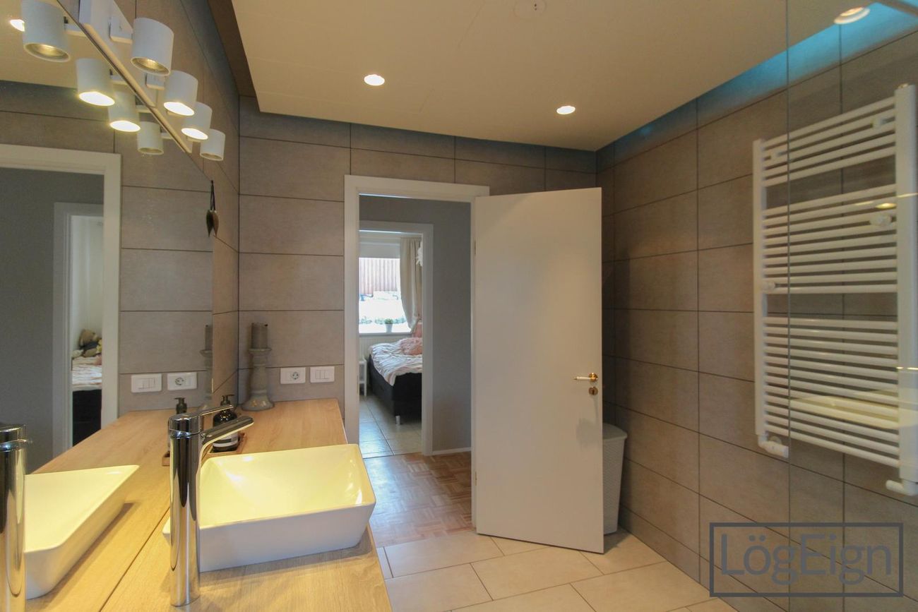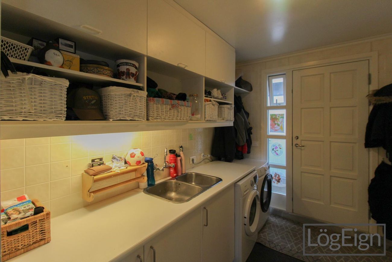 Þvottahús og Geymsla/herbergi: er með hvítri innréttingu sem er bæði með efri og neðri skápum, gert er ráð fyrir þvottavél í innréttingunni. Inn af þvottahúsinu er geymsla með glugga þar sem er einnig lúga upp á háaloft. Útgengt er úr þvottahúsinu og er þá bílskúrinn við hliðin á hurðinni.