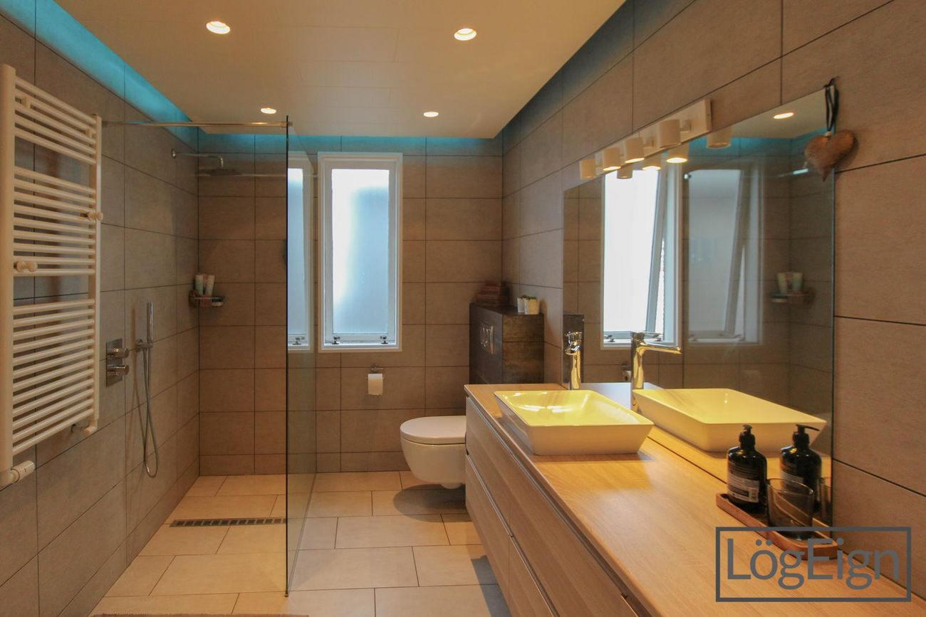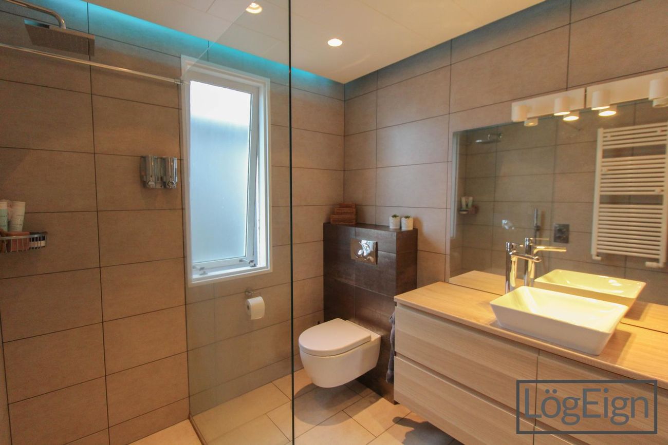 Baðherbergi: Er flísalagt í hólf og gólf, "walk in" sturta, handklæðaofn, viðarlituð innrétting og vegghengd wc