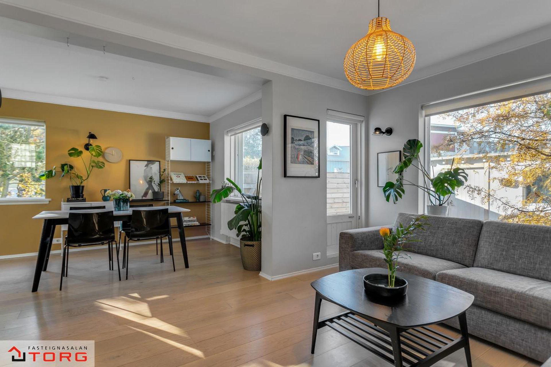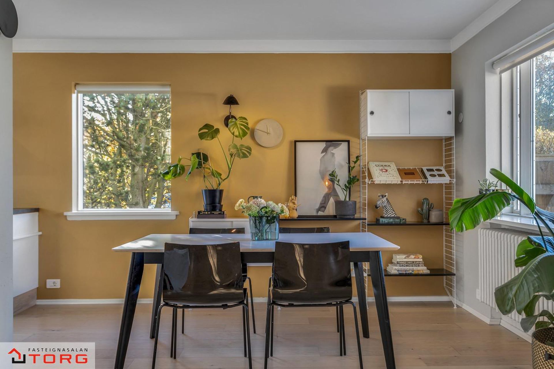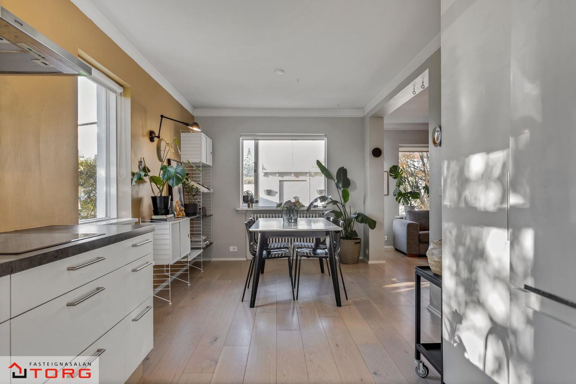 Borðstofa - Á milli setustofu og eldhúss er björt og falleg borðstofa í sérrými. Harðparket á gólfi og gluggar á tvær hliðar.