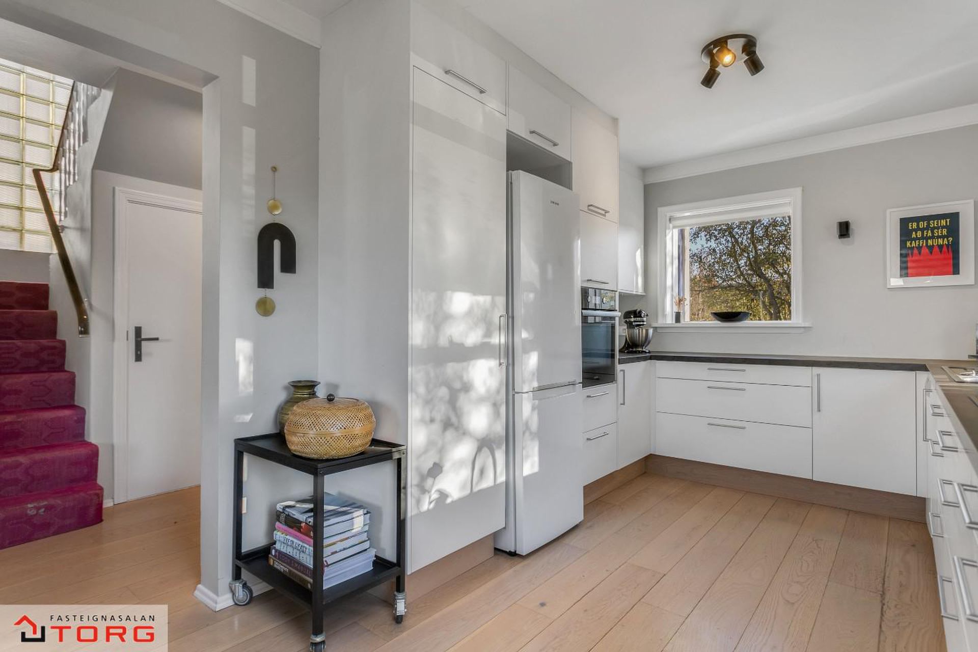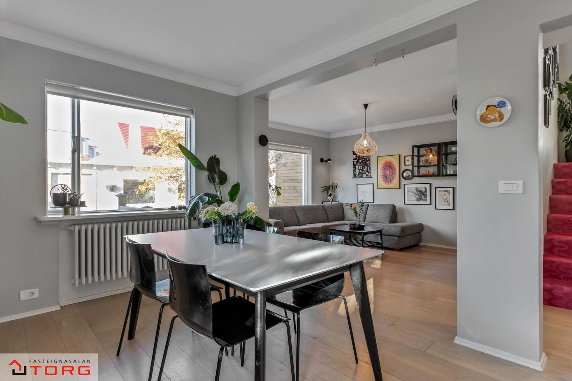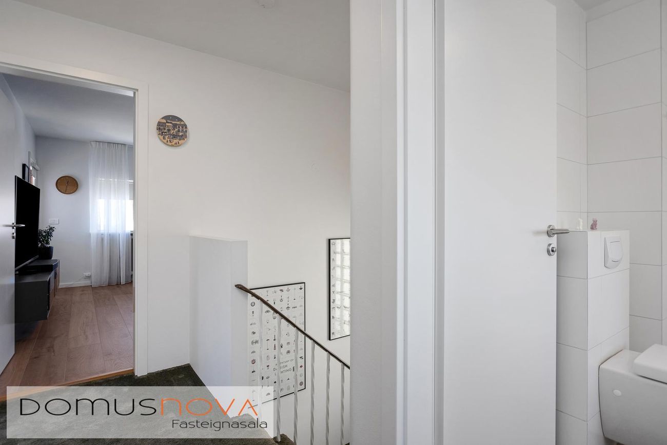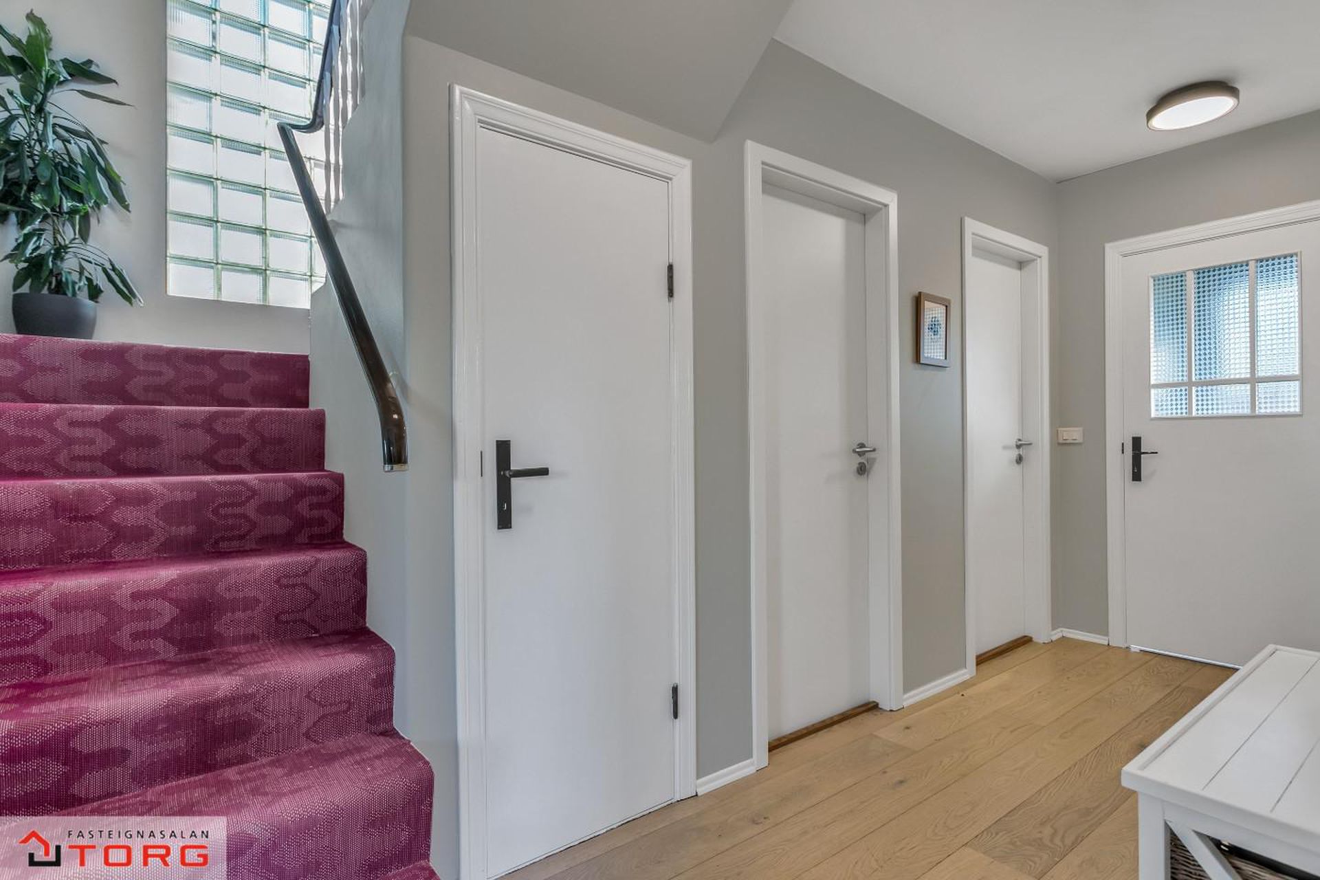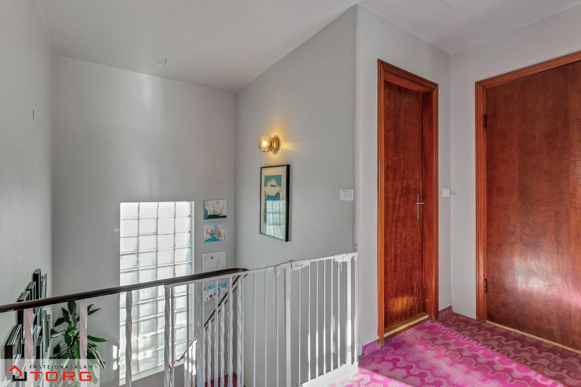 Efri hæð: 2.hæð Gengið er upp steyptan stiga með fallegu teppi á þrepum og stórum glugga sem hleypir fallegri birtu inn í stigarýmið.
