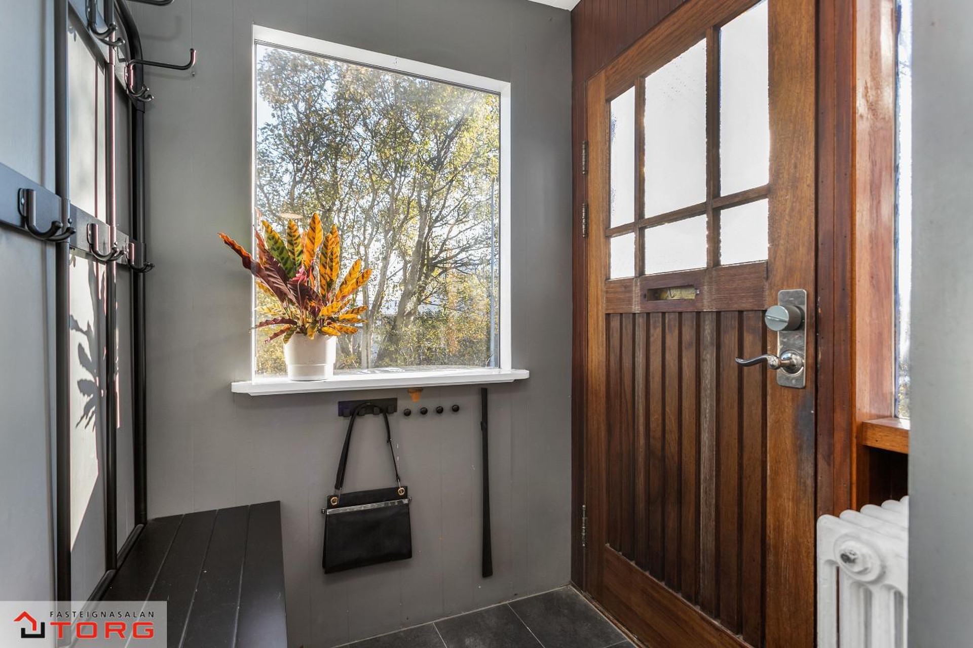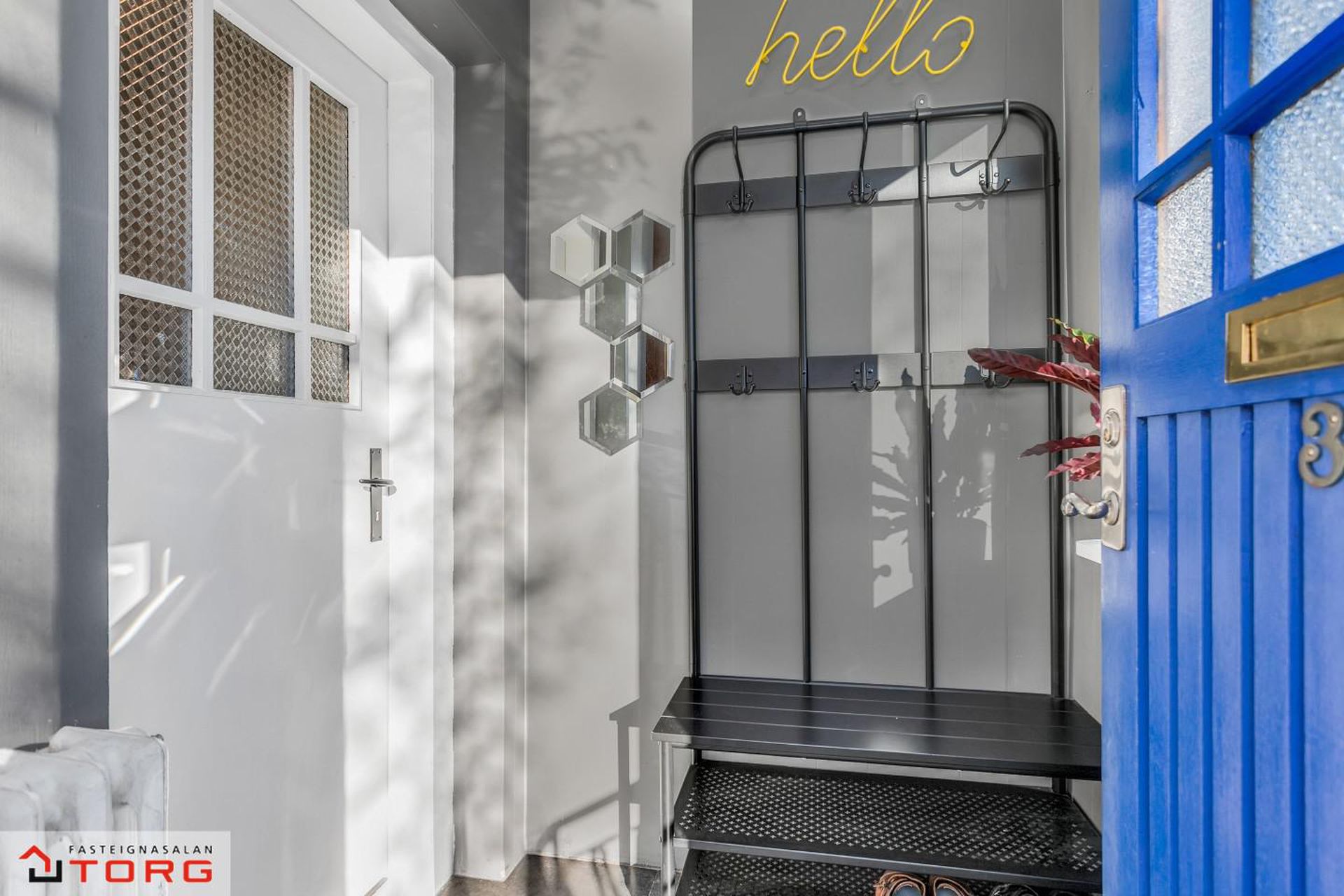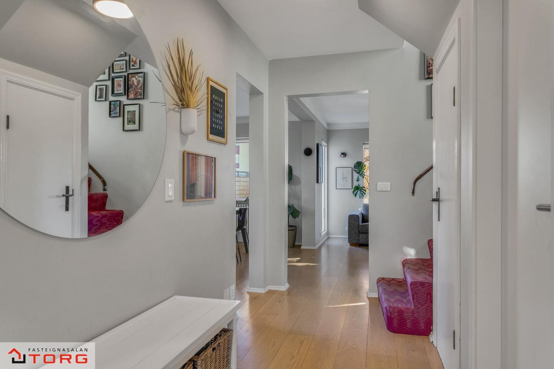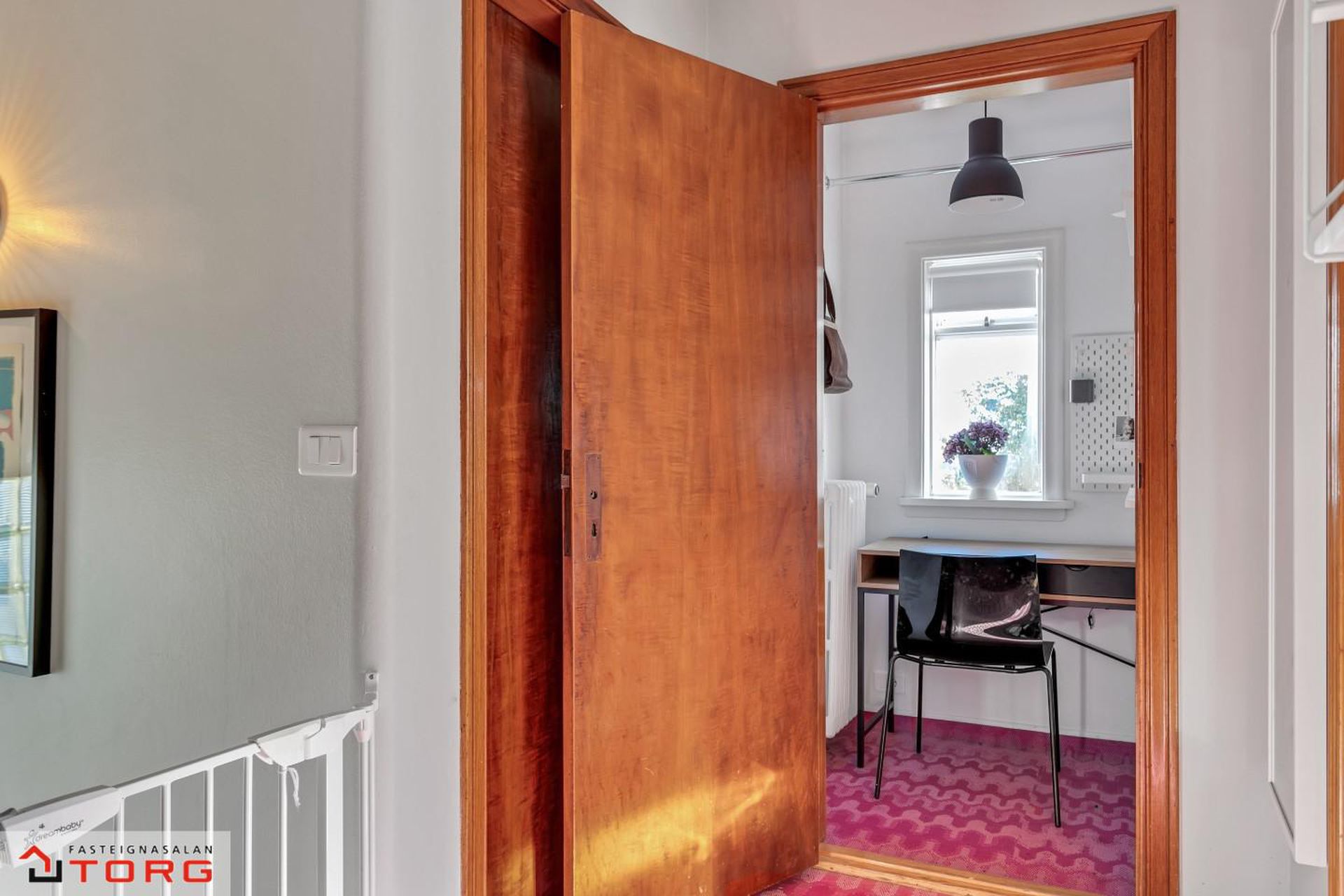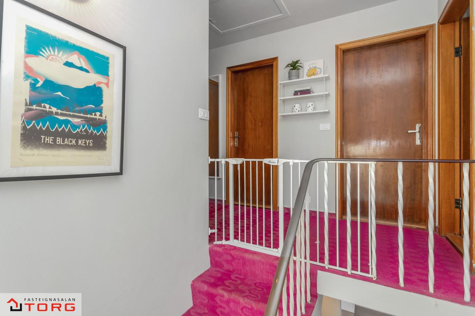 Efri hæð: 2.hæð Gengið er upp steyptan stiga með fallegu teppi á þrepum og stórum glugga sem hleypir fallegri birtu inn í stigarýmið.