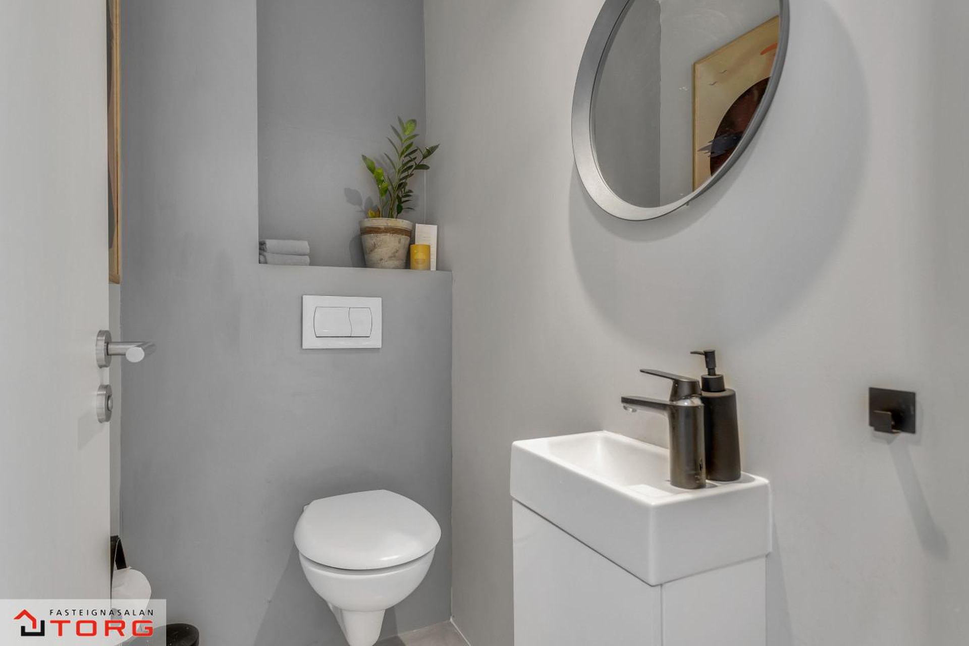 Snyrting - Við hlið þvottahúss á gangi er snyrting með upphengdu innbyggðu salerni á vegg og innréttingu með handlaug.