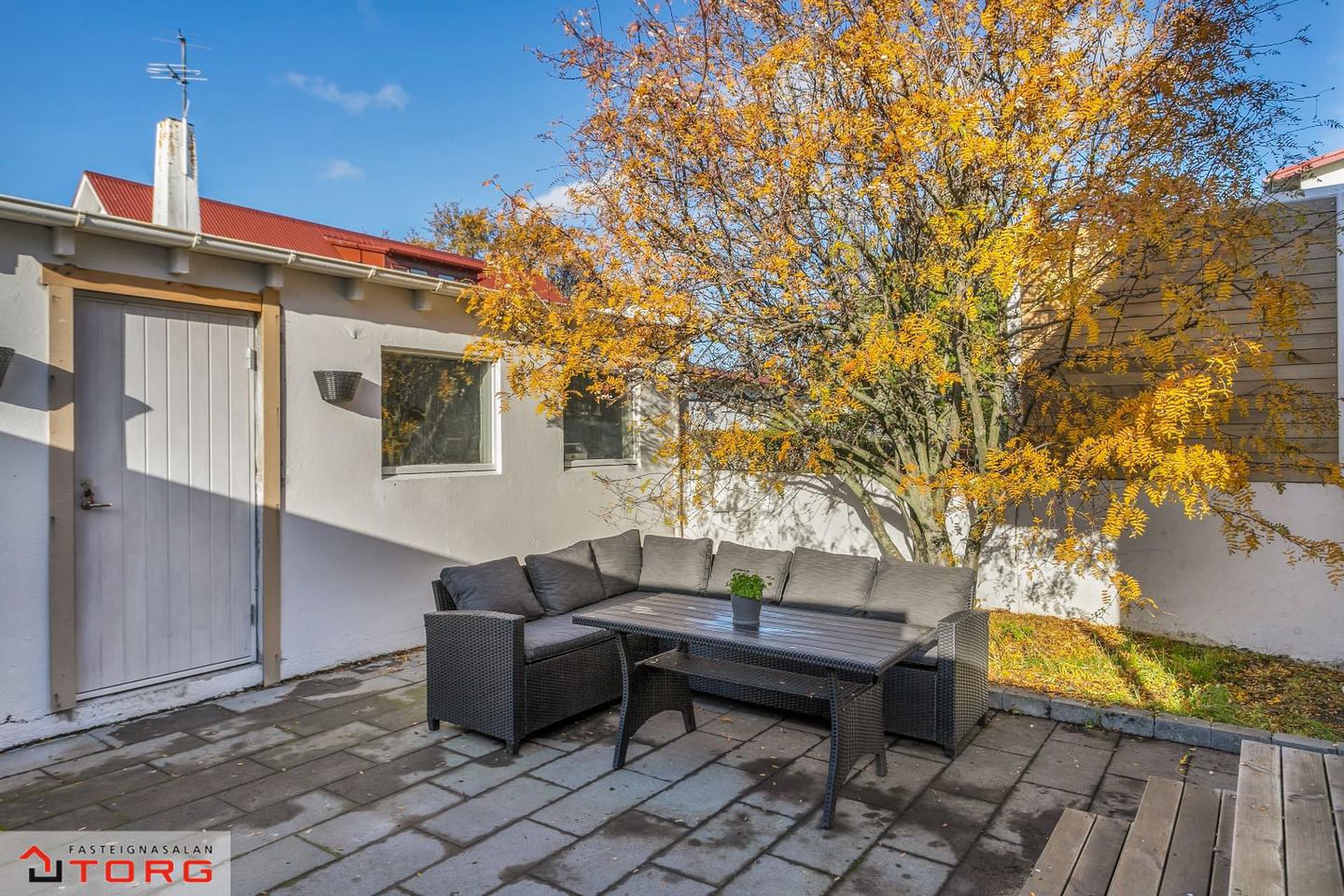 Stofa - Stofan er í rými í framhaldi af borðstofu. Harðparket á gólfi. Útgengt er út í garð sem leiðir niður á skjólgóða verönd með sólpalli, heitum potti og skjólveggjum.