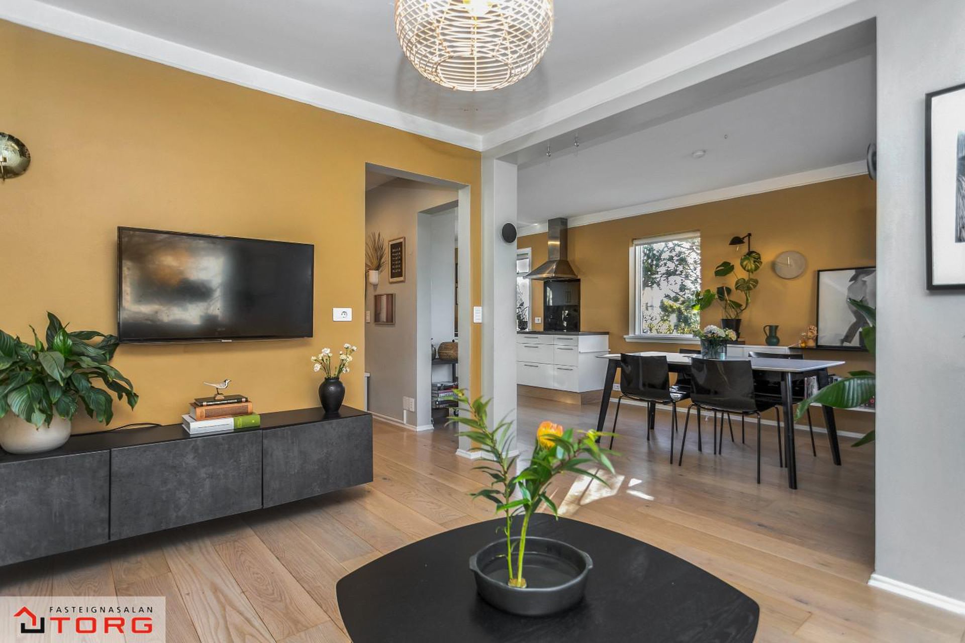 Eldhús og stofa - Saman í opnu rými er stofa, borðkrókur og eldhúsinnrétting. Gólf er málað.