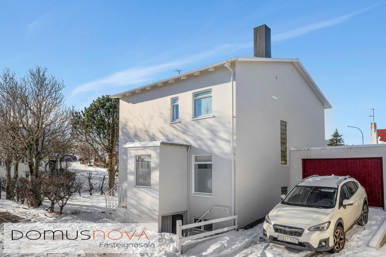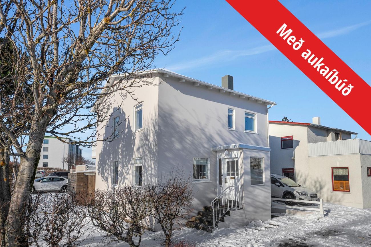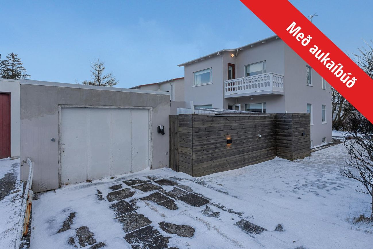 Fasteignamat 2026 er 119.000.000.- kr. Byggingarár er 1958. Bílskúr er byggður 1964.Góðar leigutekjur af aukaíbúð - Núverandi leigjendur vilja leigja áfram ef áhugi er fyrir því hjá kaupendum.--- Seljendur geta afhent eignina fljótlega að loknum kaupsamningi ---Húsið er steypt á þremur hæðum ásamt steyptum sérstæðum bílskúr sem tengist húsinu. Eignin er skráð einbýlishús. Aaleignin er á tveimur hæðum og aukaíbúð með sérinngangi í kjallara. Hjá aðalinnganginum eru 2-3 bílastæði og einnig er stæði fyrir framan bílskúrinn.