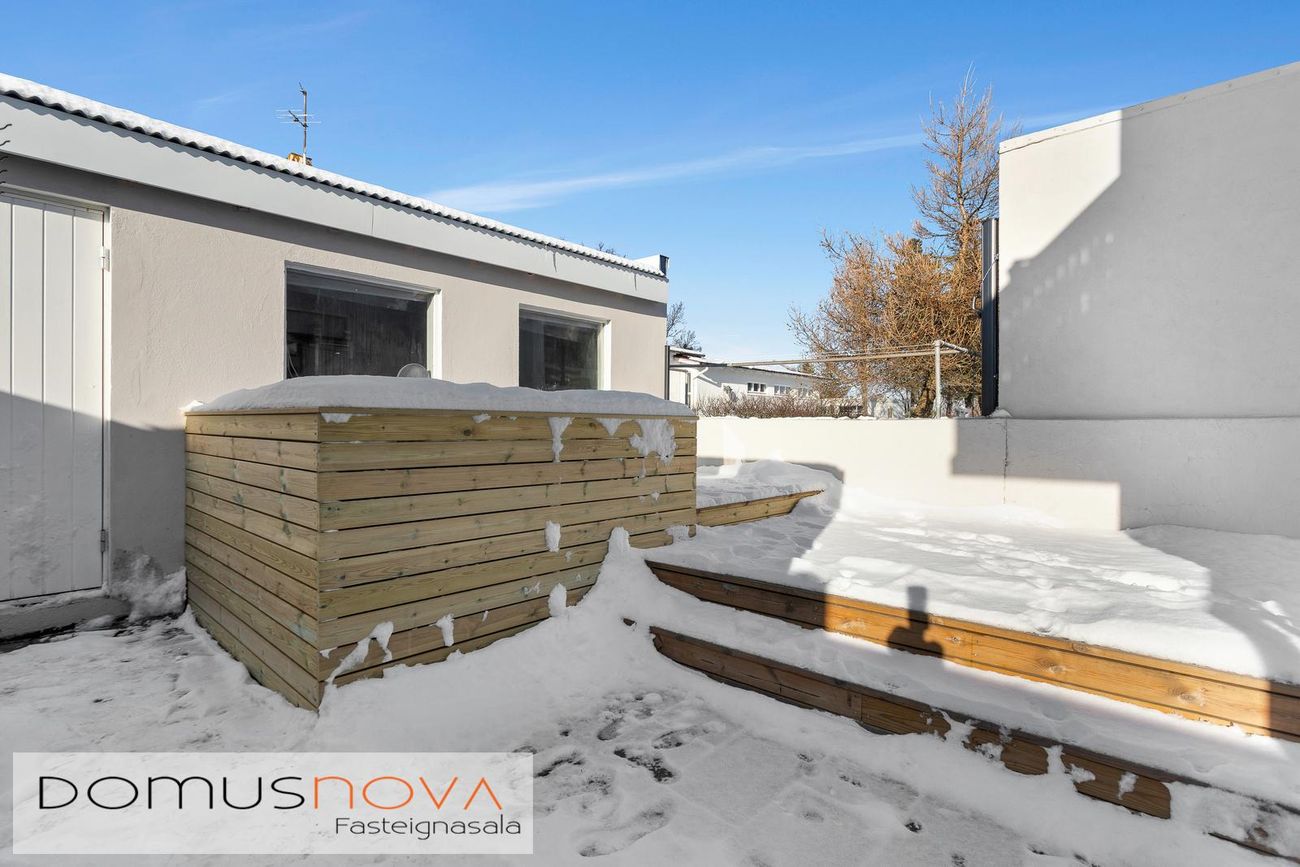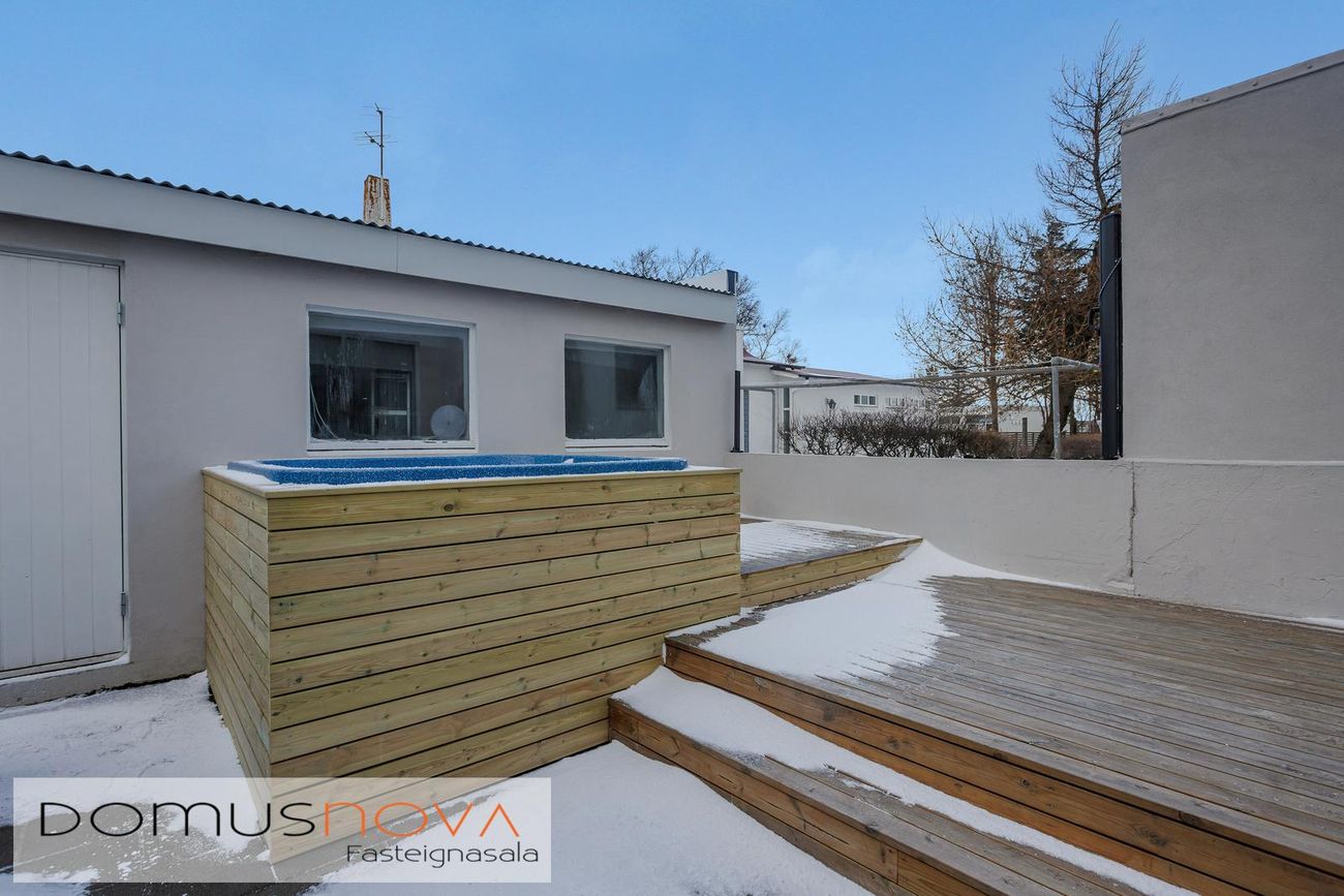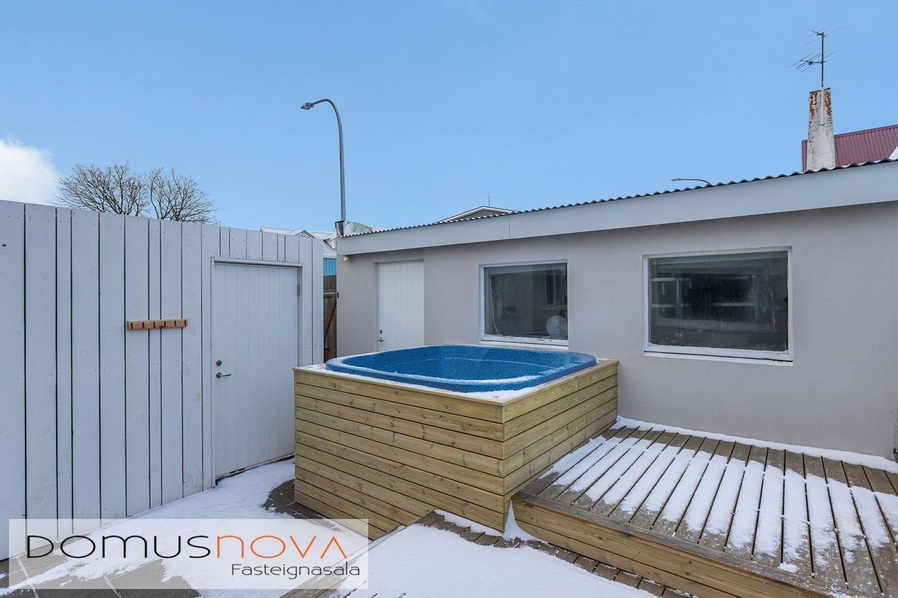 Aukaibúð: skiptist í anddyri, þvottaherbergi, sér sturturými, salerni, eldhús, stofu og svefnherbergi. Auðvelt er að opna aftur á milli aðaleignar og aukaíbúðar ef þörf er á. Aflokuð verönd með skjólveggjum og heitum potti er á milli húss og bílskúrs.