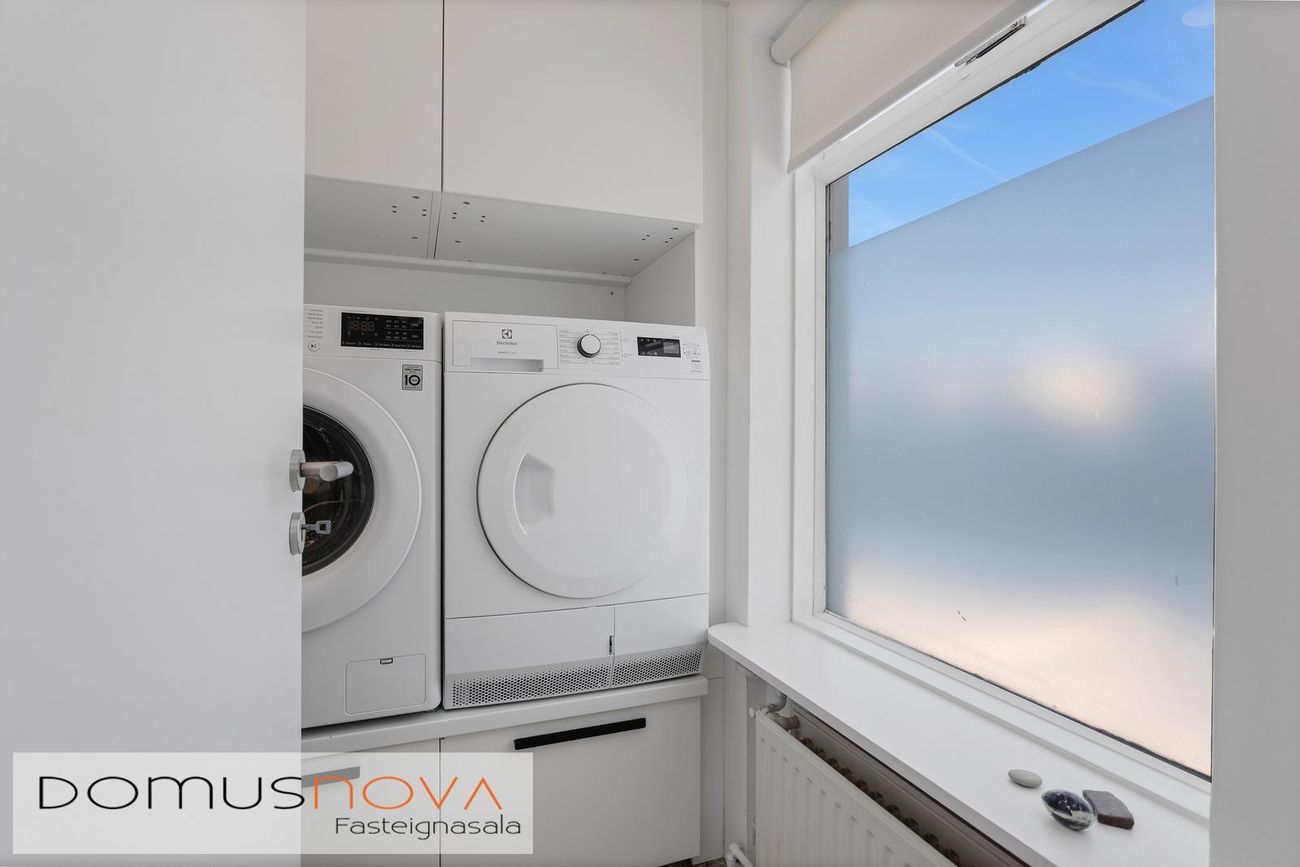 Þvottaherbergi - Inn af forstofu er búið að útbúa sér þvottahús á hægri hönd. Góð innrétting með rými fyrir þvottavél og þurkara í góðri vinnuhæð og gott skápapláss, skolvaskur og opnanlegur gluggi.