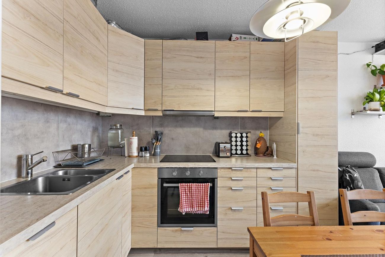 Eldhús er opið við stofu, viðarinnréttingu, ofn, helluborði og viftu. Parket á gólfi.