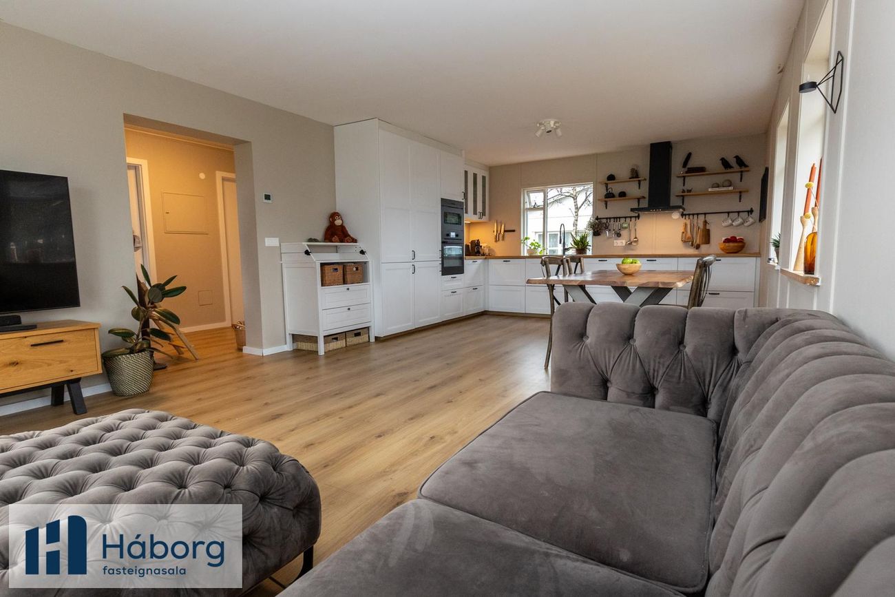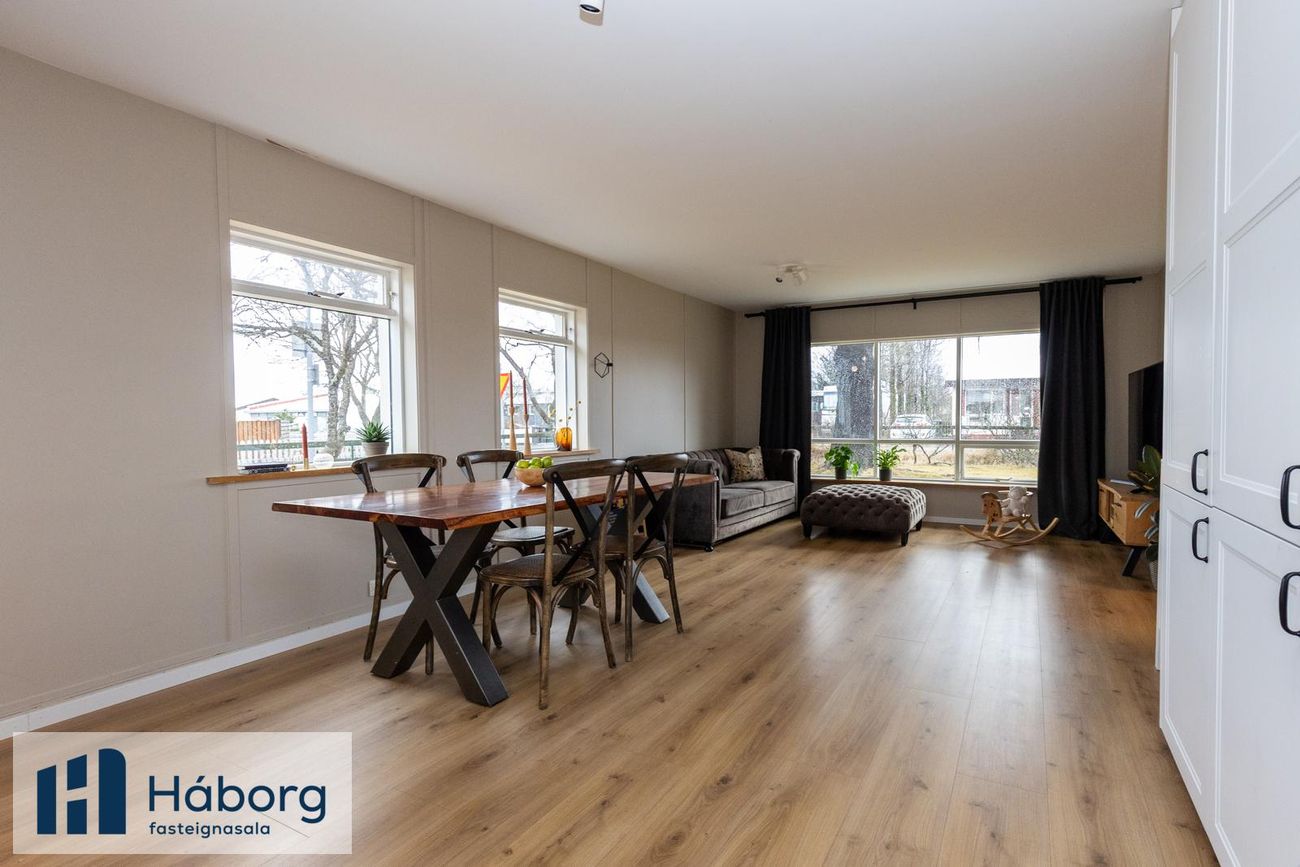 Alrými er bjart og fallegt, það samanstendur af eldhúsi, borðstofu og stofu.