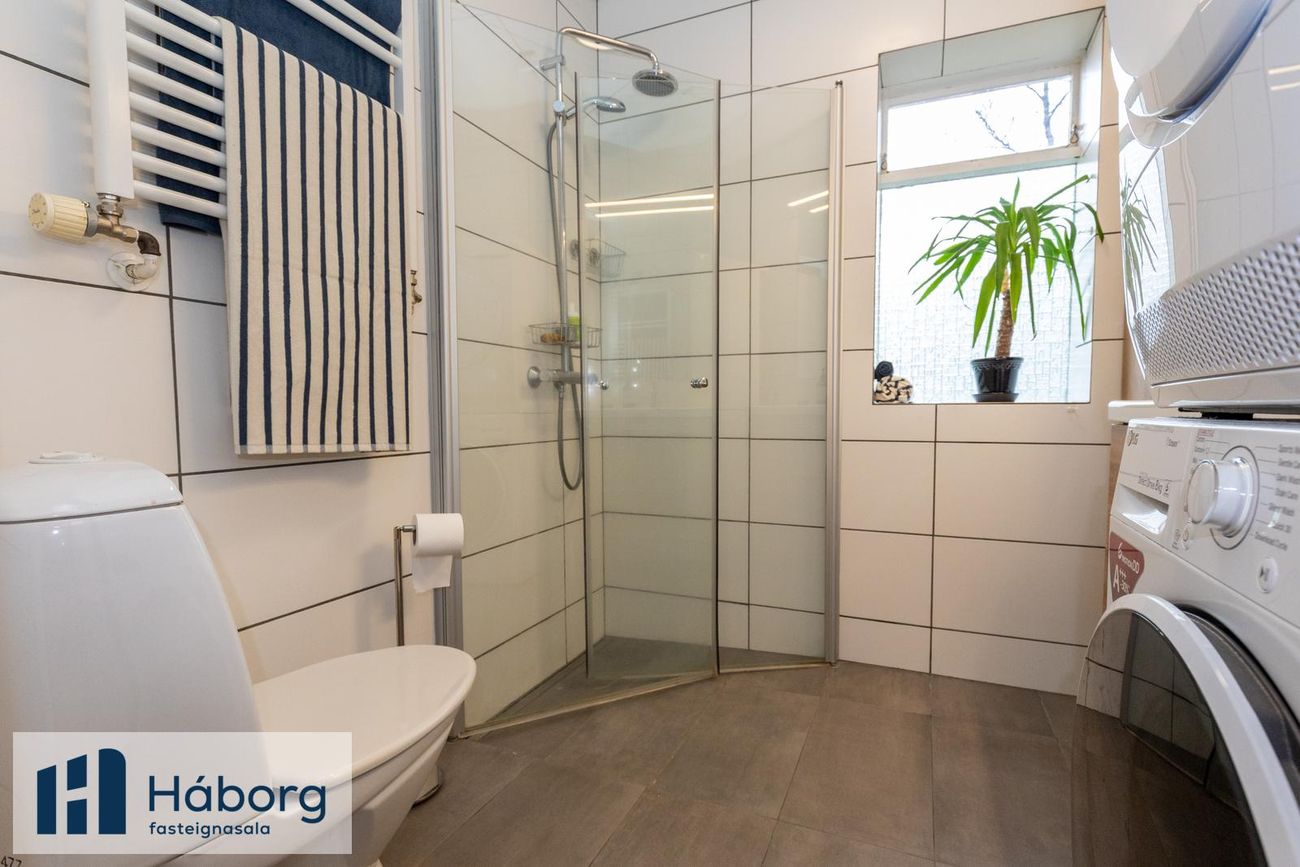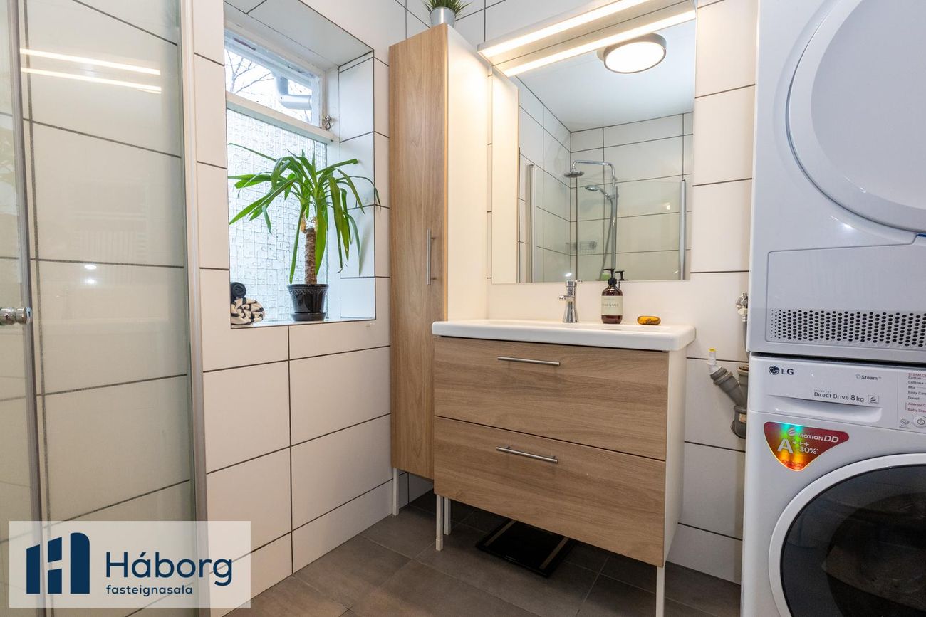 Baðherbergi er flísalagt í hólf og gólf, þar er hvít innrétting með speglaskáp, sturta og þvottaaðstaða.