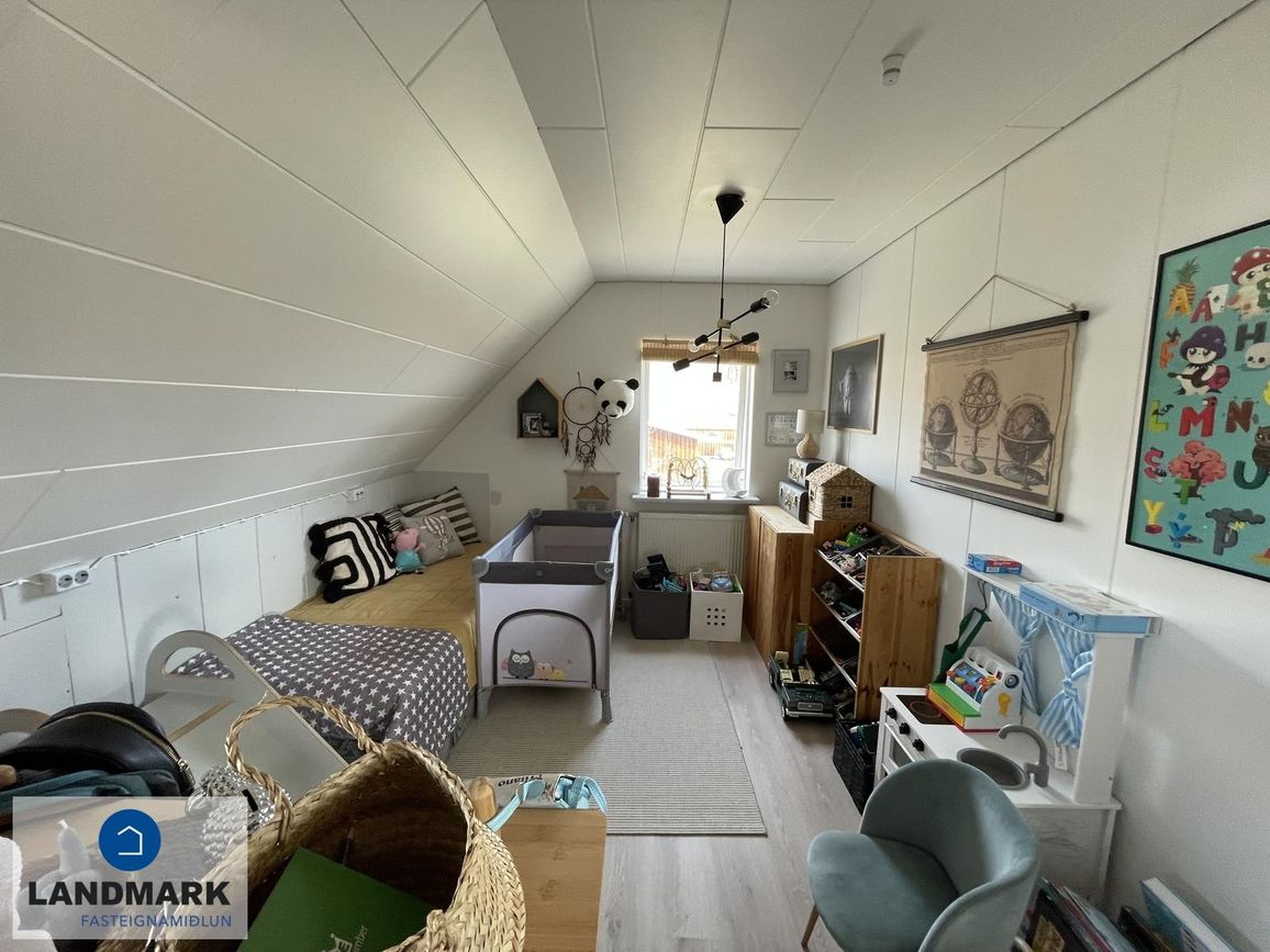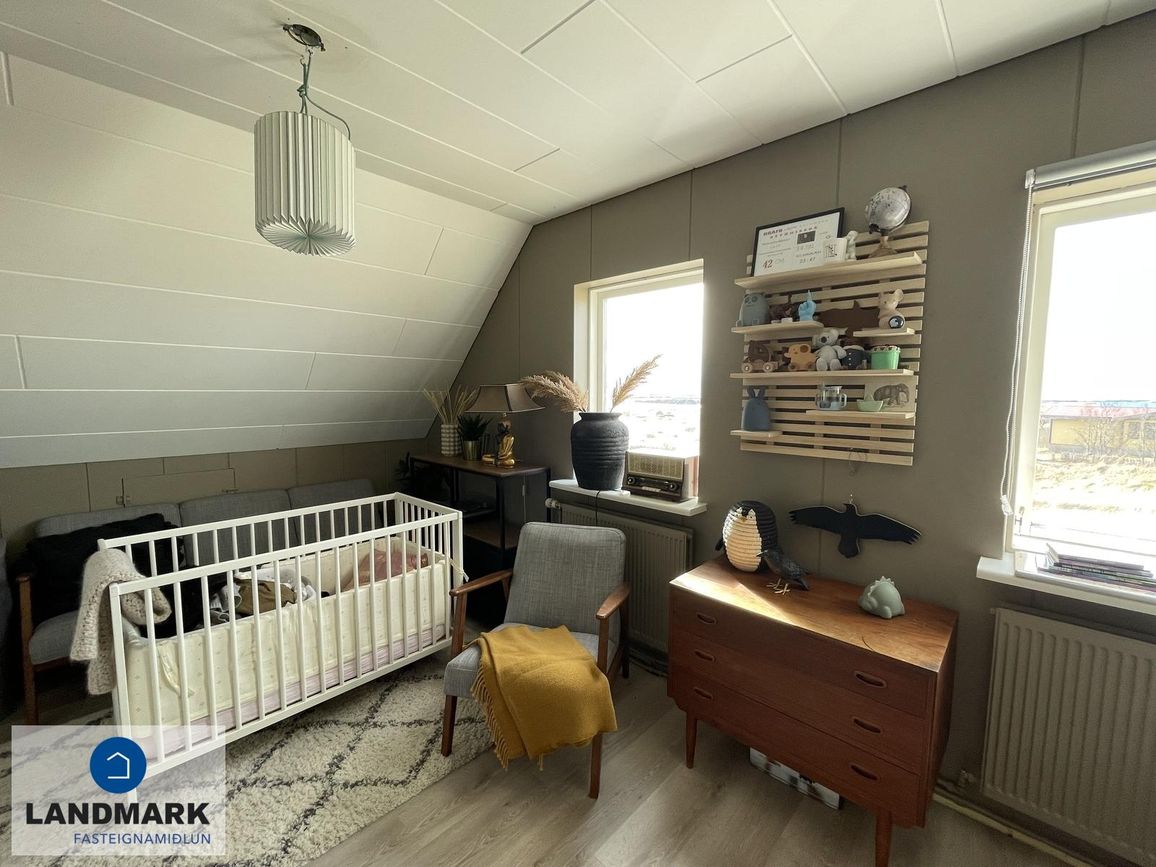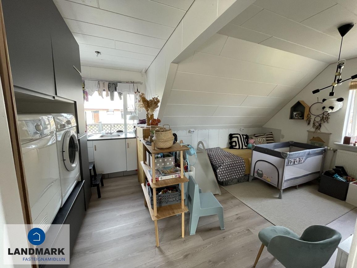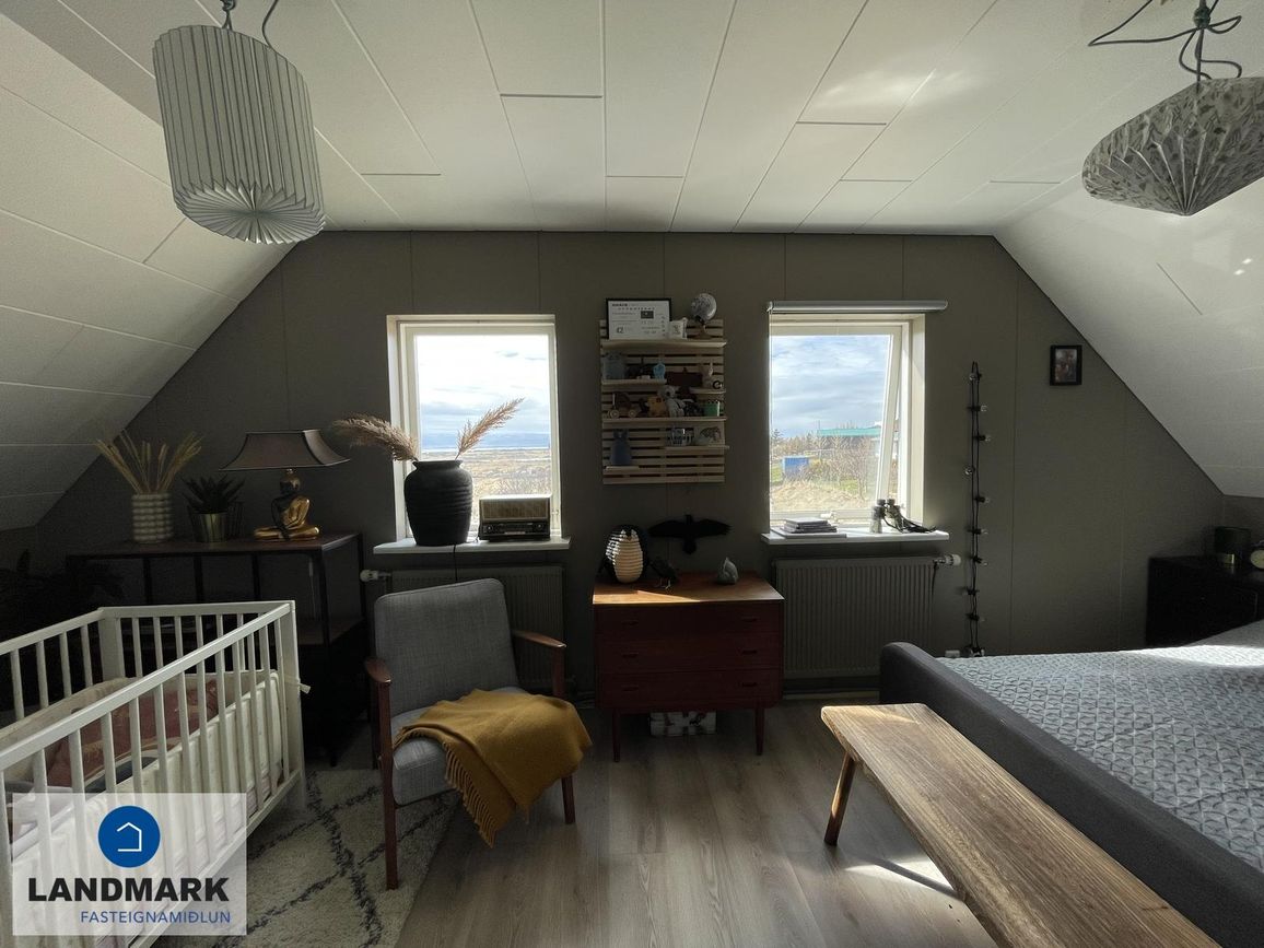 Efri hæð 96,8 fm: Timburstigi úr forstofu á aðalhæð upp á efri hæð hússins, nýlegt harðparket á efri hæð. Þrjú svefnherbergi, þar af er eitt herbergið mjög stór með fataskápum Baðherbergi með flísum á gólfi, sturtuklefa og opnanlegum glugga. Opið þvottahús með nýlegri innréttingu fyrir þvottavél og þurrkara, vaskur með skápum undir. Útgengt út á svalir.