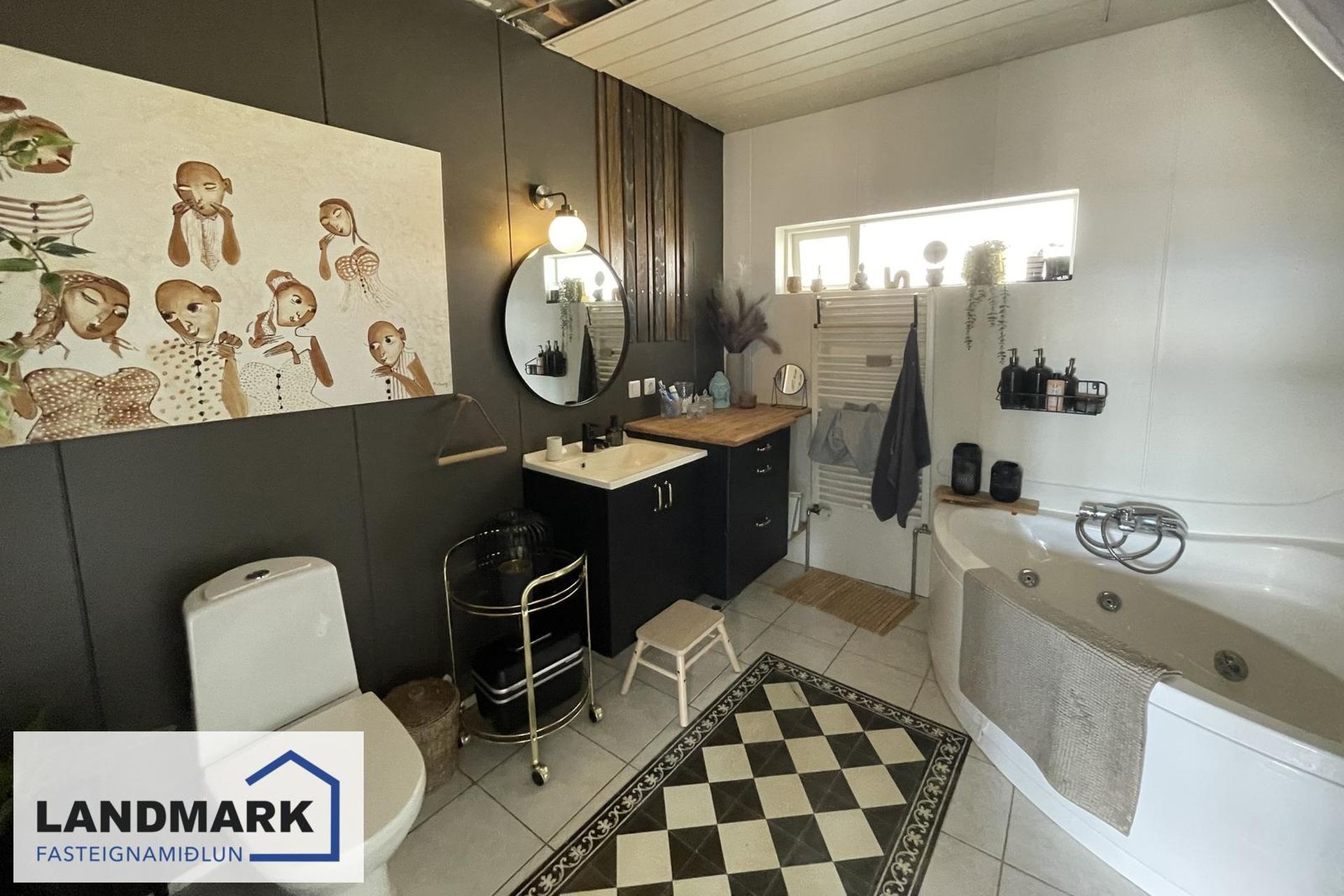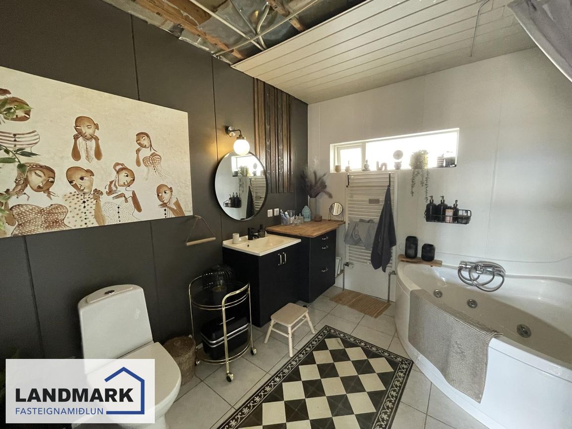 Aðalhæð: Stórt baðherbergi með hornbaðkari og handklæðaofni. Efri hæð: Baðherbergi með sturtu. Kjallari: Baðherbergi með baðkari.