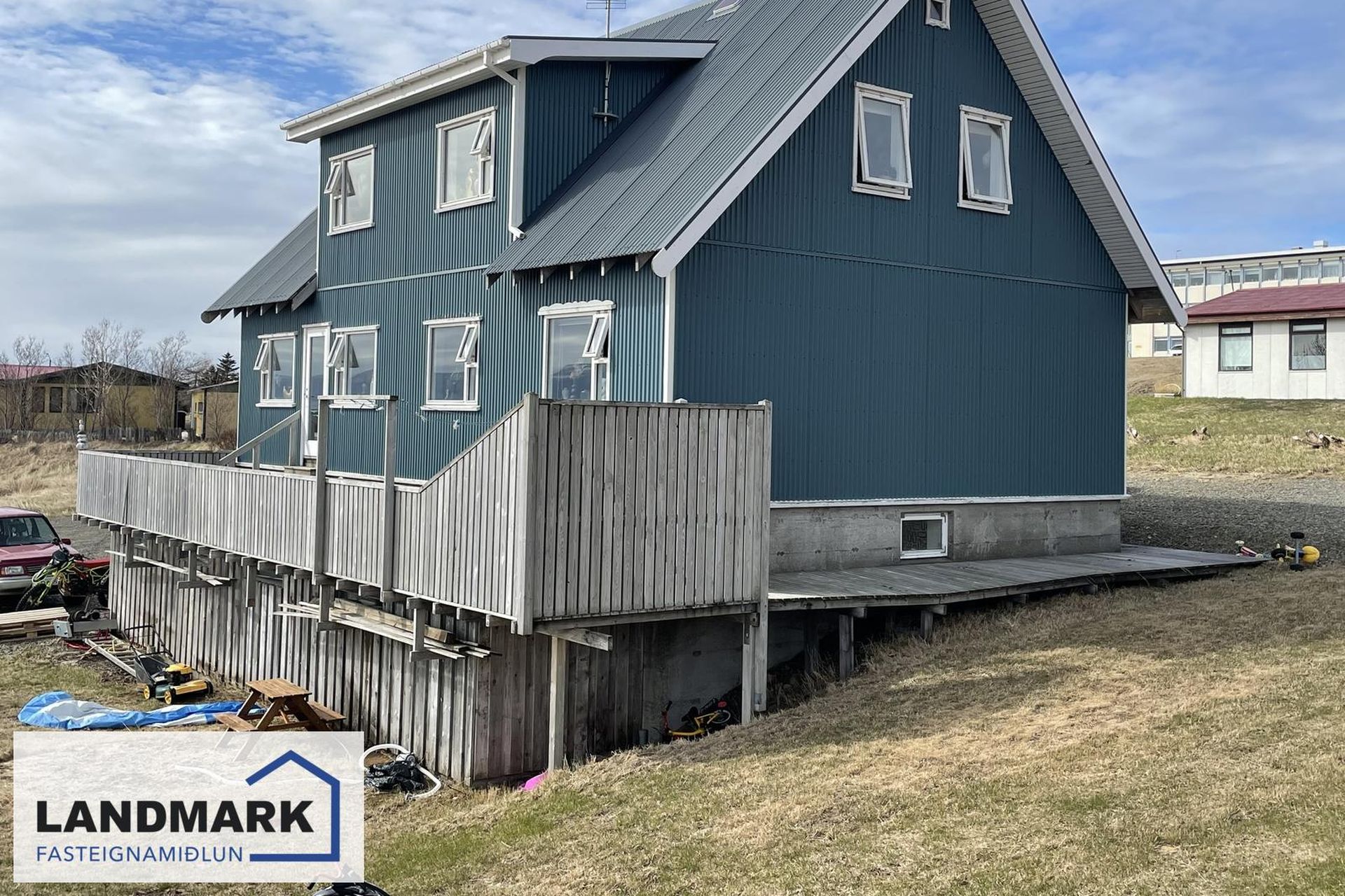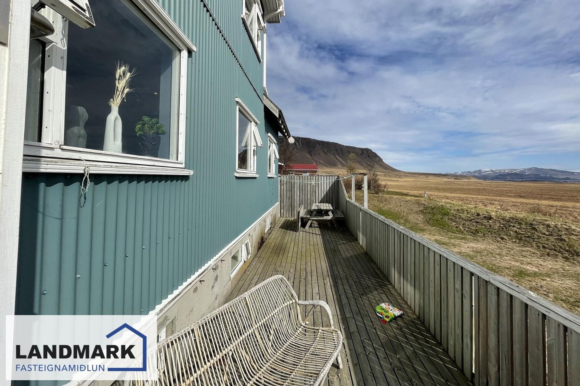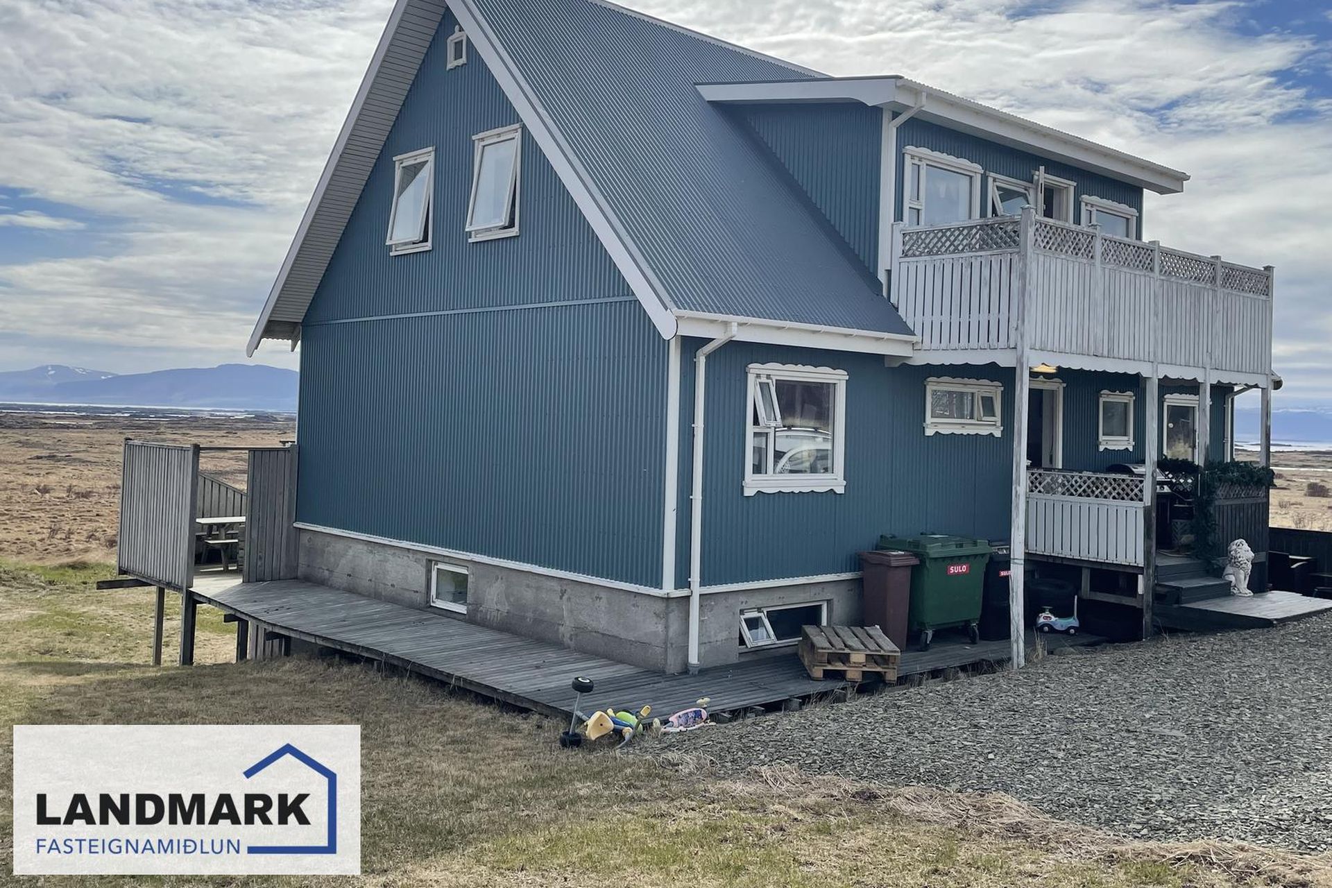 Timburverönd á aðalhæð og svalir á efri hæð.