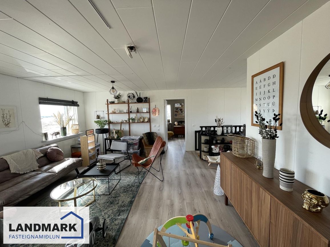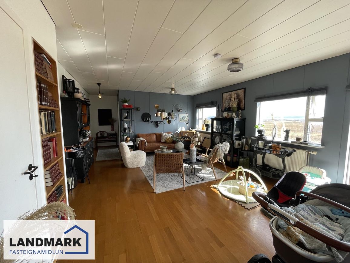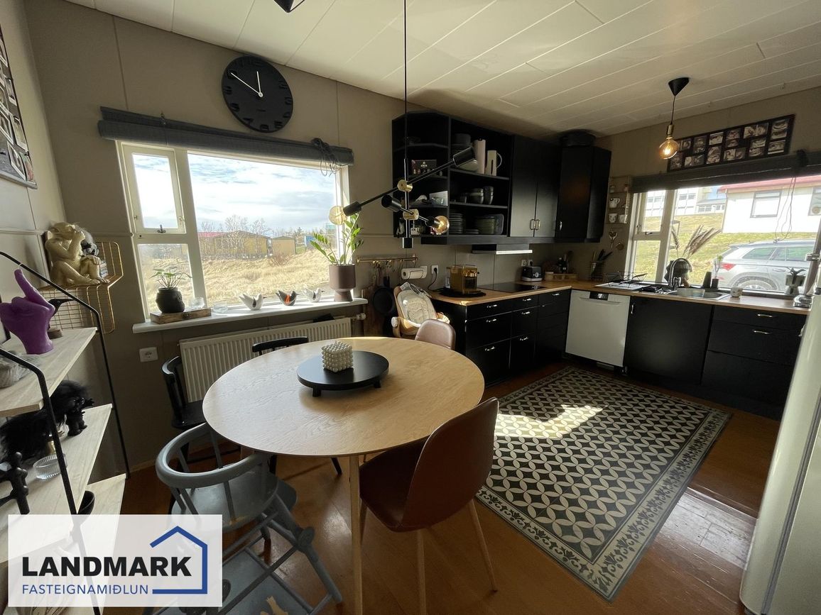 Steypð fyrsta hæð, timburhæðir. Parketgólf, flísalögð gólf og keramik borðplötur.