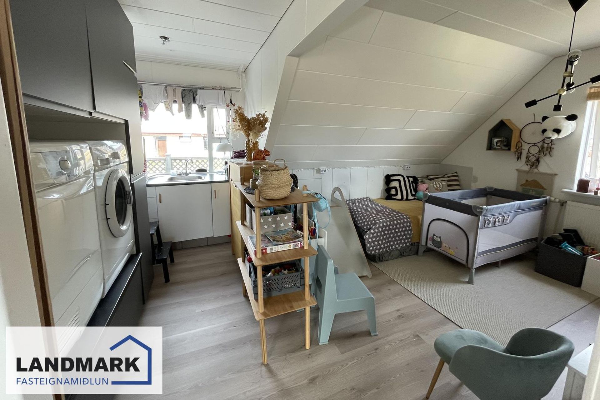 Opið þvottahús á efri hæð með nýlegri innréttingu fyrir þvottavél og þurrkara.
